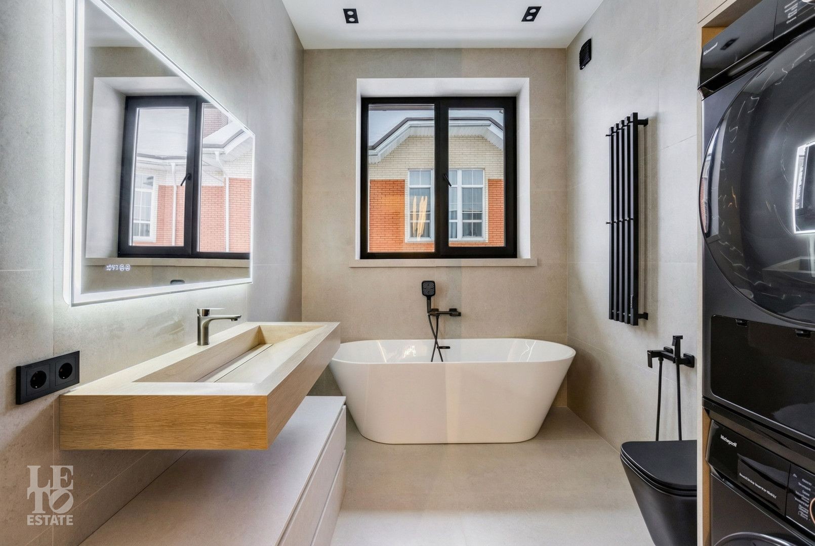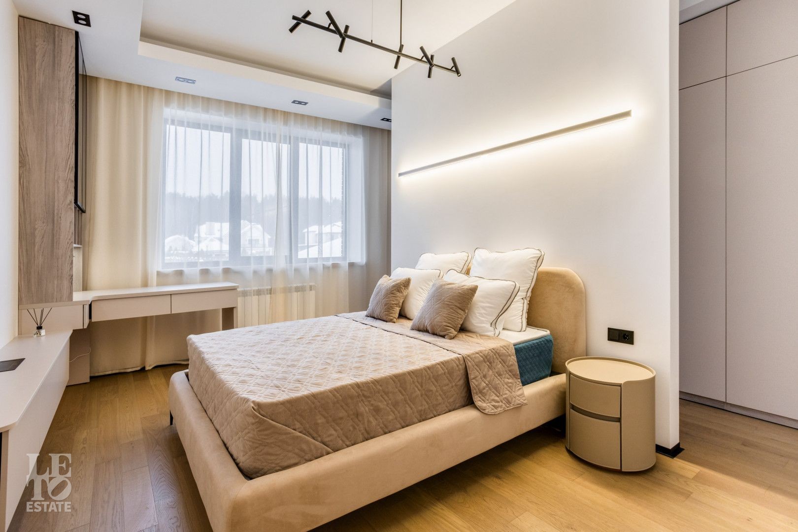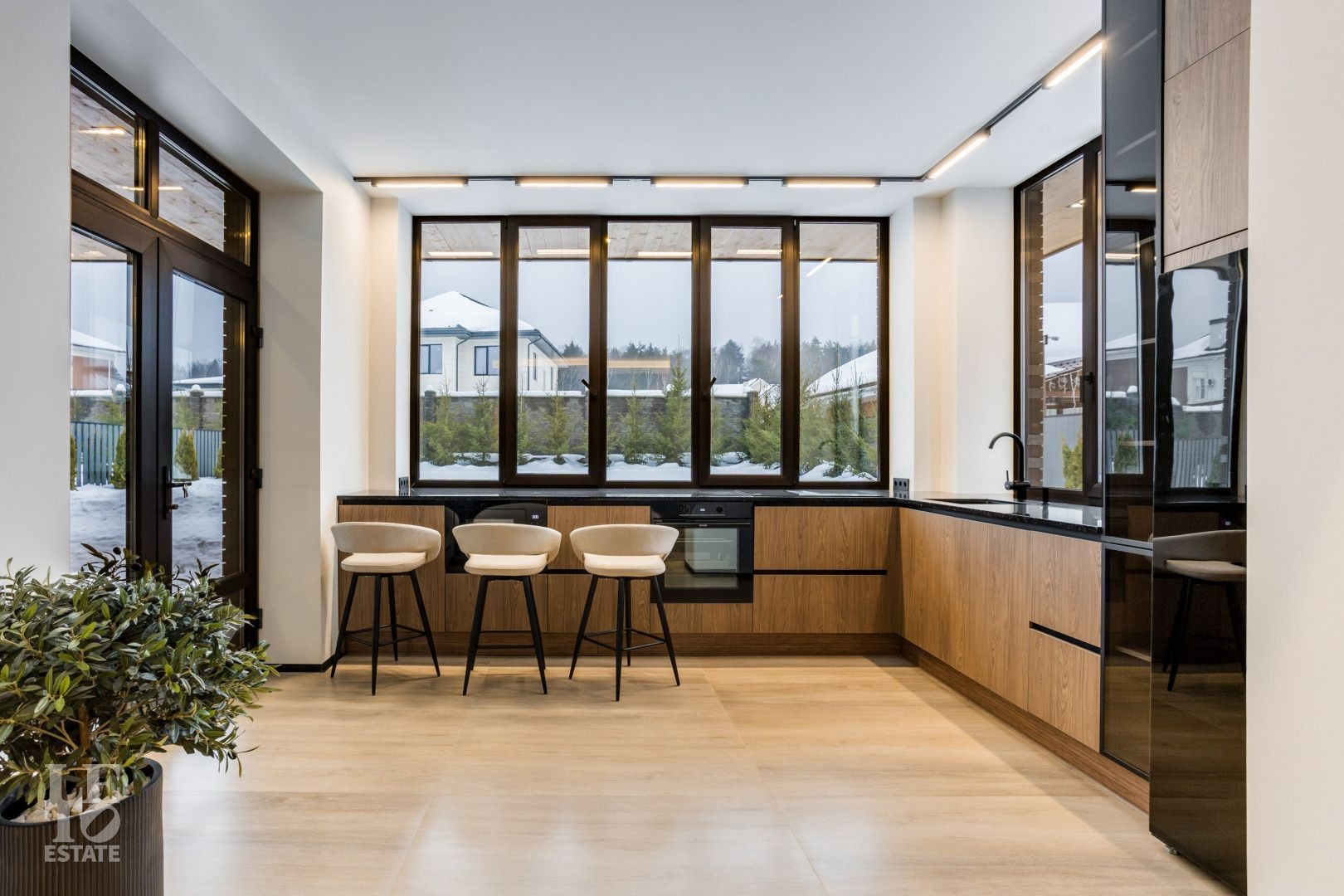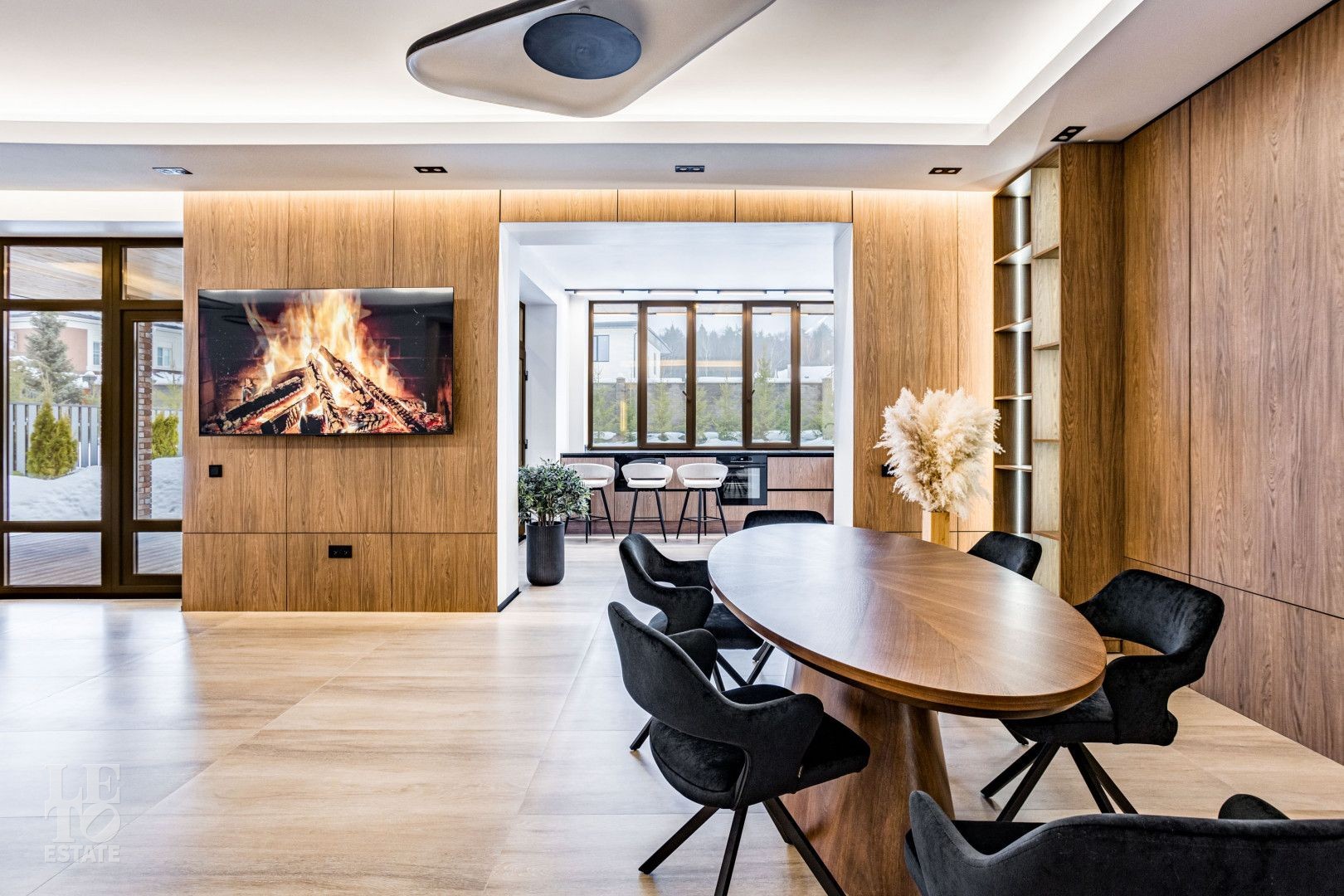 Отдельного акцента заслуживает планировка дома. Дом двухэтажный. Все пространство эргономично спланировано. Совмещенная кухня-гостиная позволит проводить теплые уютные вечера в семейном кругу, а в летнее время можно наслаждаться ужином на террасе. Также на первом этаже есть кабинет с выходом на индивидуальную террасу. Второй этаж отведен для спален.