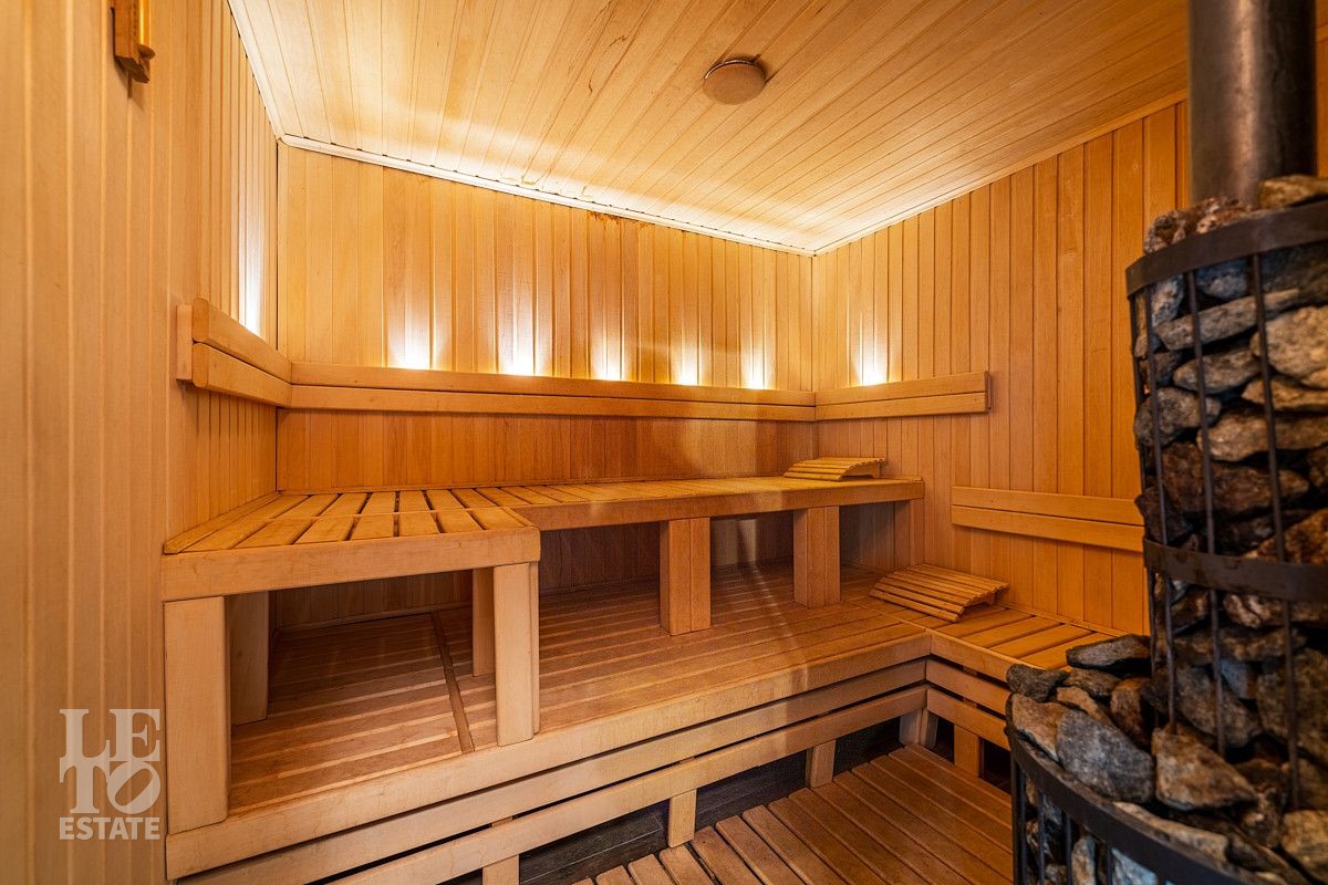 На участке есть спа-комплекс с бассейном, зоной барбекю и комнатой отдыха с кухней, может использоваться, как гостевой домик, общей площадью 100 кв.м, с отделкой и мебелью. Также есть гараж на два машиноместа, с комнатами для персонала на втором этаже.