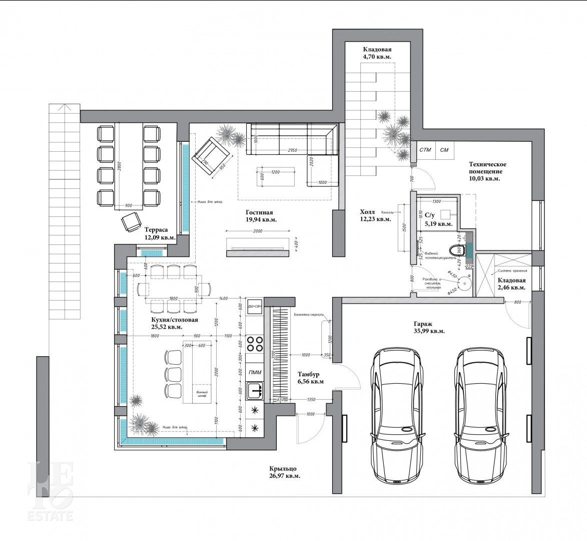Первый этаж: прихожая, выход в гараж, гардеробная, кухня - столовая, гостиная с терассай, кладовая, техническое помещение, санузел, кладовая