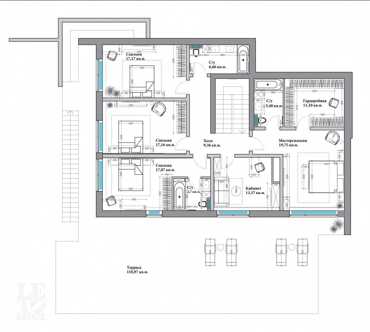 Второй этаж: две спальни, санузел с ванной, спальня со своим санузлом и ванной, кабинет, мастер-спальня со своей гардеробной и санузлом и ванной