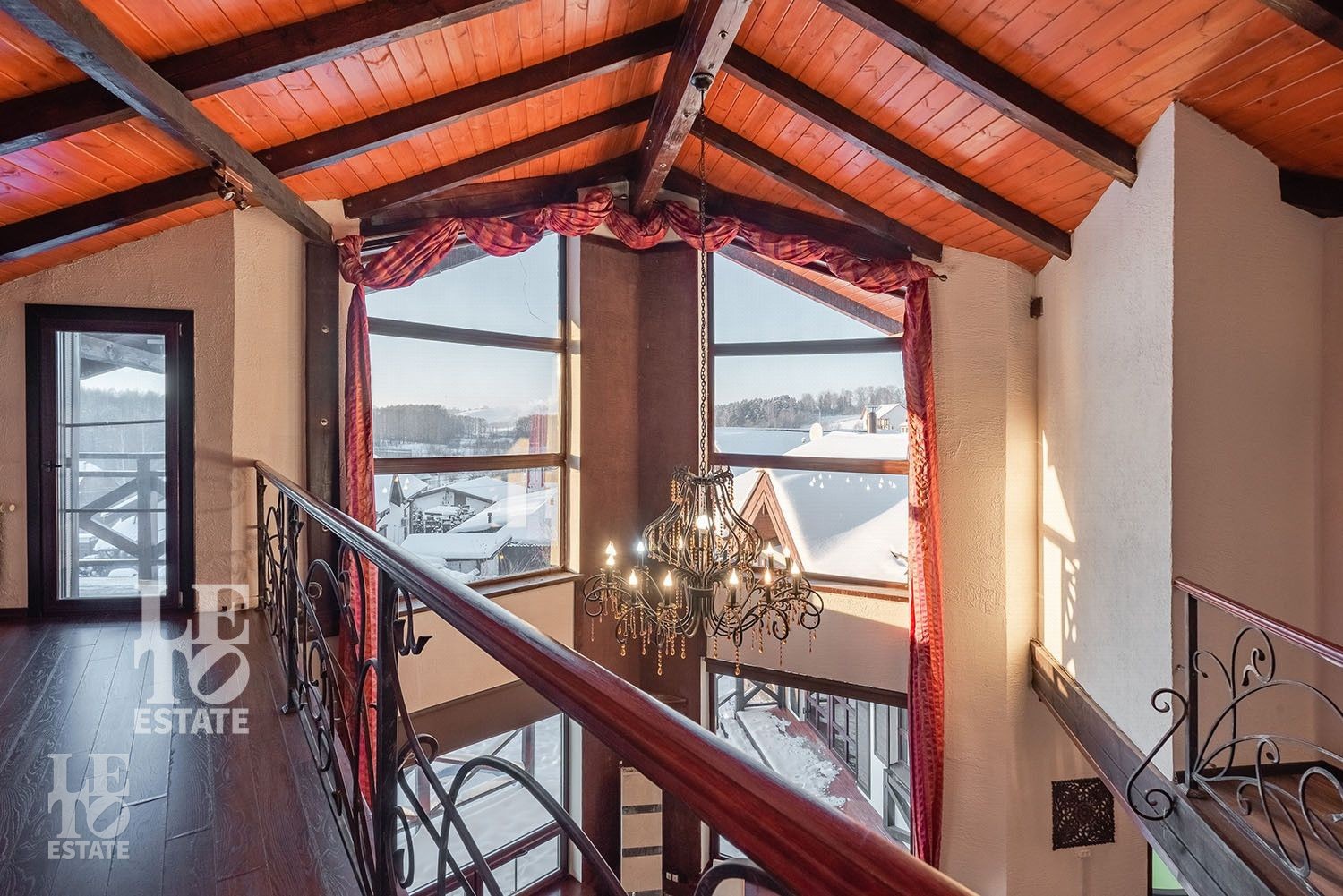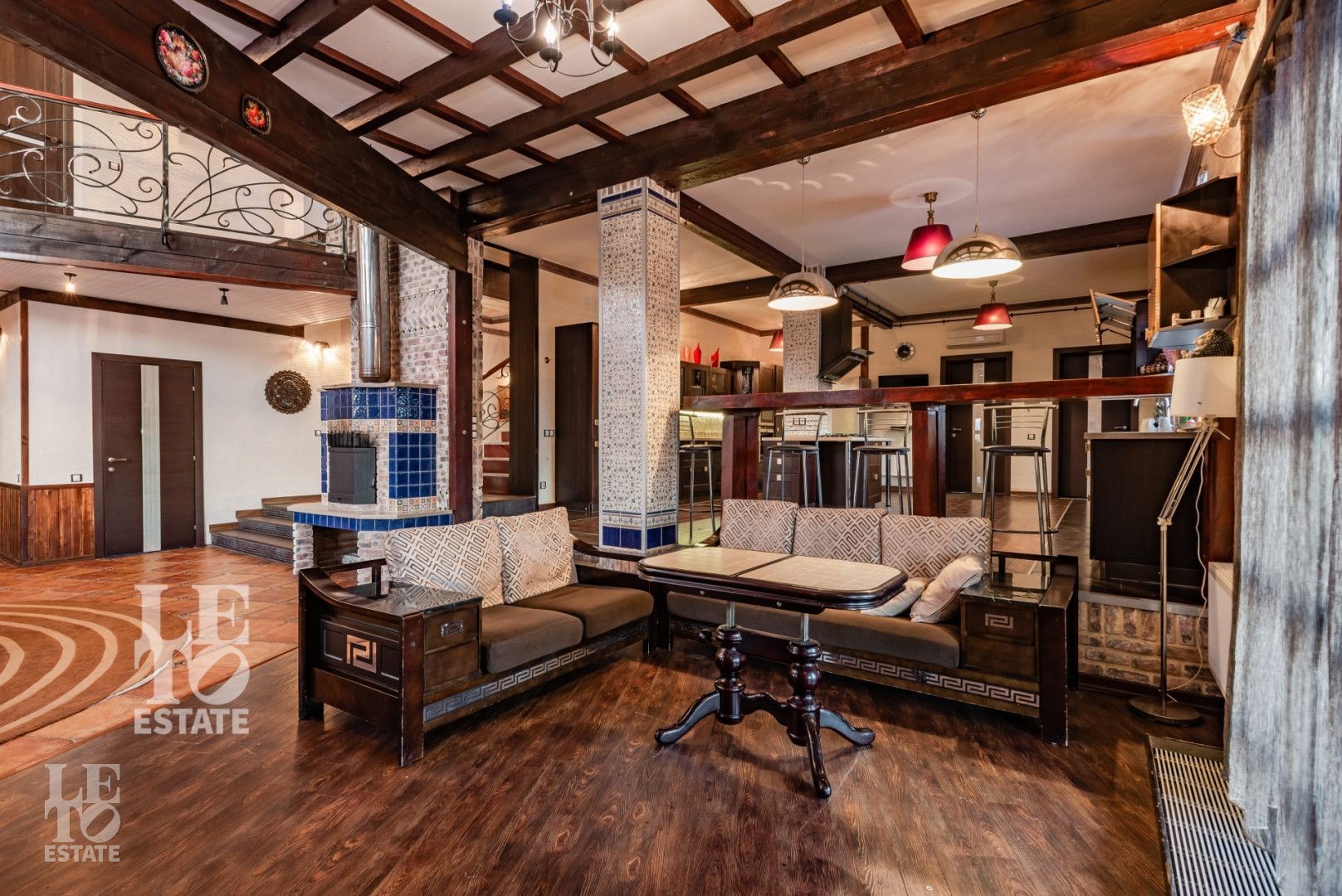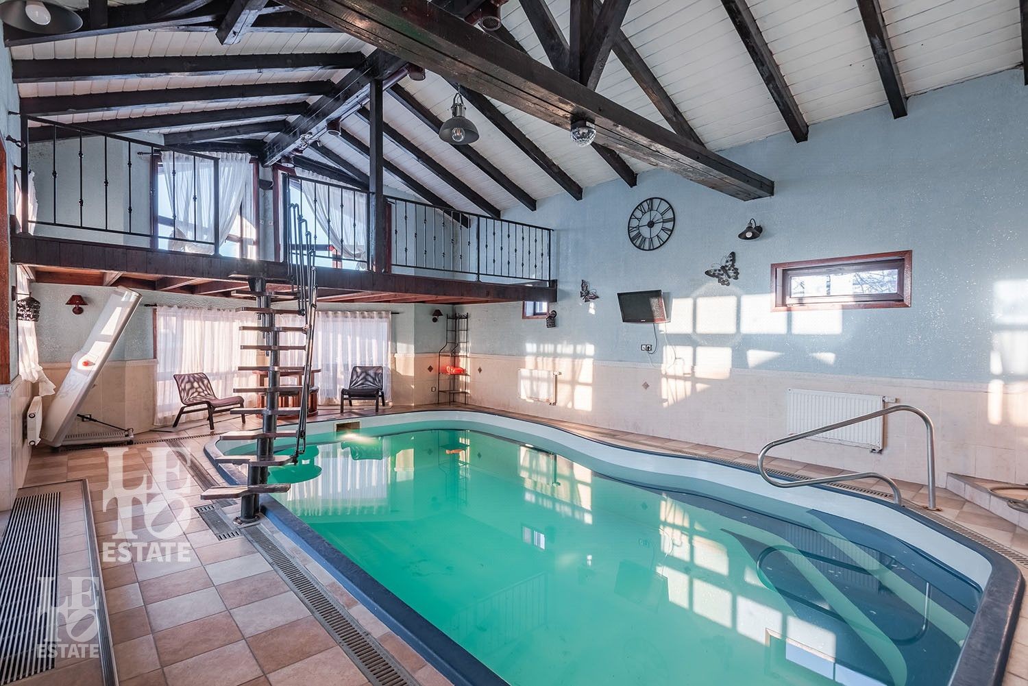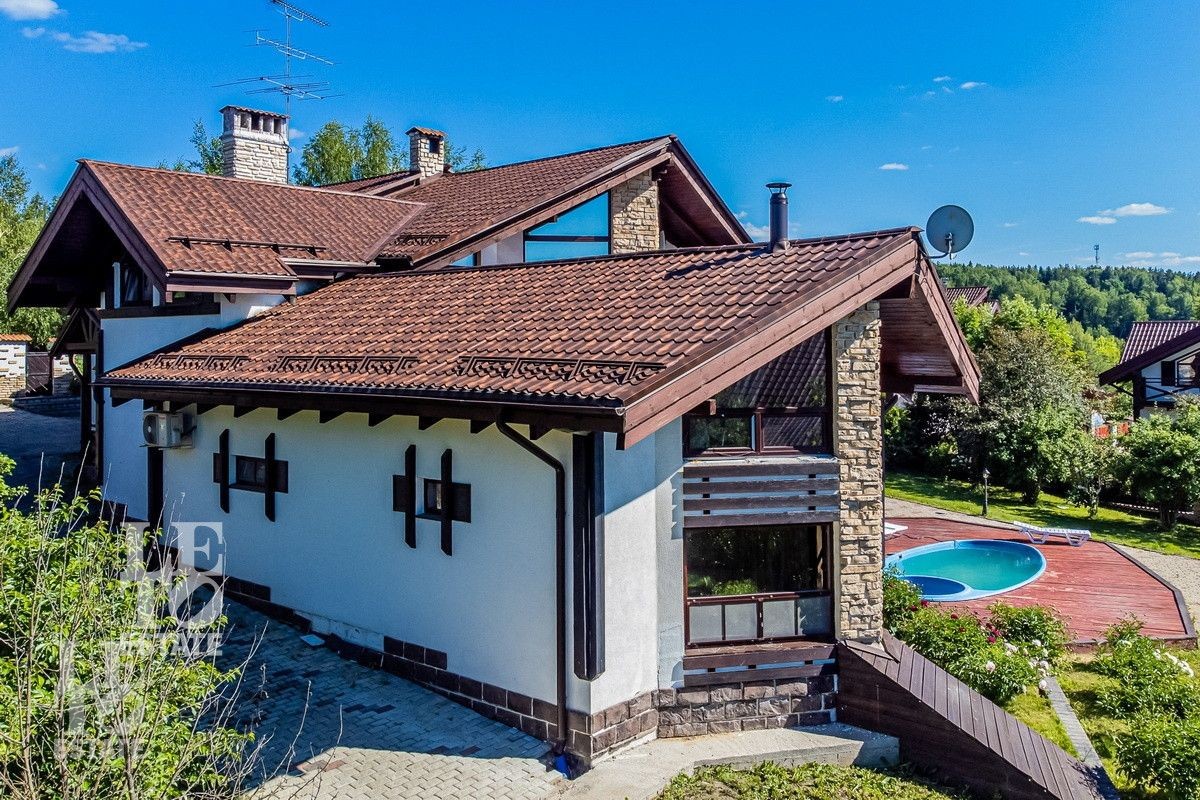 Вашему вниманию представляется современный полностью готовый дом в стиле шале общей площадью 550 м2. Расположен на благоустроенном участке 22 сотки. Помимо основного дома на участке расположены: баня площадью 100 м2, дом охраны площадью 80 м2, 2 хозяйственных блока для хранения техники, беседка с зоной BBQ, а также уличная джакузи. На участке выполнен ландшафтный дизайн, дренаж, автополив, установлено декоративное освещение, дорожки вымощены брусчаткой.