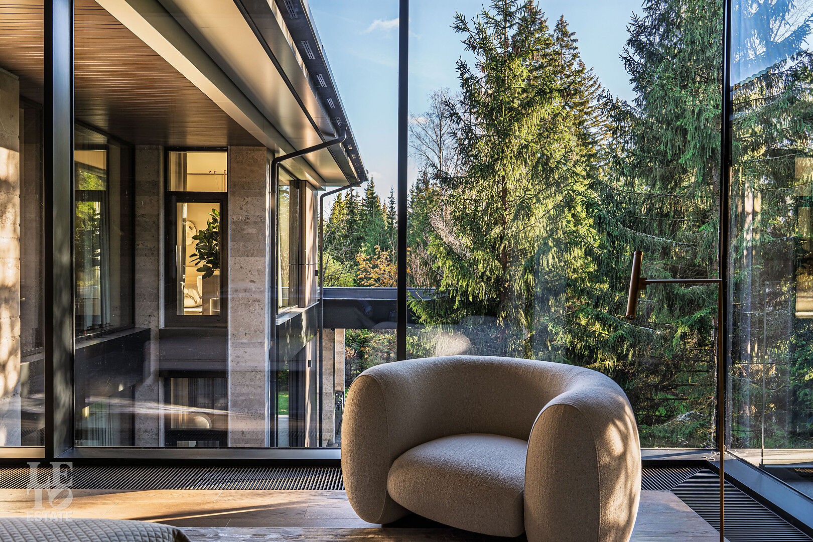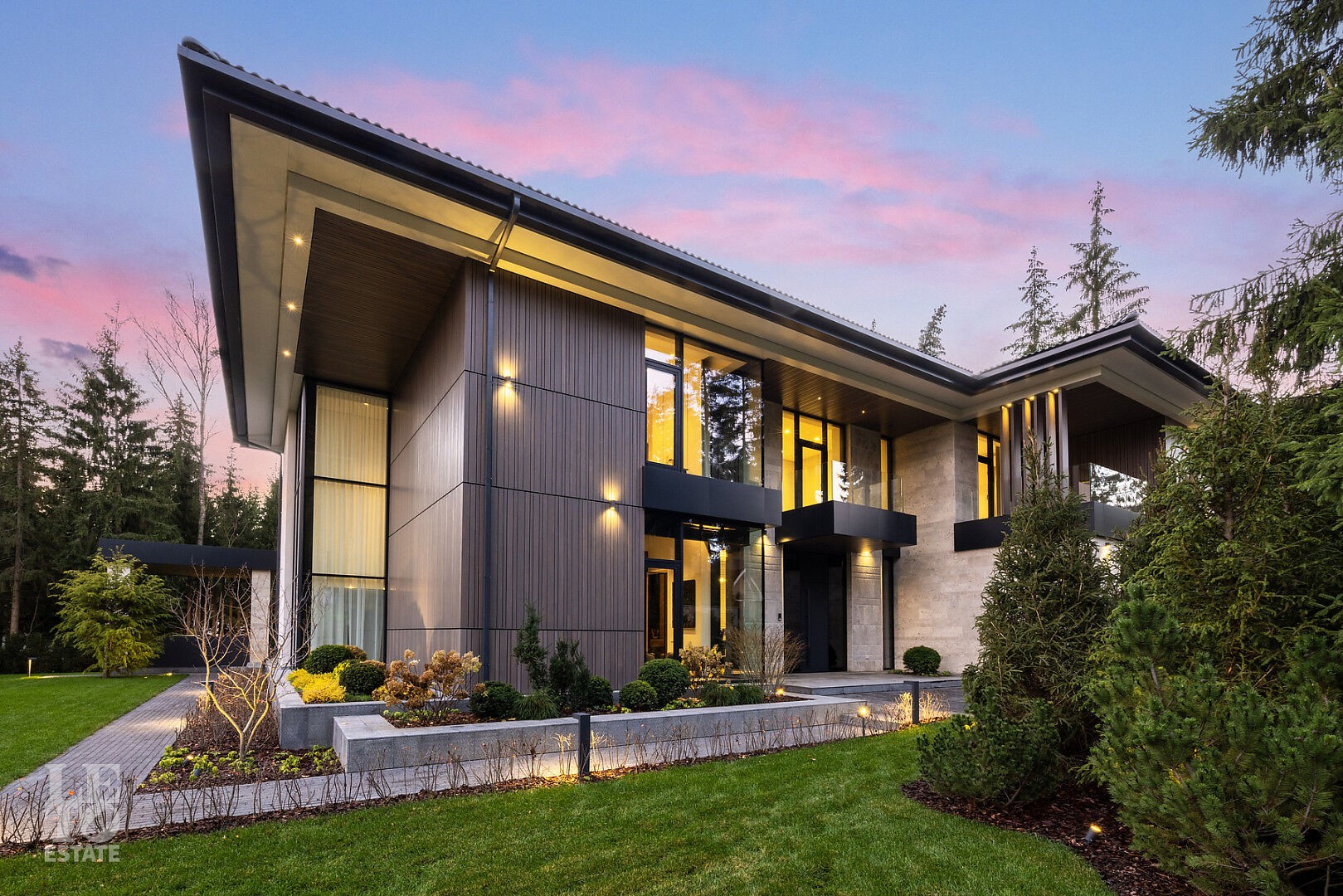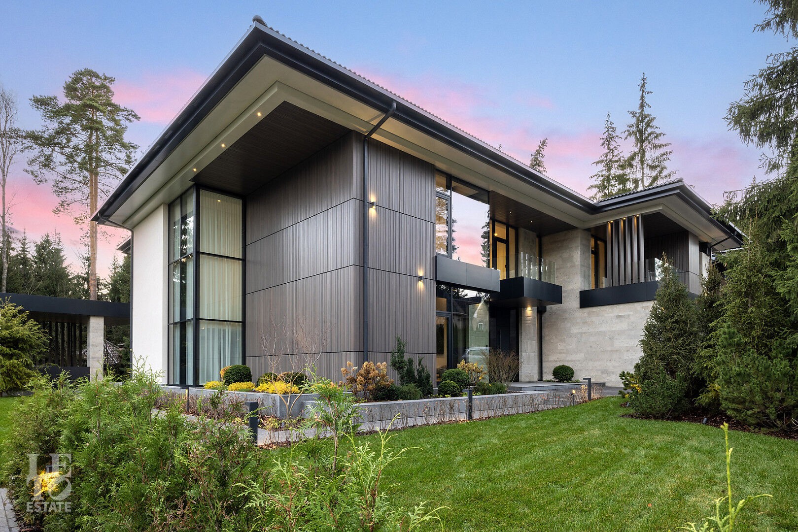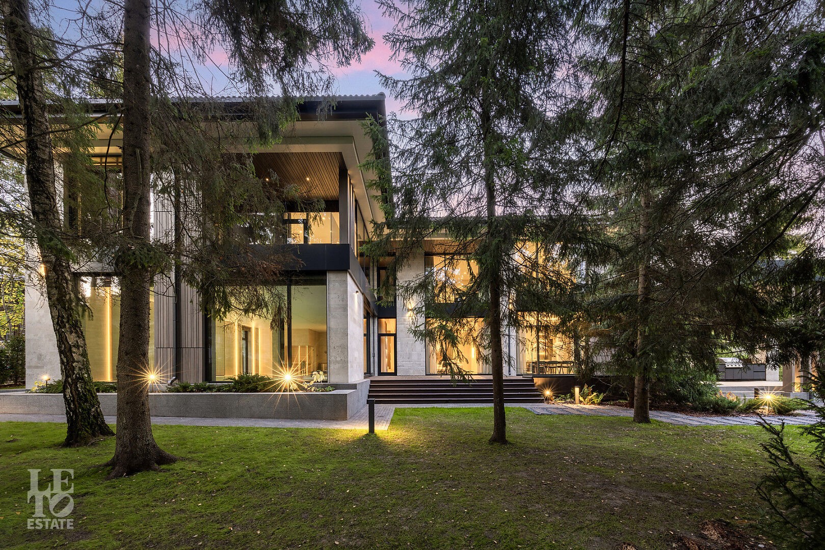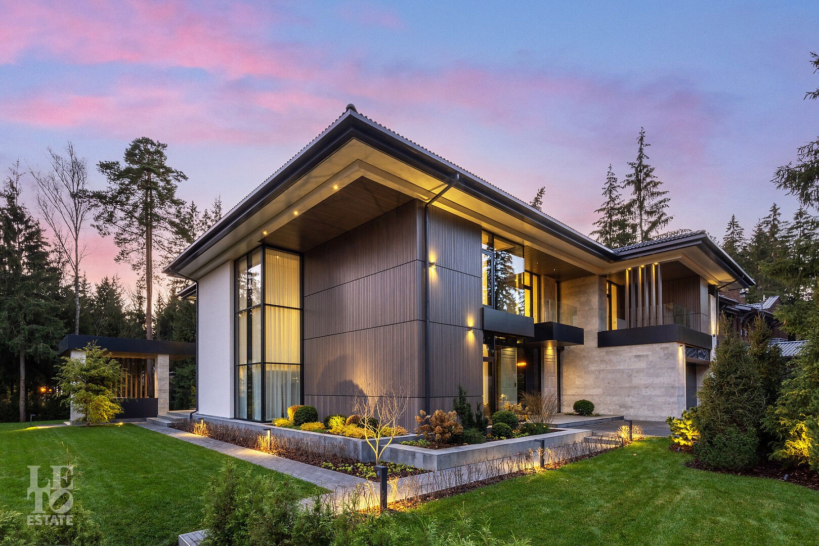 Эта резиденция — воплощение гармонии и покоя, спрятанное в сердце реликтового леса. Современная интерпретация архитектуры Райта с оттенком новаторства в фасаде.