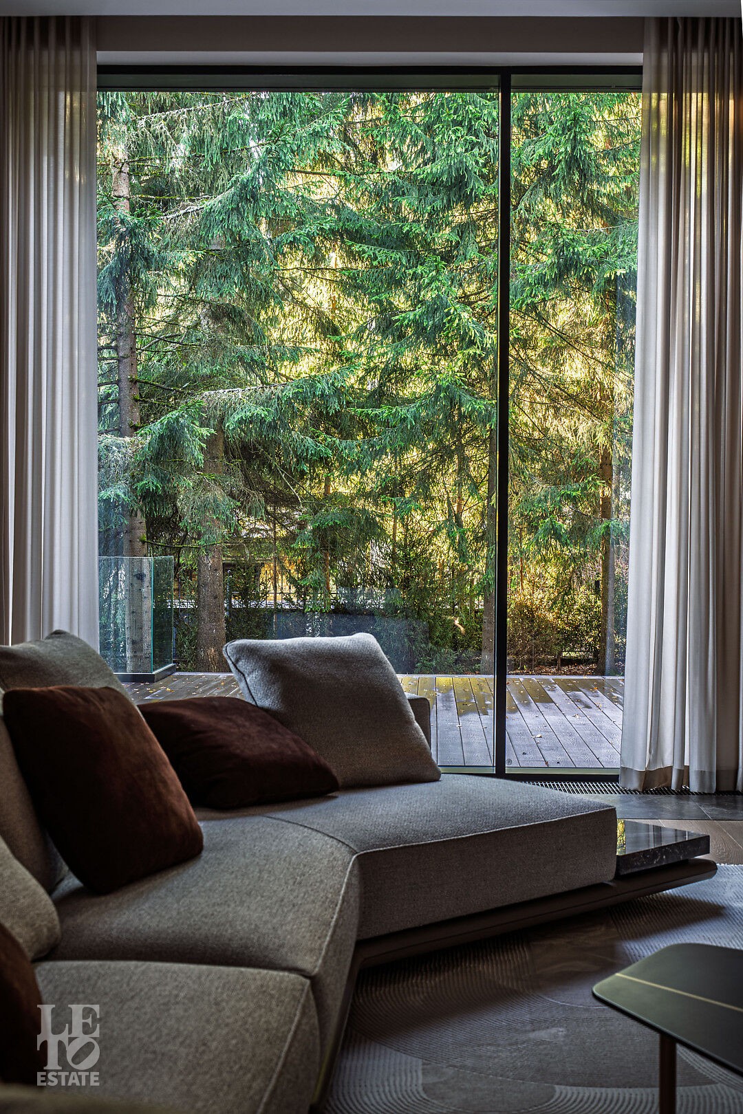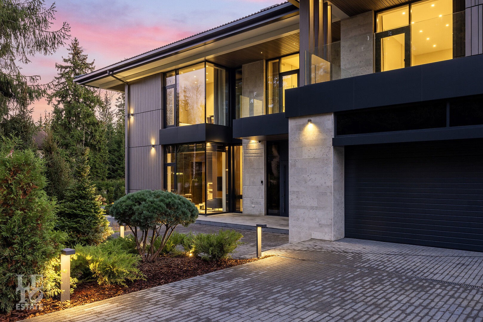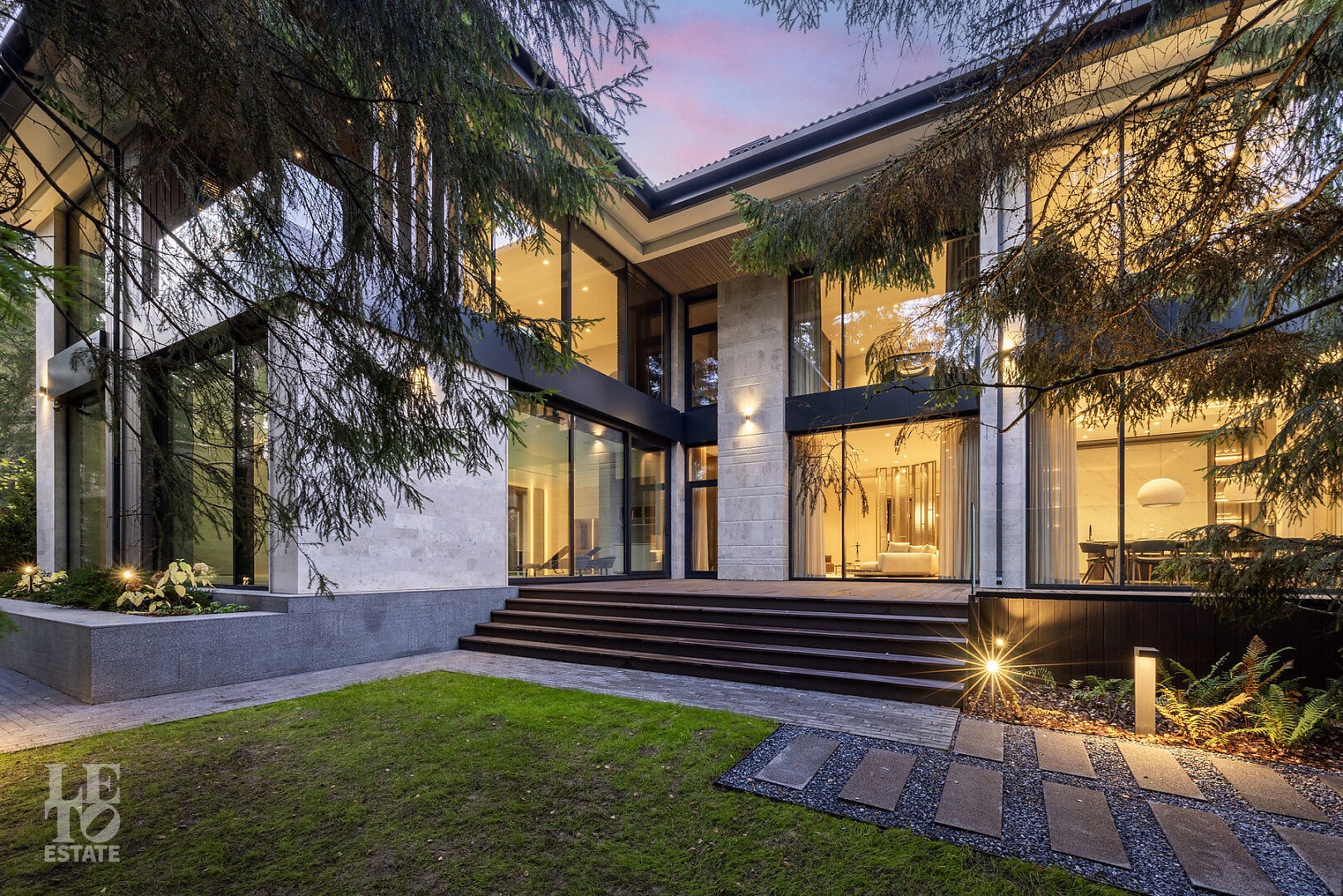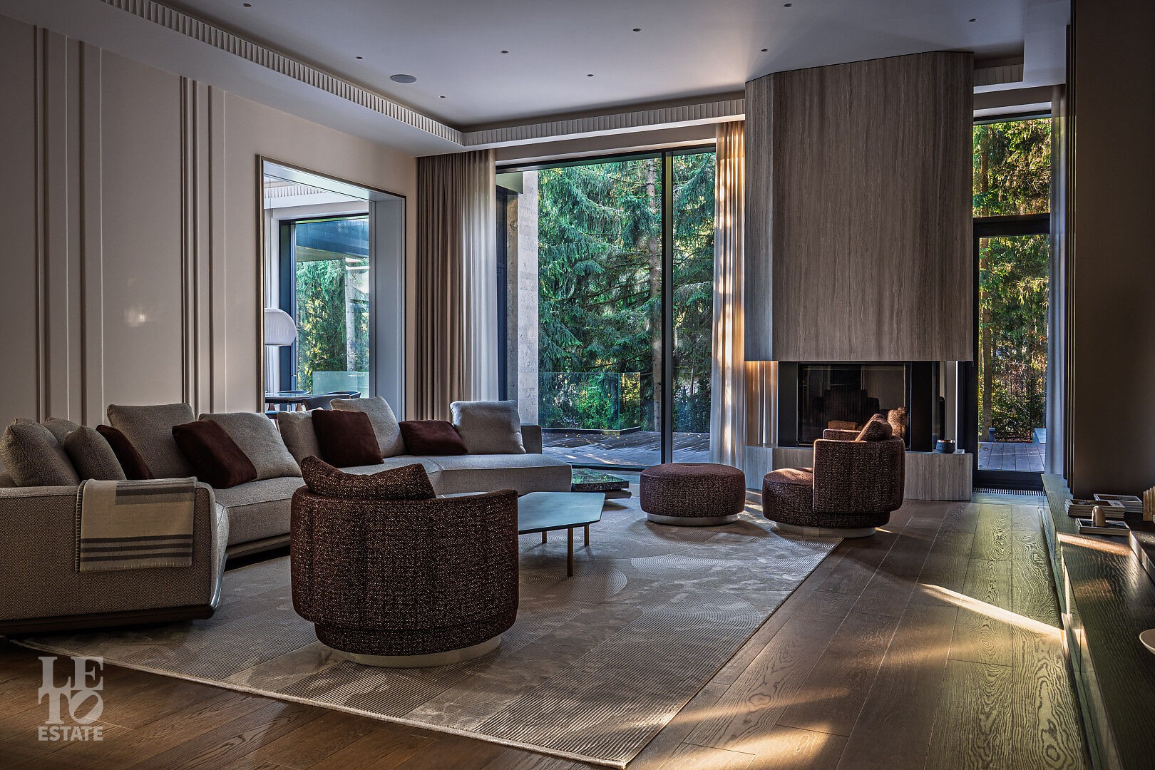 Эта резиденция — воплощение гармонии и покоя, спрятанное в сердце реликтового леса. Современная интерпретация архитектуры Райта с оттенком новаторства в фасаде.
