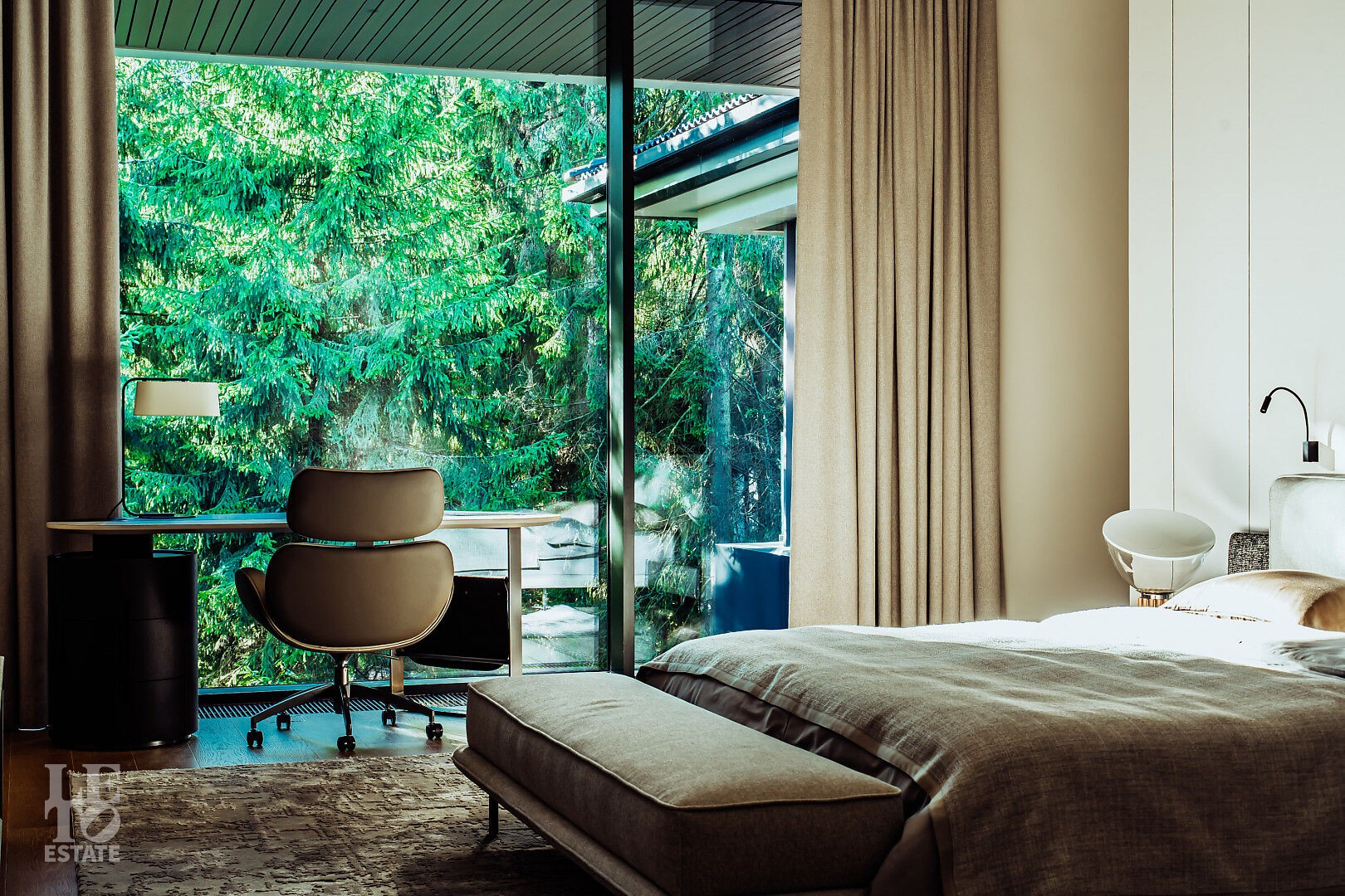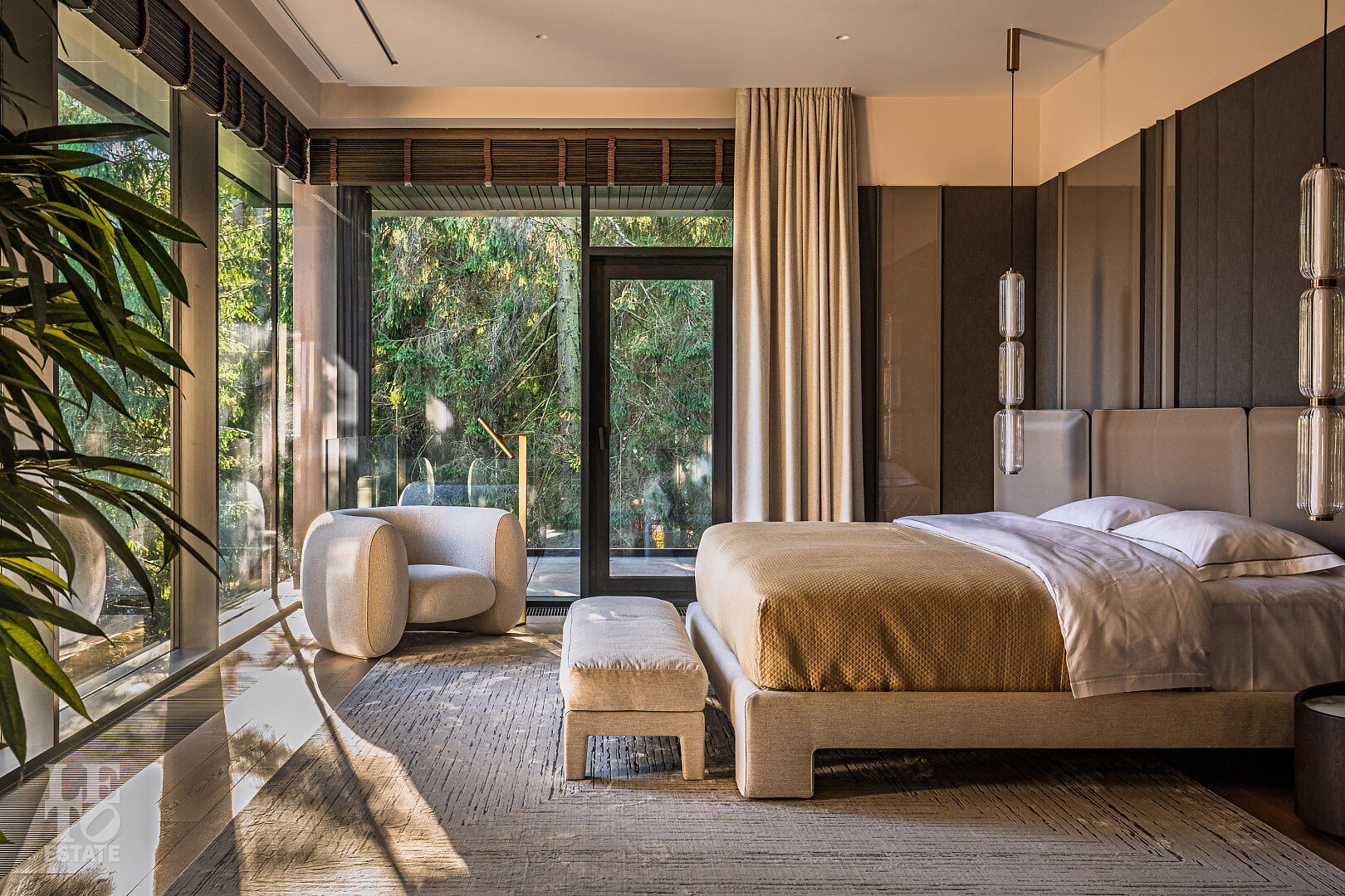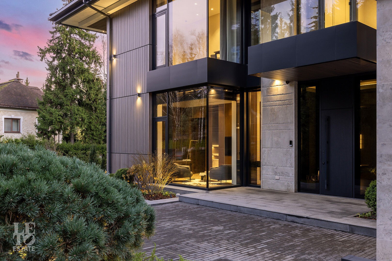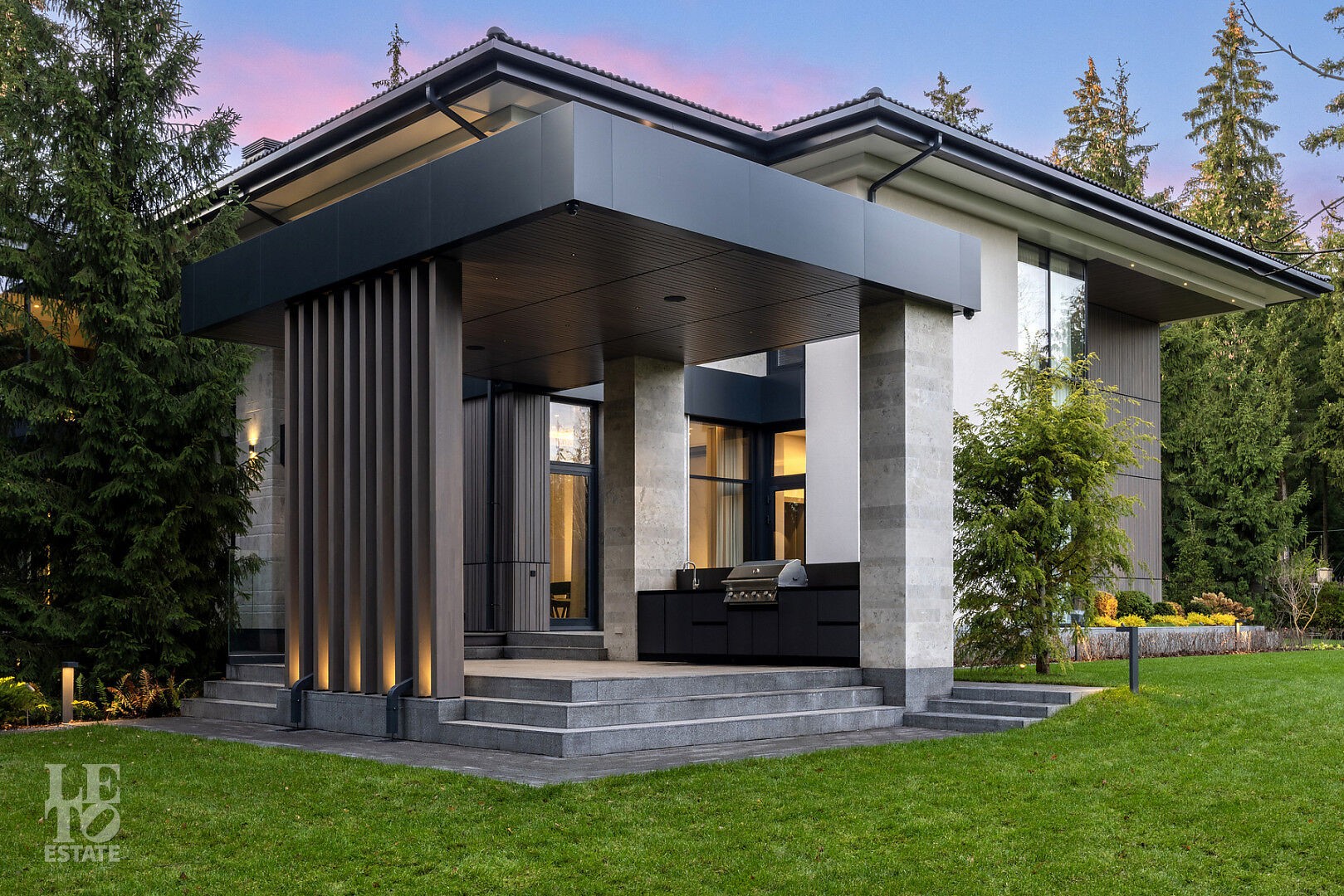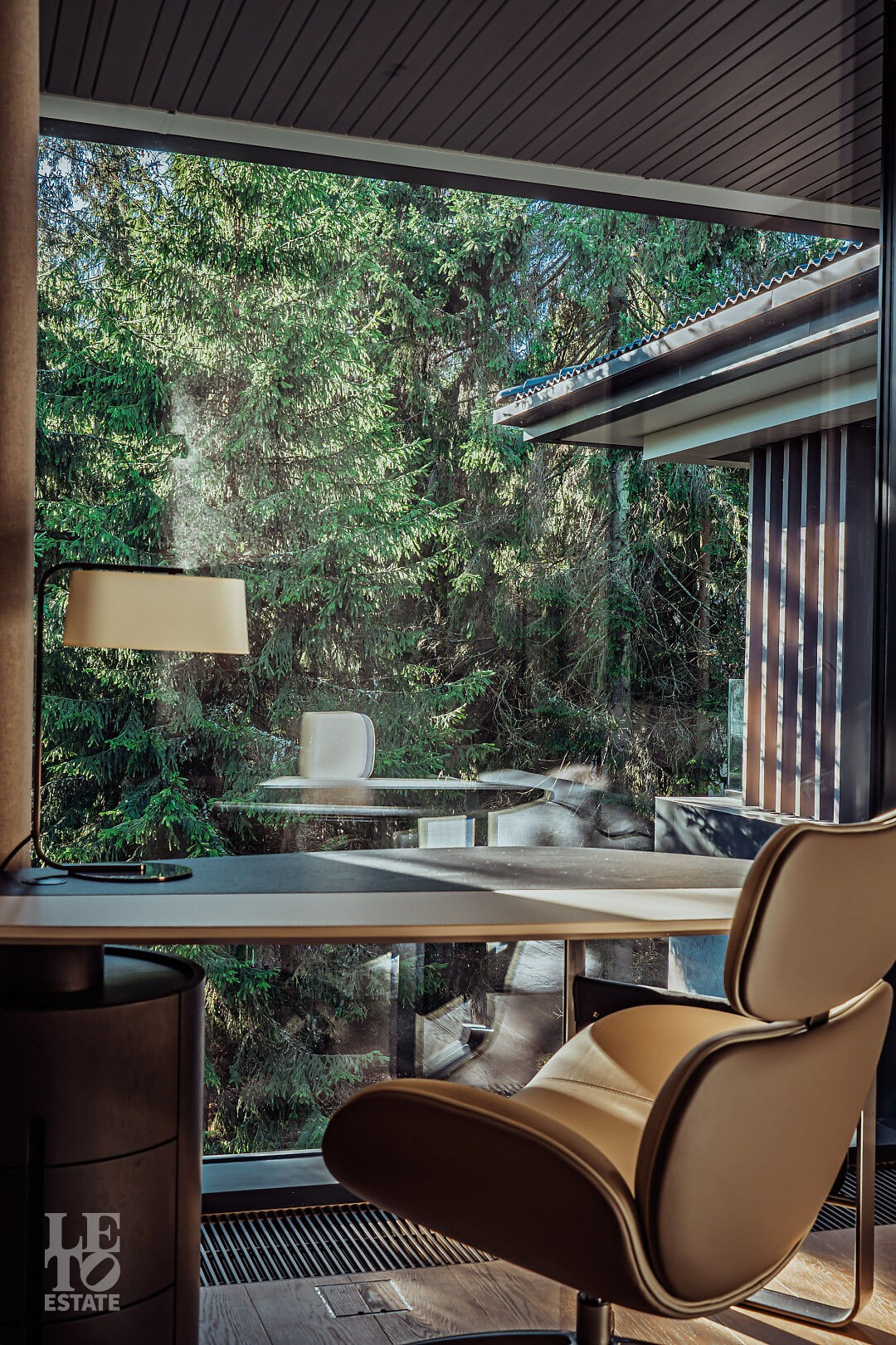 Эта резиденция — воплощение гармонии и покоя, спрятанное в сердце реликтового леса. Современная интерпретация архитектуры Райта с оттенком новаторства в фасаде.