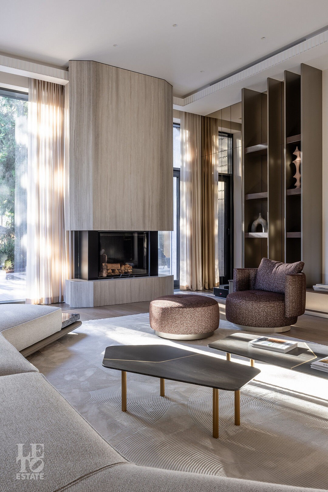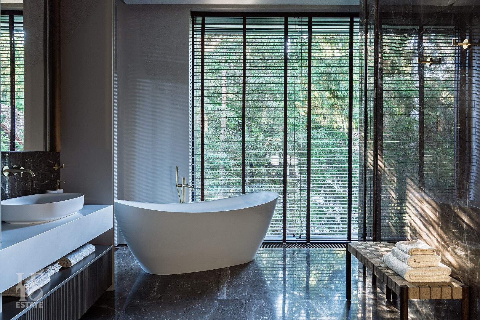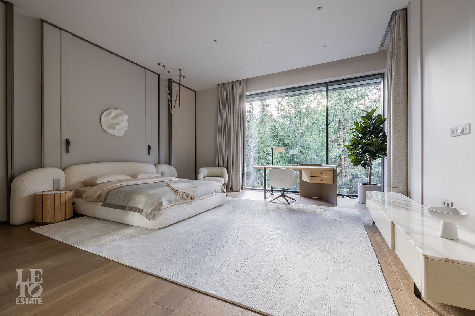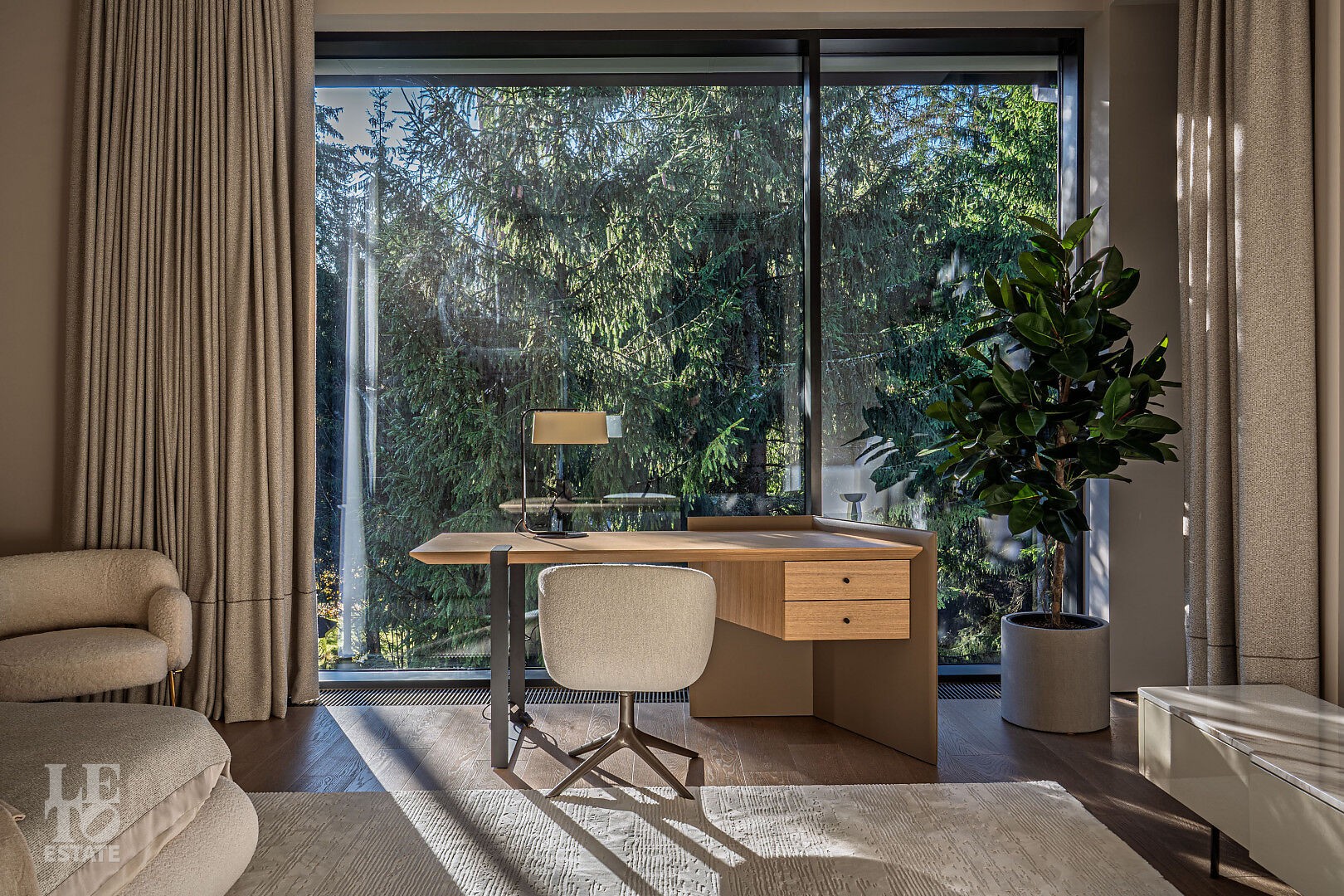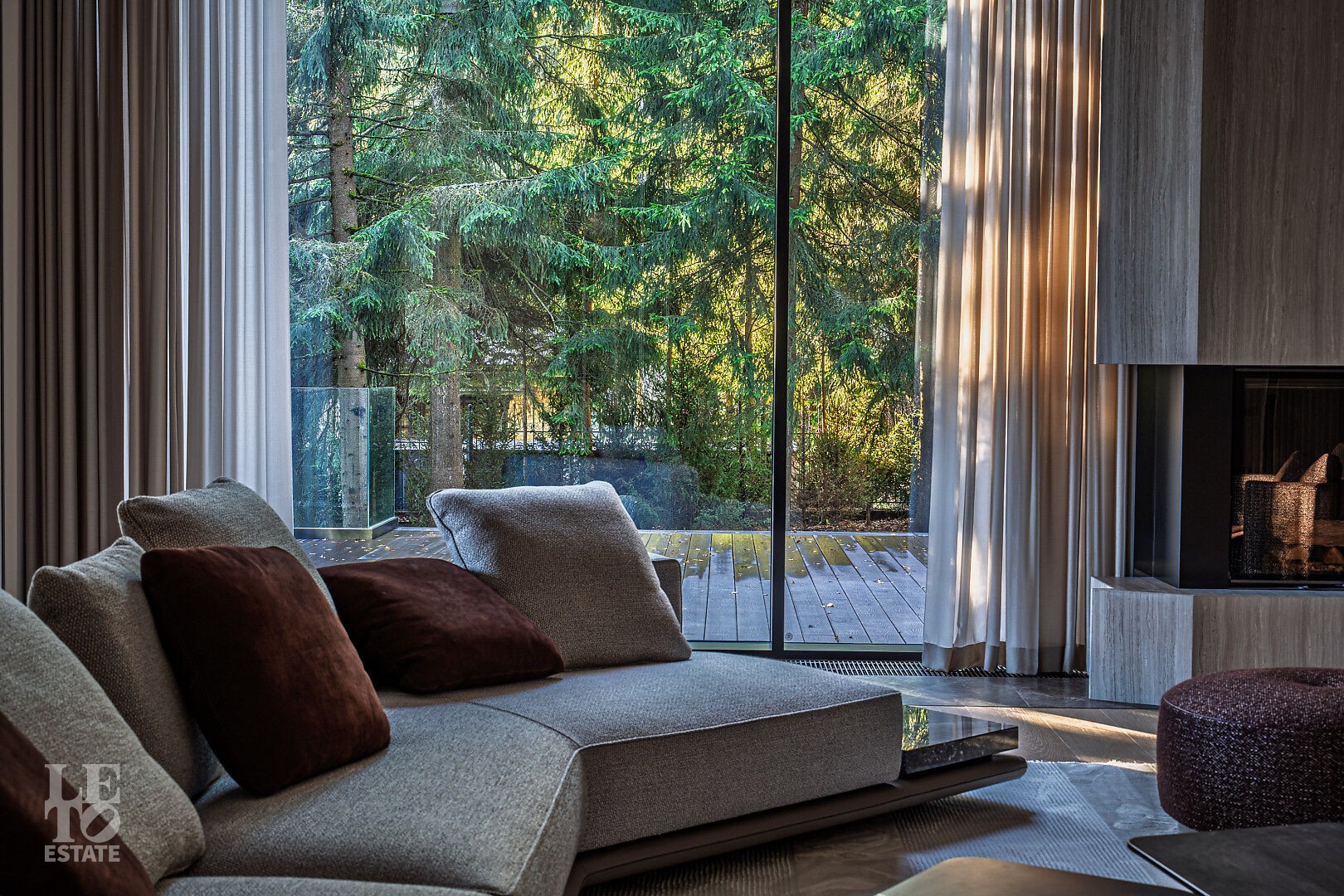 Эта резиденция — воплощение гармонии и покоя, спрятанное в сердце реликтового леса. Современная интерпретация архитектуры Райта с оттенком новаторства в фасаде.