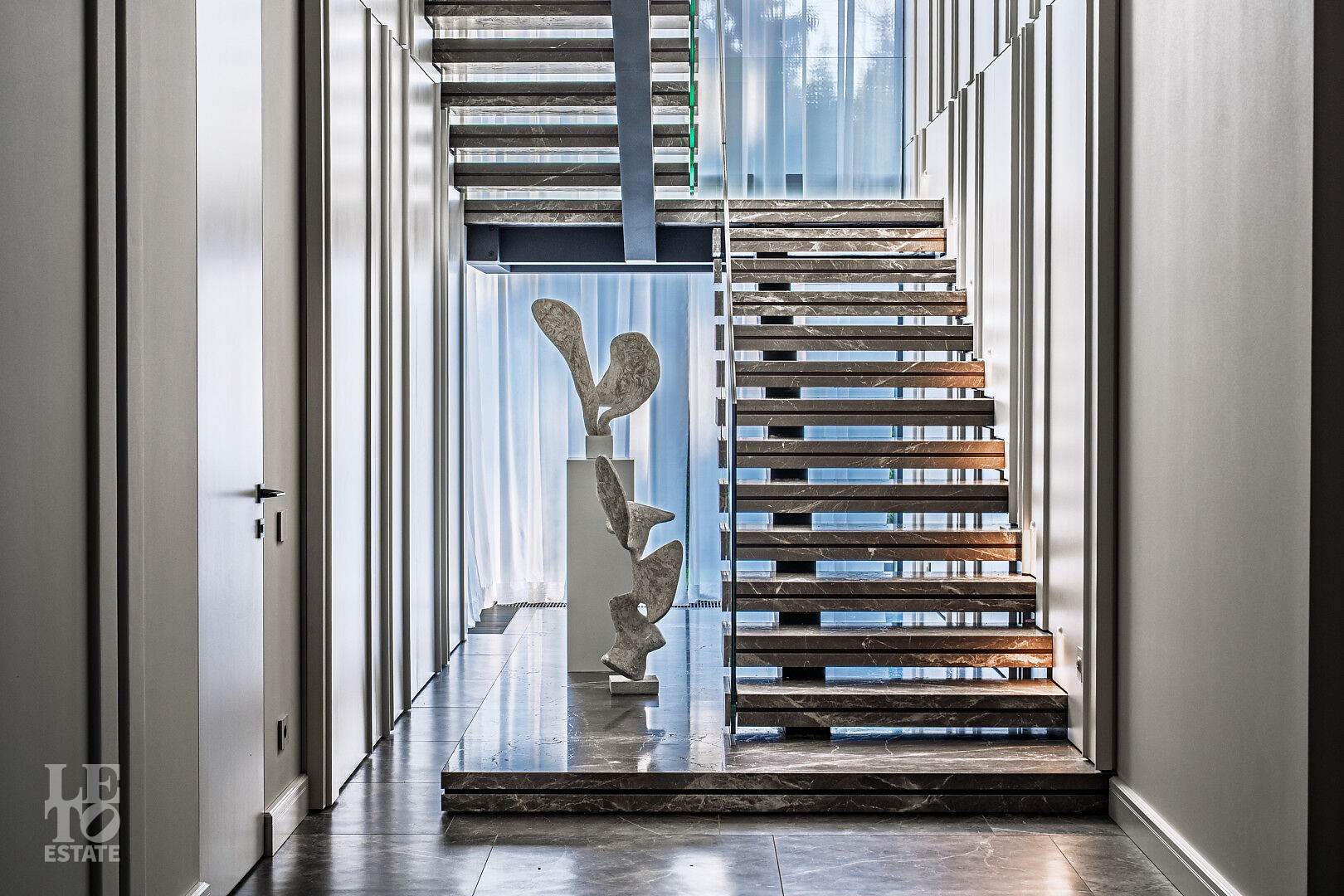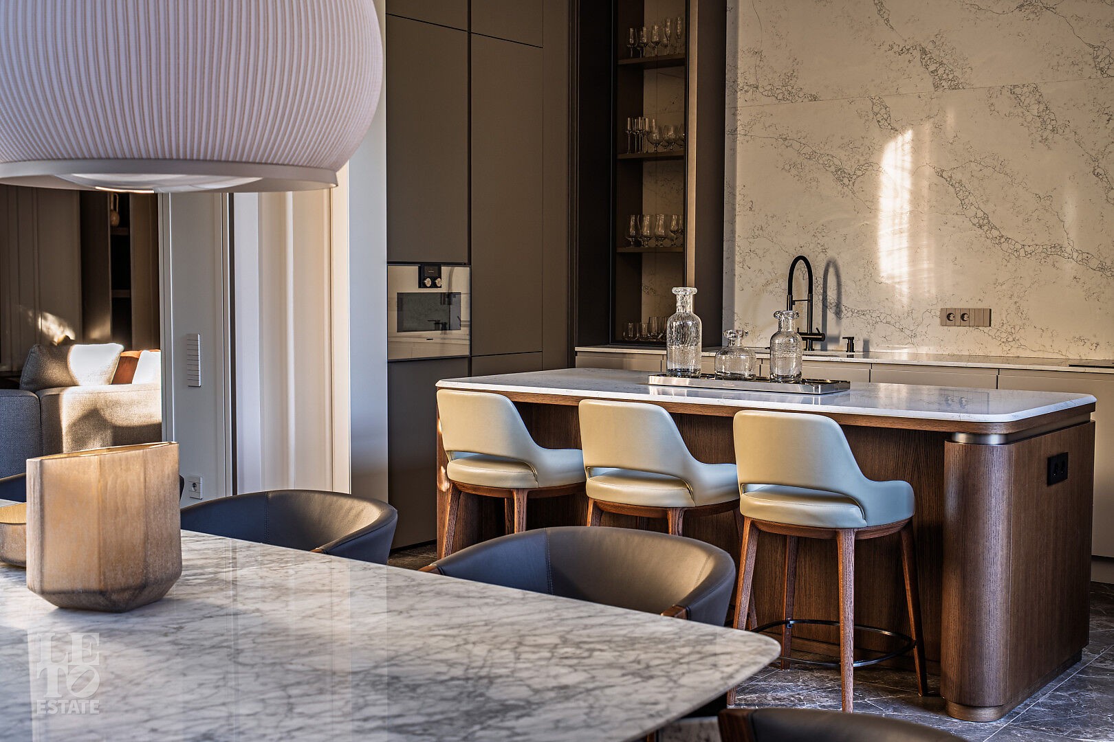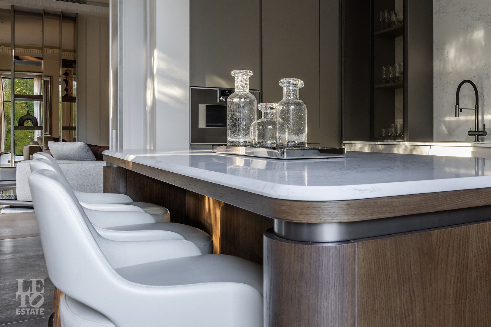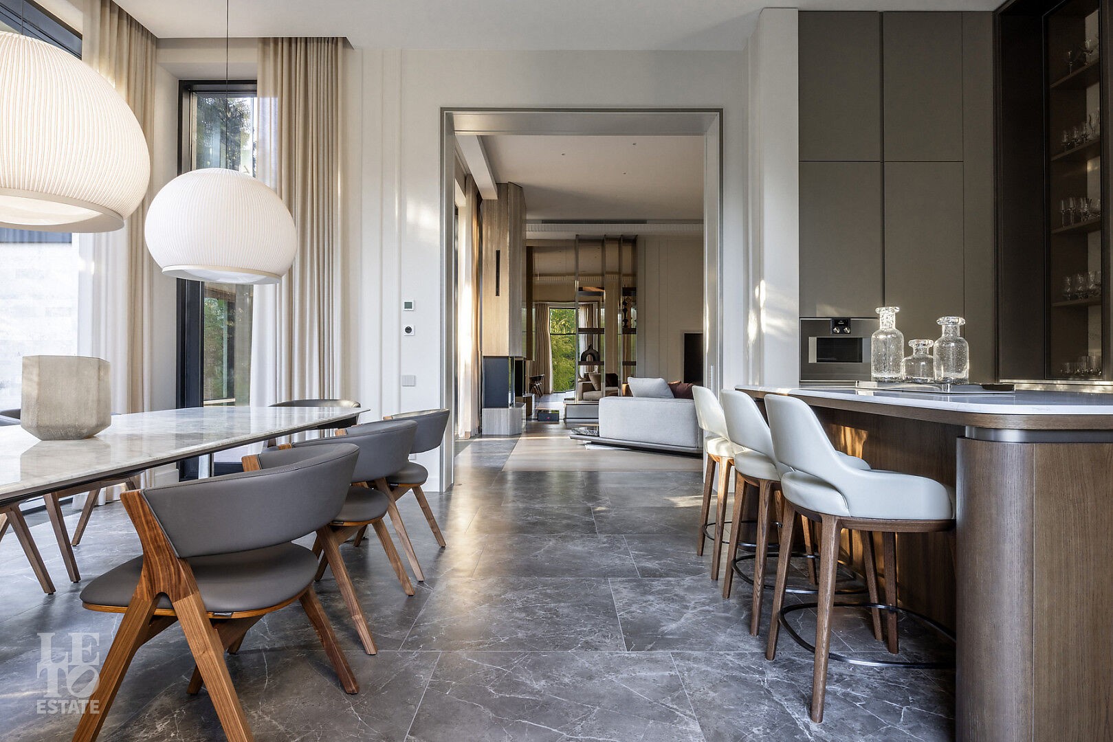 Первый этаж: гостиная, кабинет с санузлом и гардеробом, СПА-зона с бассейном, сауной и хаммамом, параднаяя кухня, рабочая кухня, терраса с летней кухней и зоной барбекю, гараж на два м/м.