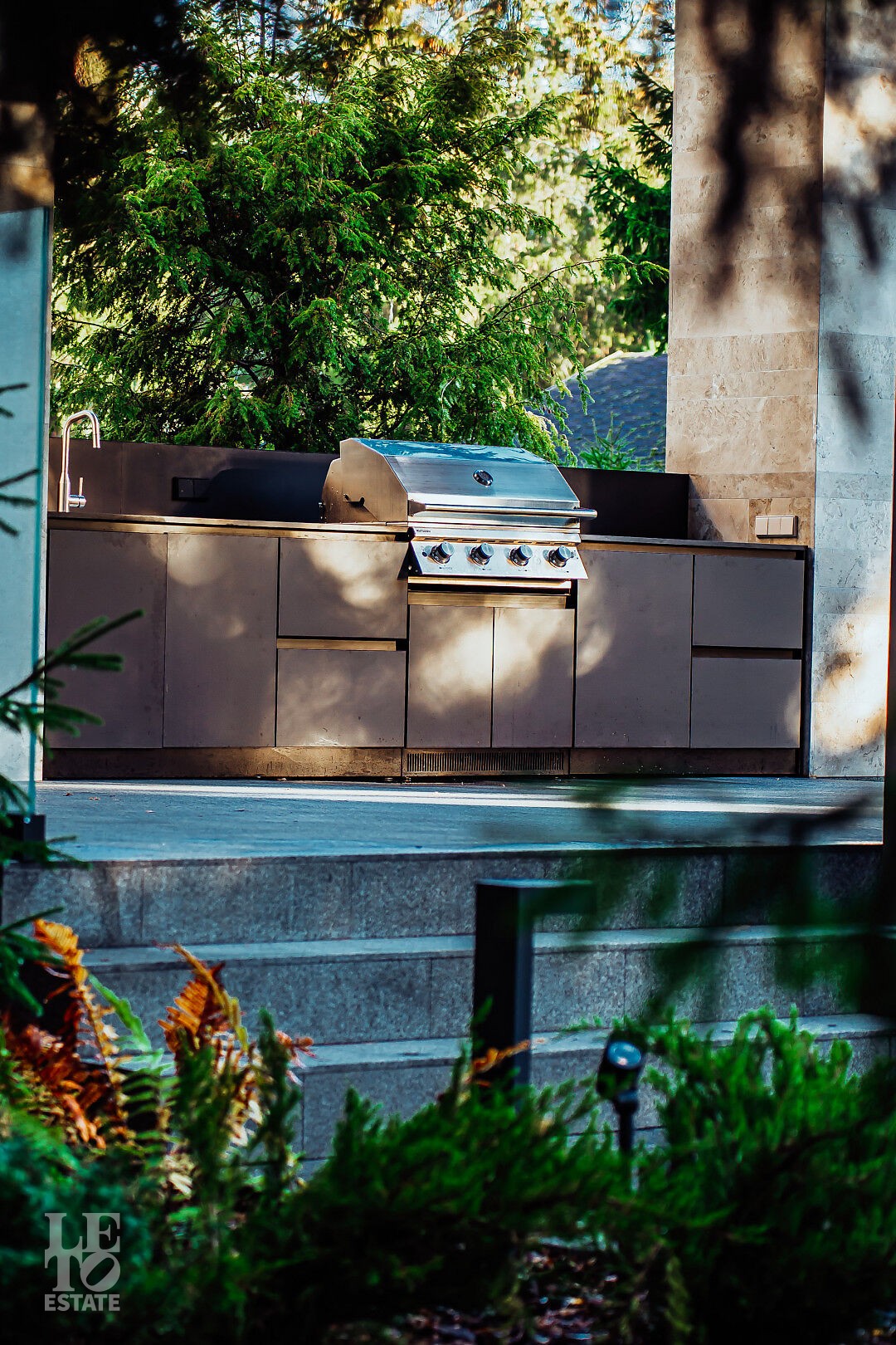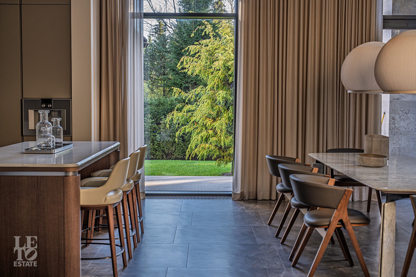 рабочая кухня, отдельный блок для персонала и большая терраса, соединяющая дом с участком.
