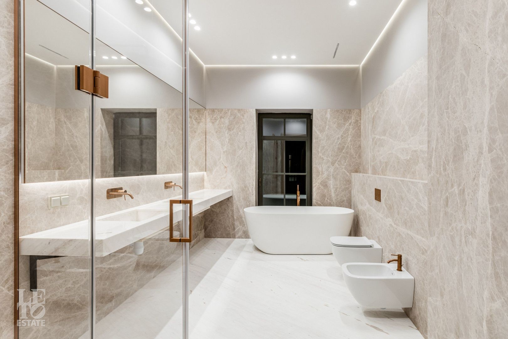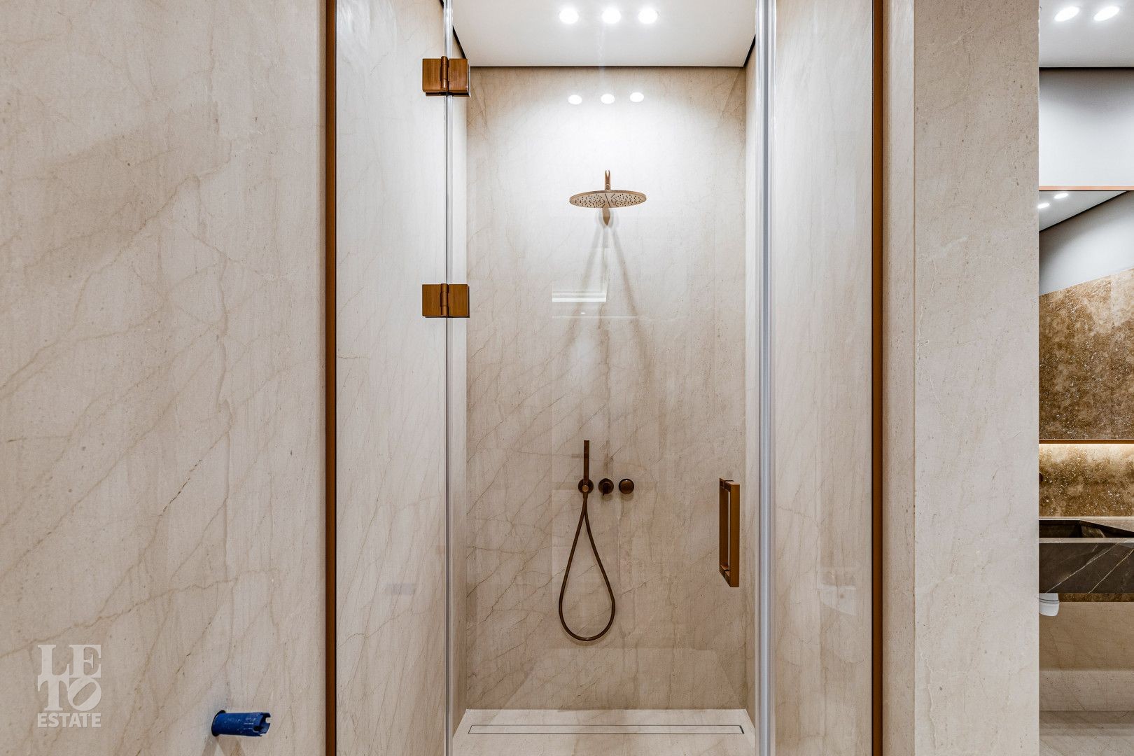 В доме предусмотрены современные инженерные системы, включая центральное кондиционирование. Интерьеры выполнены с использованием премиальных материалов, а панорамное остекление наполняет помещения светом и визуально объединяет пространство с природным окружением.