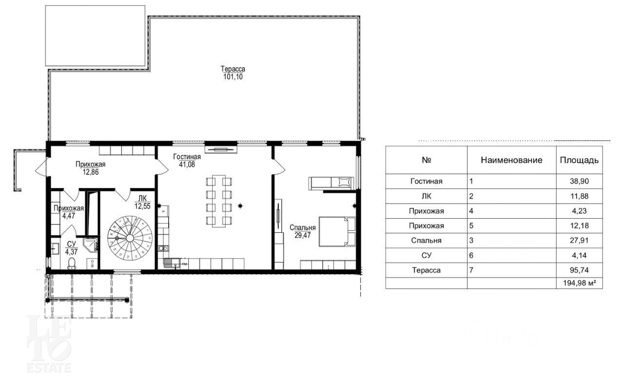 Первый этаж: прихожая, гостевой санузел, кухня-гостиная, спальня, терраса