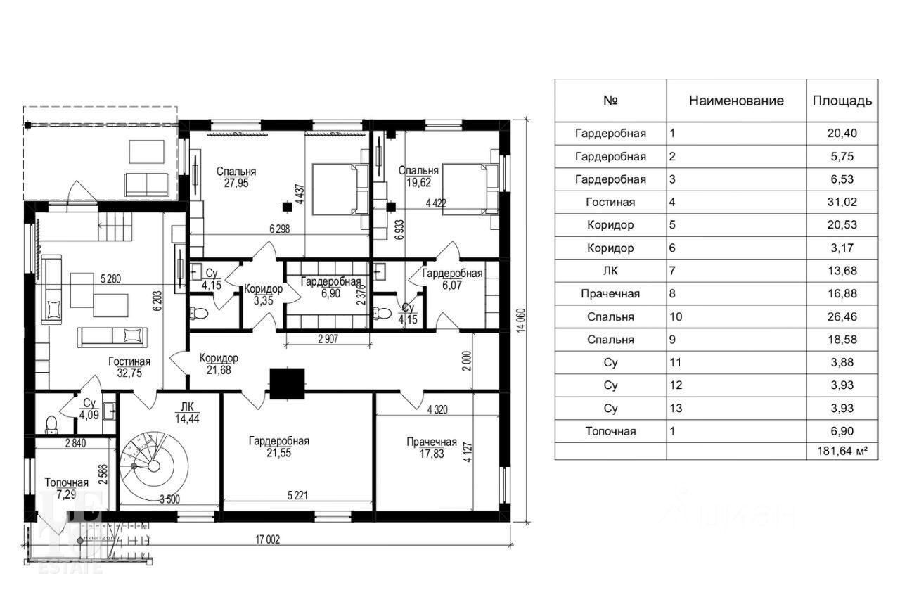 Второй этаж: гостиная, две спальни с собственными гардеробными и санузлом, прачечная, гардеробная.