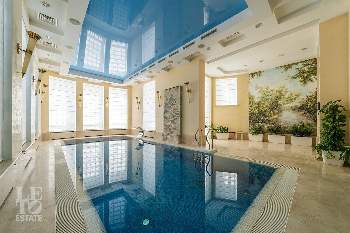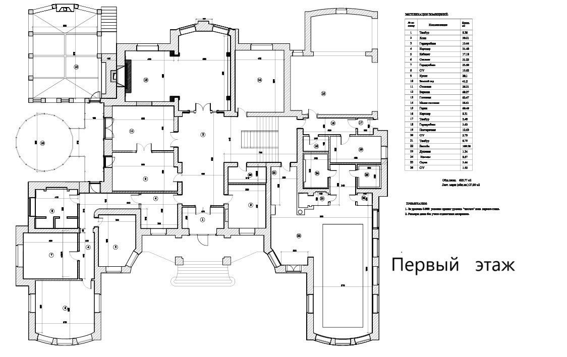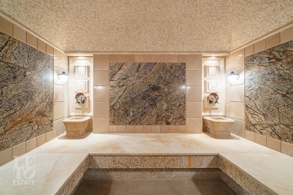 Первый этаж: холл, гардеробная для верхней одежды, гостиная с каминным залом, кухня с профессиональной техникой, гостиная - столовая с выходом в зимний сад и верандой с барбекю зоной, мастер-блок с гардеробной, санузлом, спальней, библиотекой и кабинетом, малая гостиная с кинотеатром, гостевой санузел, бассейн с зоной СПА, хамам, сауна, комната отдыха и душевая с санузлом, гардеробная, постирочная, гараж;