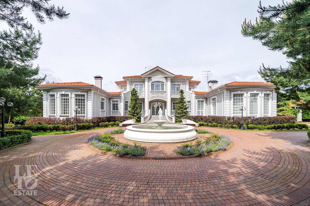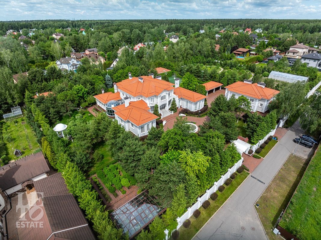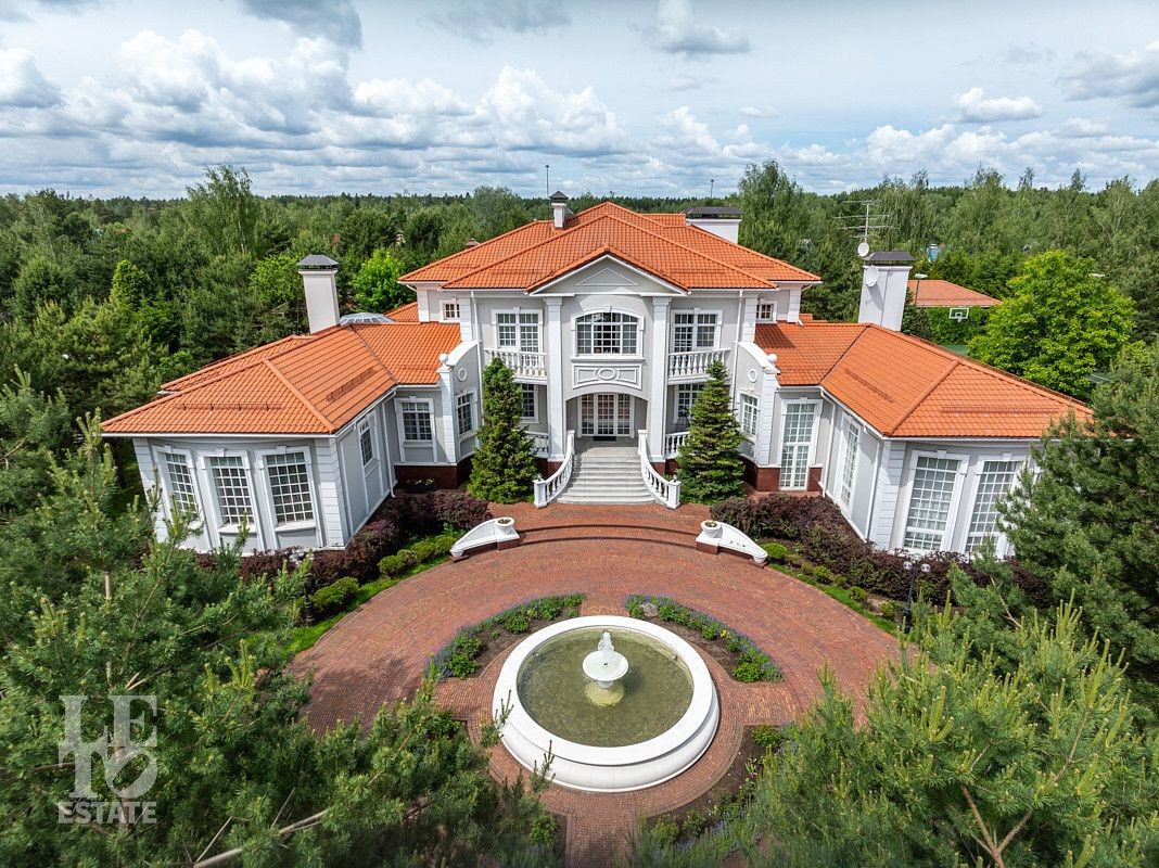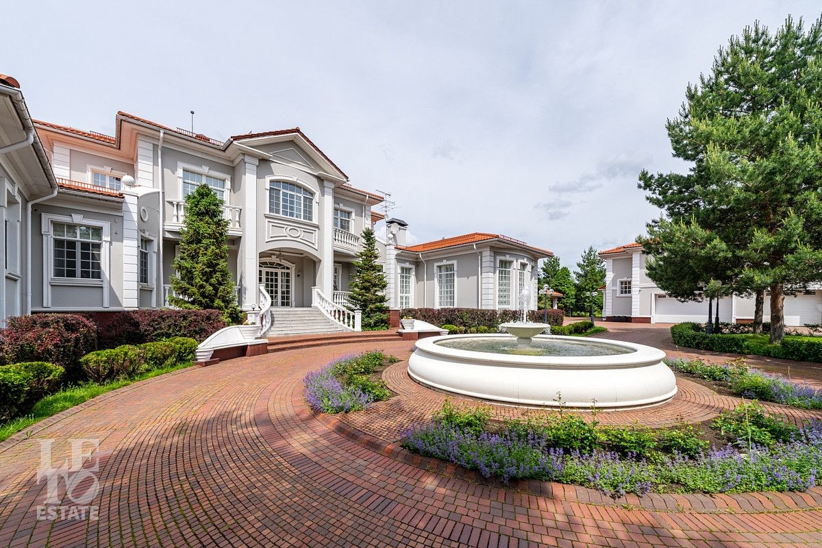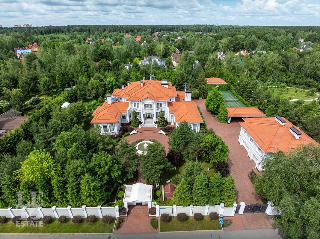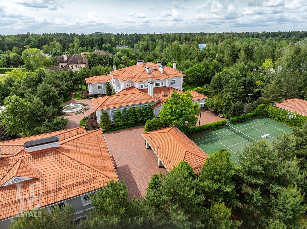 На лесном участке в 74 сотки расположен основной дом 1300 кв.м с шестью спальнями, просторной гостиной, каминным залом и выходом в зимний сад, где зелень растений радует круглый год, бассейном, спа зоной, тренажерным залом, библиотекой, кинотеатром и многочисленными помещениями для досуга. На территории усадьбы расположены: отдельно стоящая деревянная баня и дом для приема гостей c отдельной барбекю зоной, двухэтажный дом для персонала, совмещенный с гостевым домом, гараж для специализированной техники, навес для автомобилей, ротонда, круглогодичная теплица, теннисный корт. На участке выполнен ландшафтный дизайн по индивидуальному проекту. Сделан дренаж, установлена системы автополива, выведено зонированное уличное освещение, в центральной части перед парадным входом установлен фонтан, часть участка занимает плодовый сад (яблони, вишни, груши, плодовые кустарники). На участке бережно сохранены многолетние дубы и сосны.