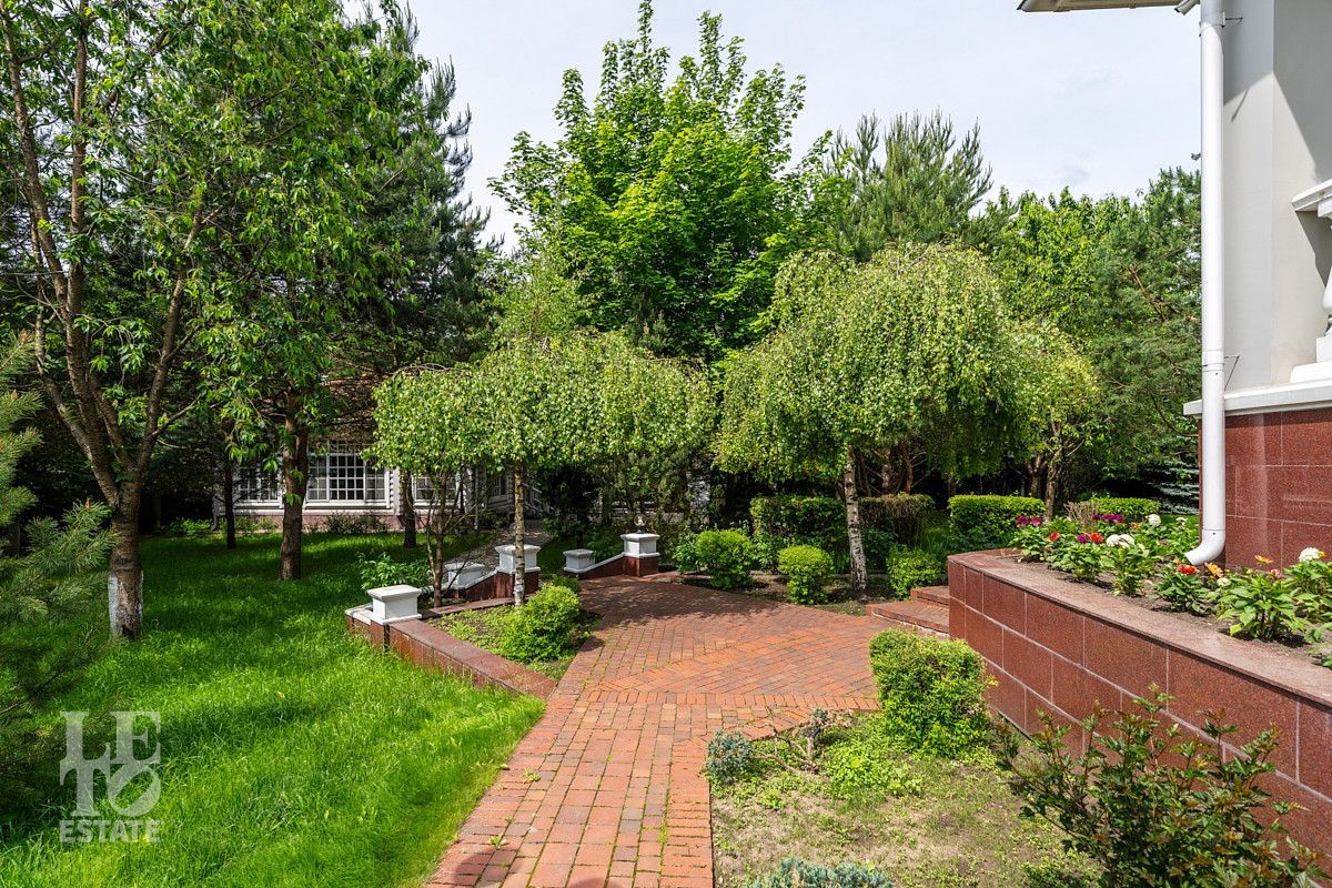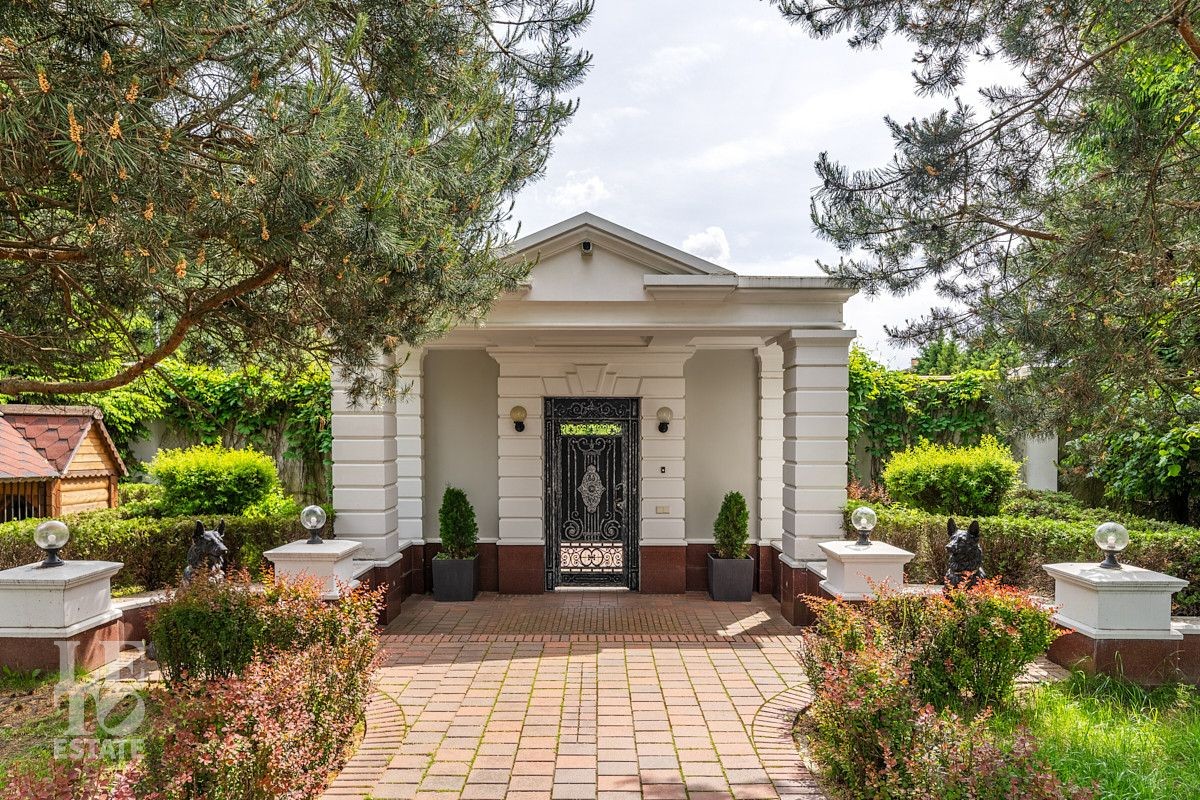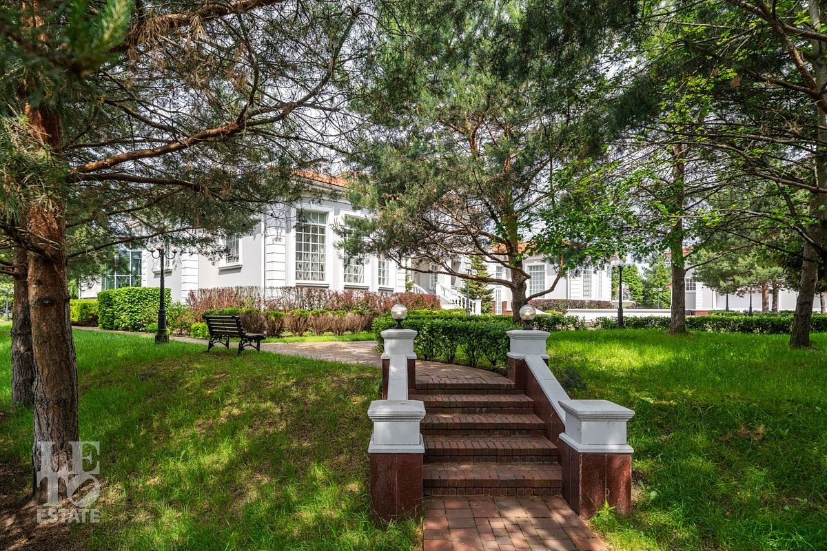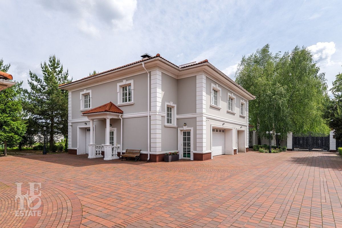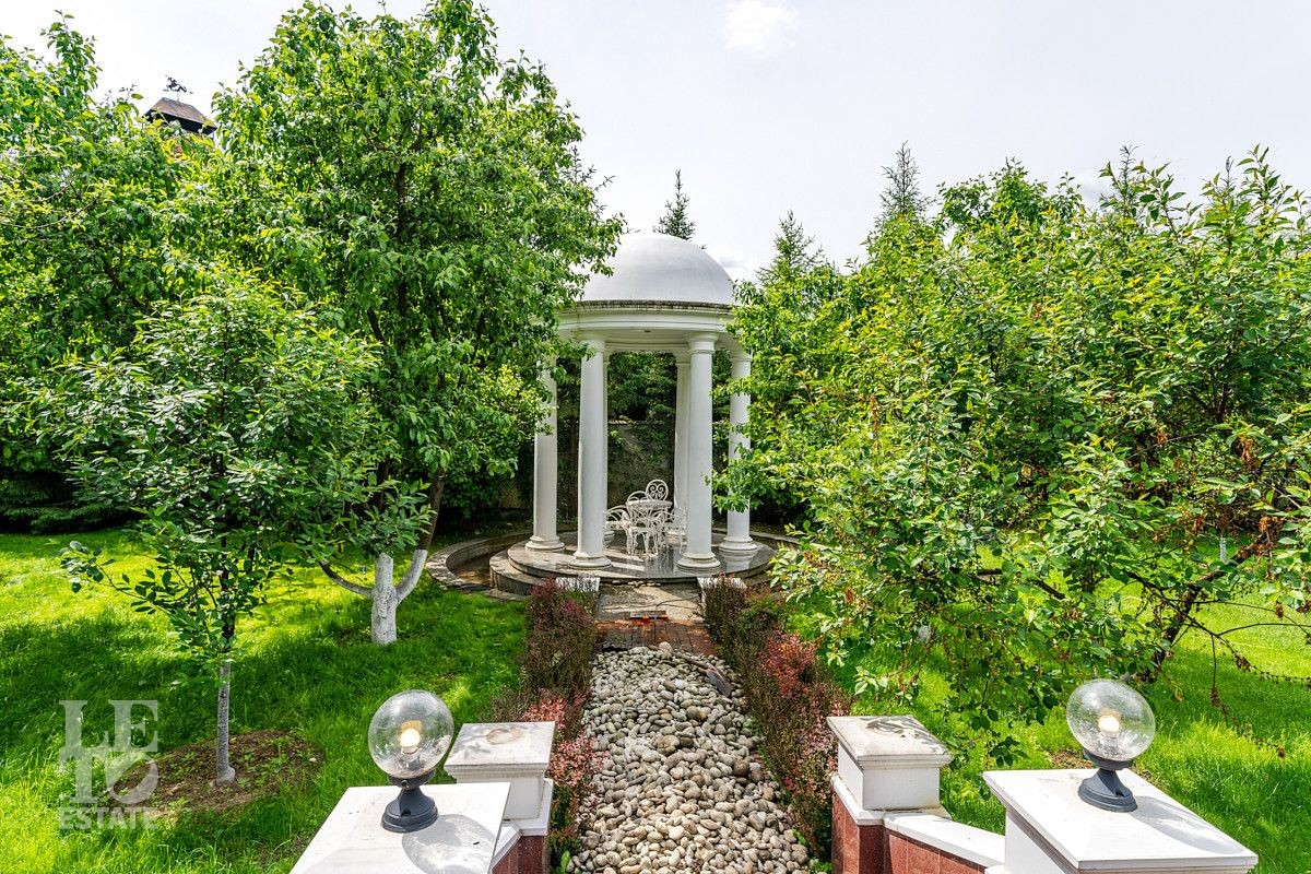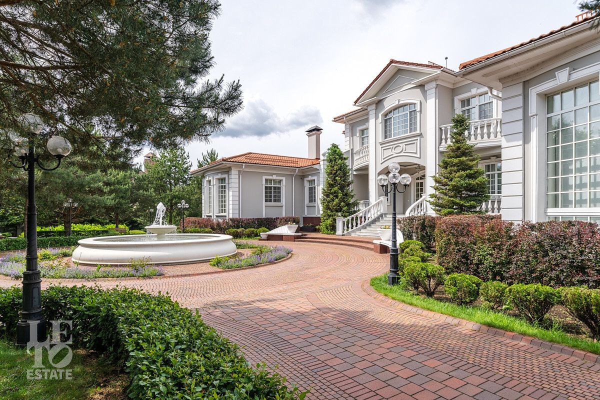 На лесном участке в 74 сотки расположен основной дом 1300 кв.м с шестью спальнями, просторной гостиной, каминным залом и выходом в зимний сад, где зелень растений радует круглый год, бассейном, спа зоной, тренажерным залом, библиотекой, кинотеатром и многочисленными помещениями для досуга. На территории усадьбы расположены: отдельно стоящая деревянная баня и дом для приема гостей c отдельной барбекю зоной, двухэтажный дом для персонала, совмещенный с гостевым домом, гараж для специализированной техники, навес для автомобилей, ротонда, круглогодичная теплица, теннисный корт. На участке выполнен ландшафтный дизайн по индивидуальному проекту. Сделан дренаж, установлена системы автополива, выведено зонированное уличное освещение, в центральной части перед парадным входом установлен фонтан, часть участка занимает плодовый сад (яблони, вишни, груши, плодовые кустарники). На участке бережно сохранены многолетние дубы и сосны.