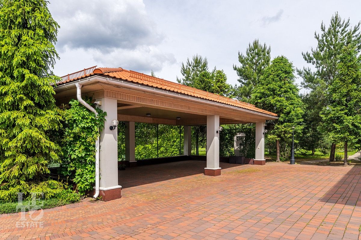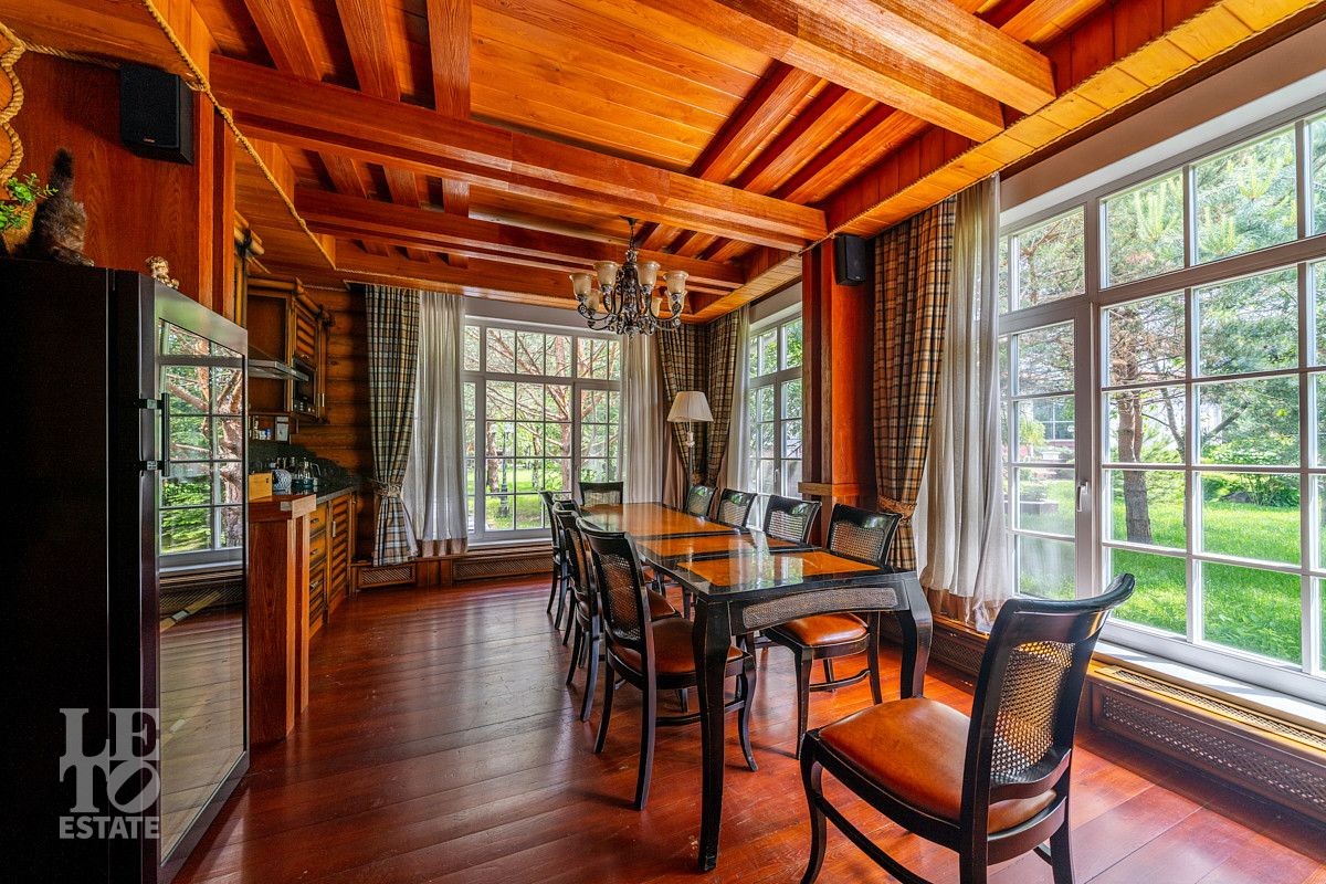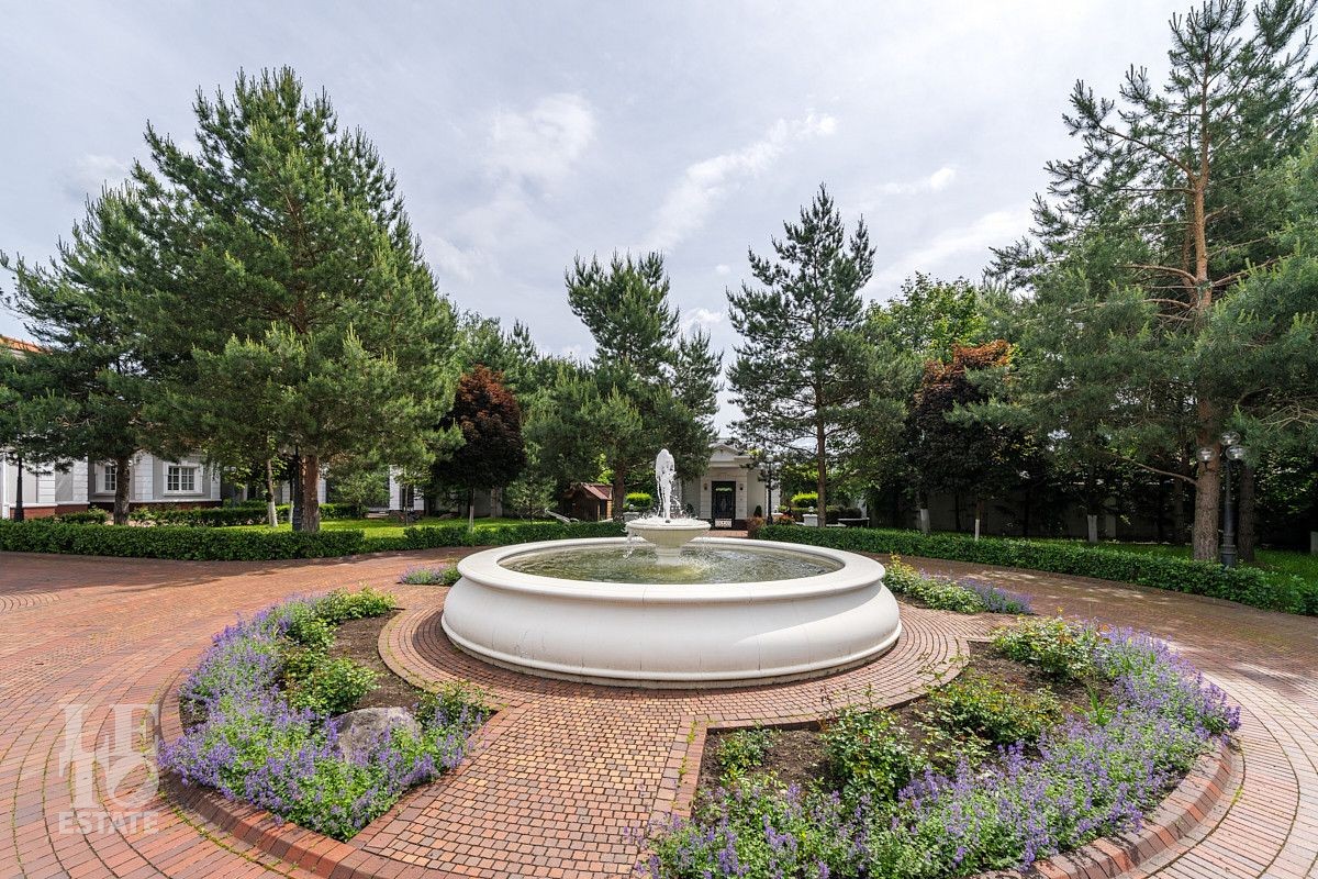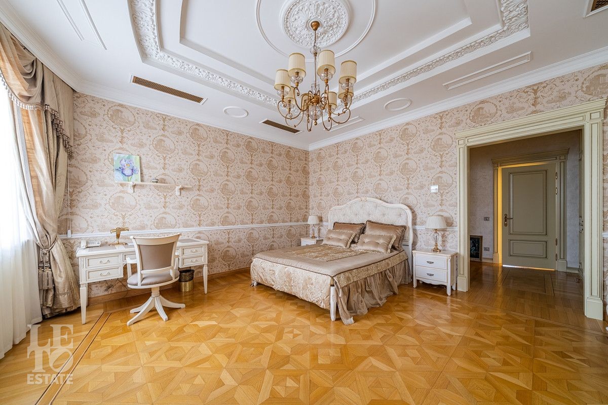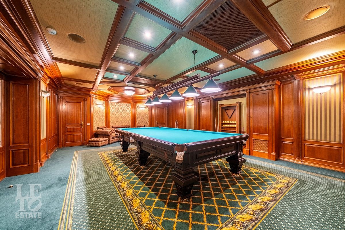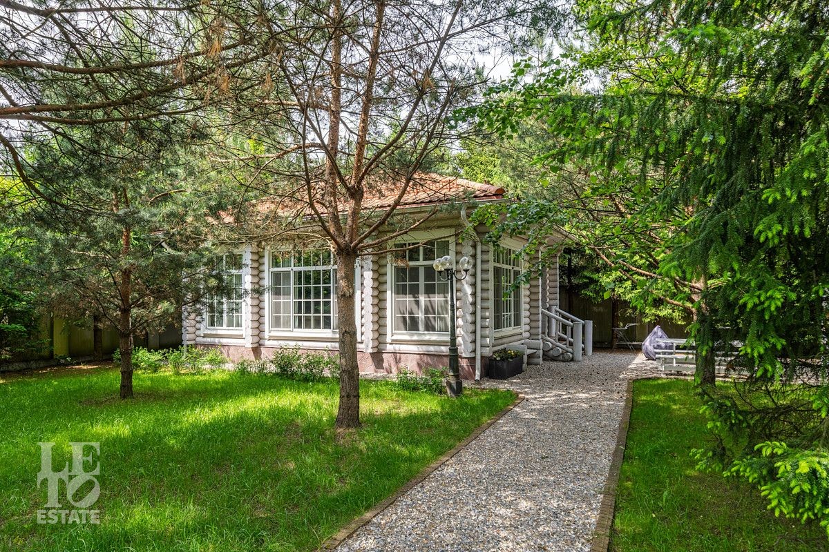На лесном участке в 74 сотки расположен основной дом 1300 кв.м с шестью спальнями, просторной гостиной, каминным залом и выходом в зимний сад, где зелень растений радует круглый год, бассейном, спа зоной, тренажерным залом, библиотекой, кинотеатром и многочисленными помещениями для досуга. На территории усадьбы расположены: отдельно стоящая деревянная баня и дом для приема гостей c отдельной барбекю зоной, двухэтажный дом для персонала, совмещенный с гостевым домом, гараж для специализированной техники, навес для автомобилей, ротонда, круглогодичная теплица, теннисный корт. На участке выполнен ландшафтный дизайн по индивидуальному проекту. Сделан дренаж, установлена системы автополива, выведено зонированное уличное освещение, в центральной части перед парадным входом установлен фонтан, часть участка занимает плодовый сад (яблони, вишни, груши, плодовые кустарники). На участке бережно сохранены многолетние дубы и сосны.
