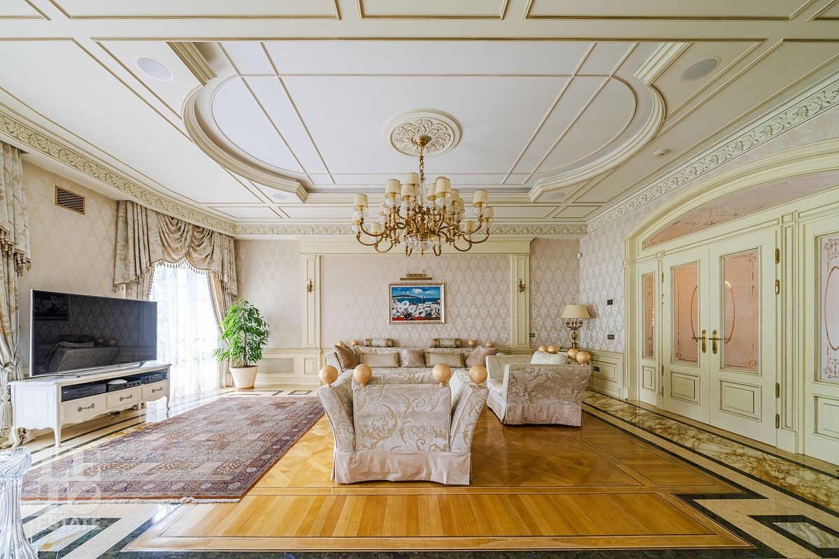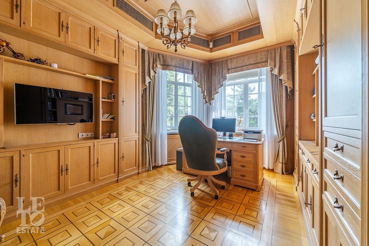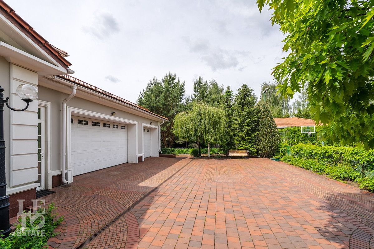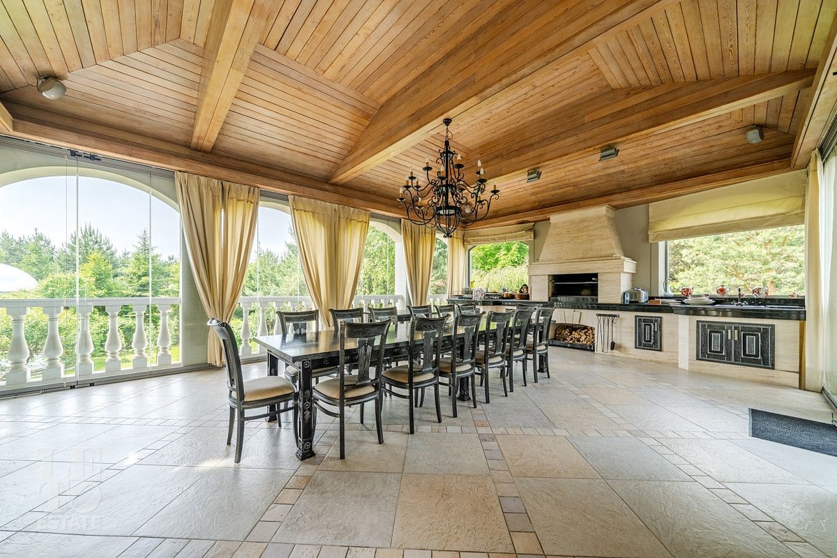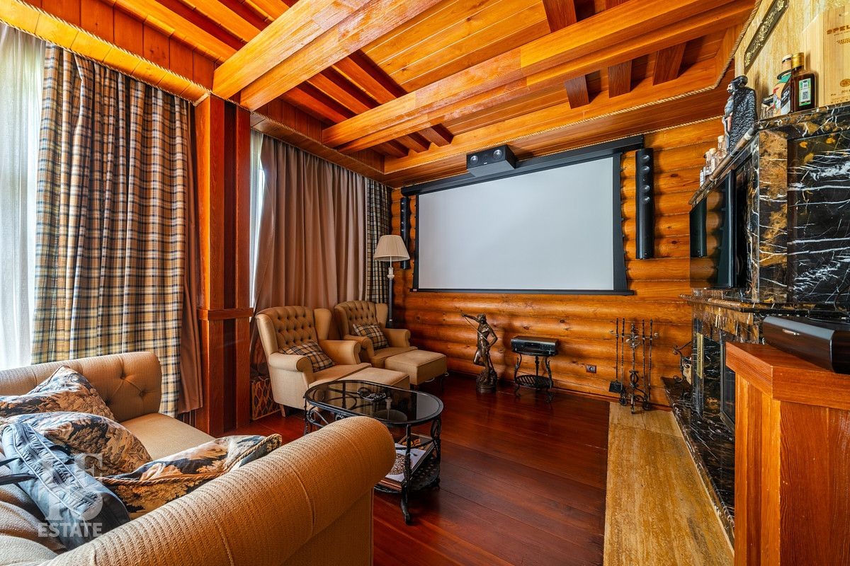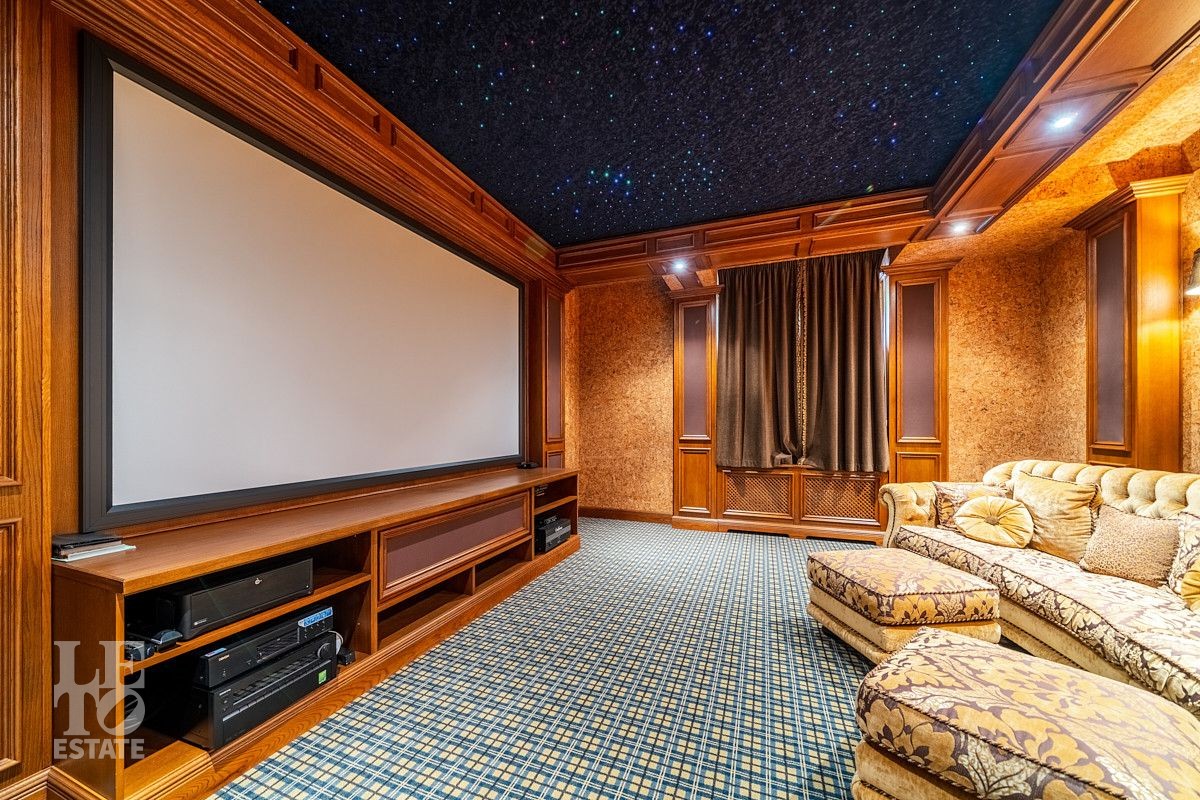 На лесном участке в 74 сотки расположен основной дом 1300 кв.м с шестью спальнями, просторной гостиной, каминным залом и выходом в зимний сад, где зелень растений радует круглый год, бассейном, спа зоной, тренажерным залом, библиотекой, кинотеатром и многочисленными помещениями для досуга. На территории усадьбы расположены: отдельно стоящая деревянная баня и дом для приема гостей c отдельной барбекю зоной, двухэтажный дом для персонала, совмещенный с гостевым домом, гараж для специализированной техники, навес для автомобилей, ротонда, круглогодичная теплица, теннисный корт. На участке выполнен ландшафтный дизайн по индивидуальному проекту. Сделан дренаж, установлена системы автополива, выведено зонированное уличное освещение, в центральной части перед парадным входом установлен фонтан, часть участка занимает плодовый сад (яблони, вишни, груши, плодовые кустарники). На участке бережно сохранены многолетние дубы и сосны.