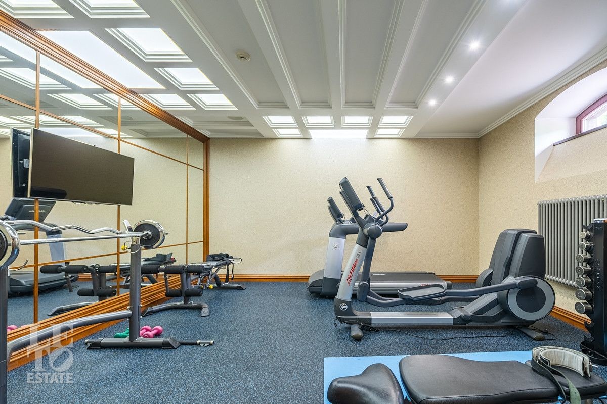 Цоколь: инженерная комната, профессиональная холодильная камера для хранения продуктов, винный погреб, постирочная, спортивный зал, зал для тенниса, игровая комната для детей с кинотеатром, комната отдыха, бильярдная, сейфовая и оружейная комната, санузел, мастерская, кладовые и технические помещения;
