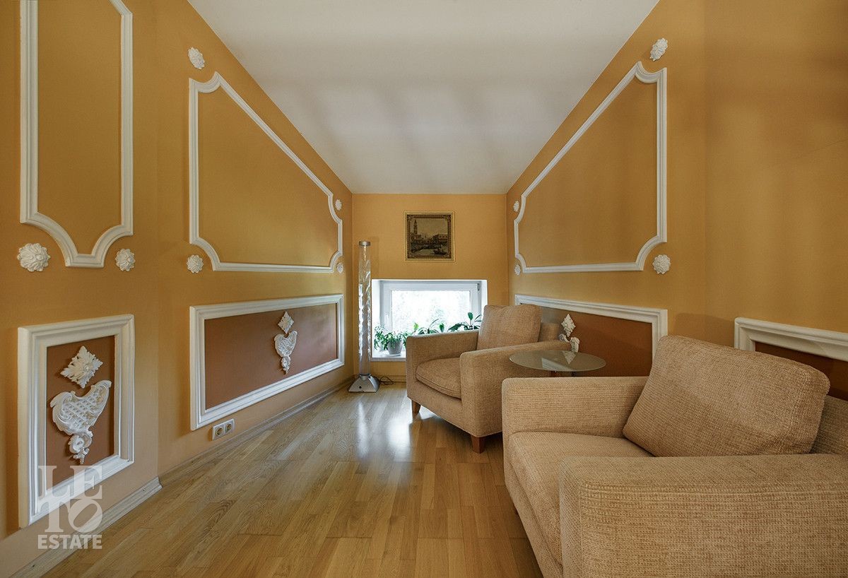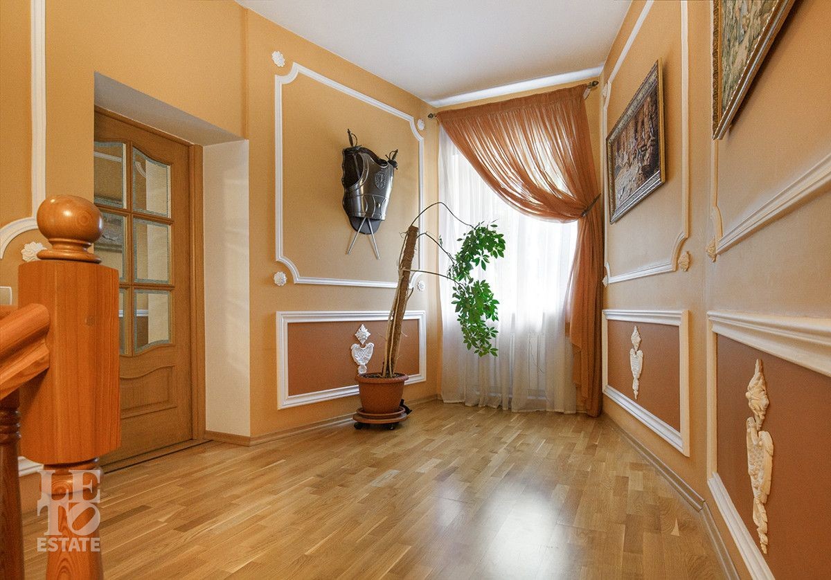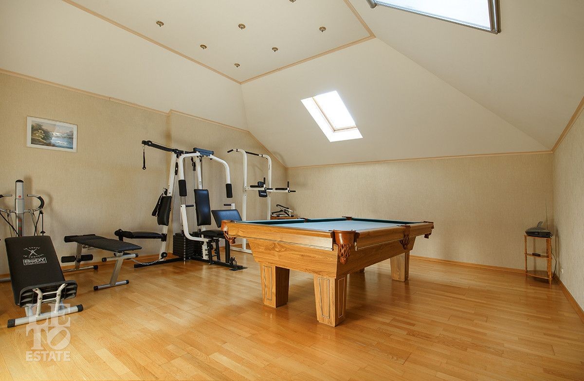 Цокольный этаж : комната отдыха , сауна с бассейном ,санузел, комната хранения, котельная; Первый этаж: гараж, прихожая, холл, гостевой санузел, зона гостиной с камином, кухня , терраса; Второй этаж : холл, три спальни, санузел, кабинет ; Третий этаж: холл, бильярдная-спорт зал.