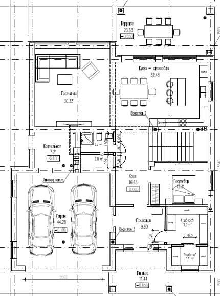 Планировка: Первый этаж: гостиная-столовая с панорамным остеклением и выходом на открытую террасу, прихожая, гостевая комната, санузел, гардеробная, бойлерная, кладовая, гараж на 2 м/м; Второй этаж: мастер-спальня с ванной комнатой, гардеробной, 3 спальни с ванными комнатами и гардеробные.