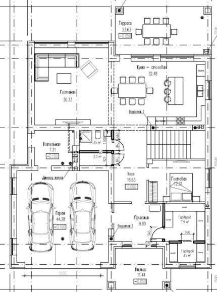 Первый этаж: гостиная-столовая с панорамным остеклением и выходом на открытую террасу, прихожая, гостевая комната, санузел, гардеробная, бойлерная, кладовая, гараж на два м/м;