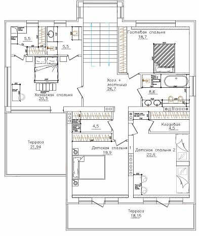 Второй этаж: мастер-спальня с ванной комнатой, гардеробной и выходом на террасу, 3 спальни с ванными комнатами и гардеробными, из спален есть выход на террасу.
