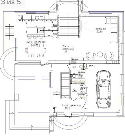 Первый этаж - гостиная-столовая, прихожая, гостевая комната, санузел, гардеробная, бойлерная, кладовая, гараж на 1 автомобиль;