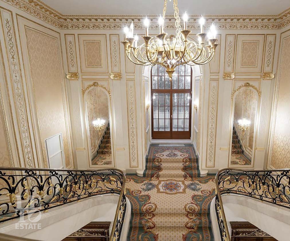 Парадная лестница — центральный элемент с уникальными кованными перилами, ручной работы, сусально-золотого покрытия, в стиле Ренессанс и Барокко.