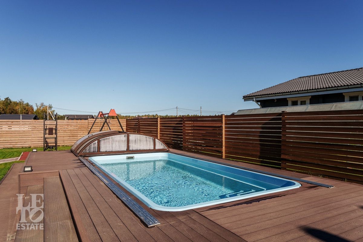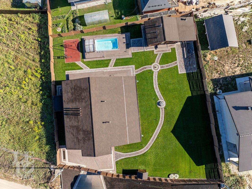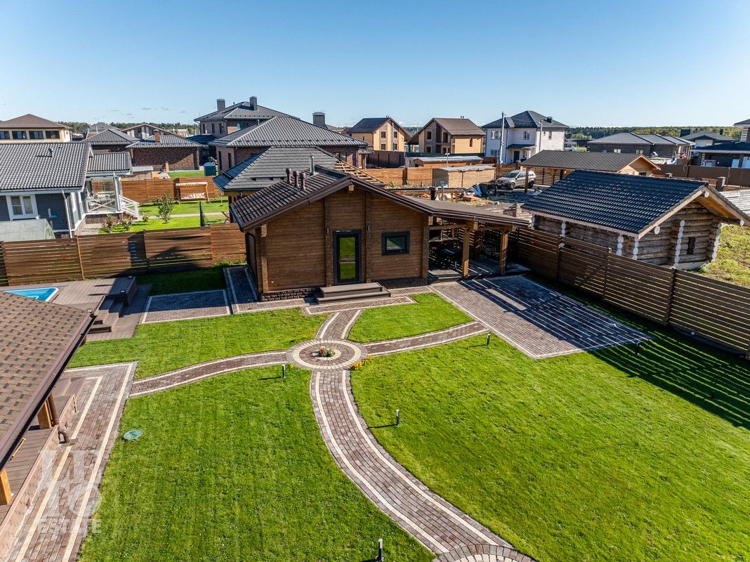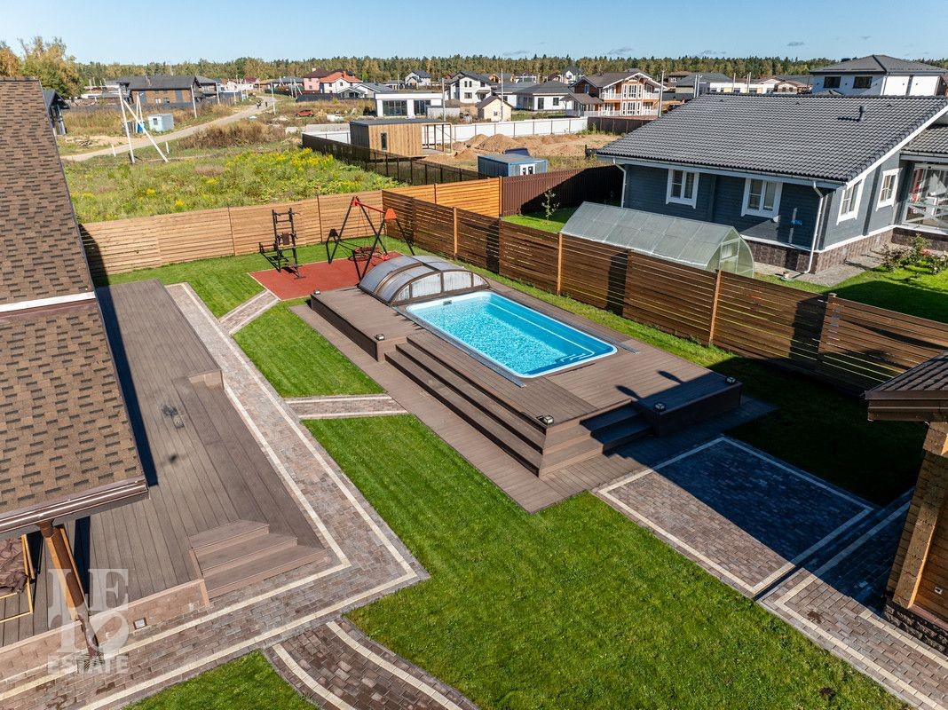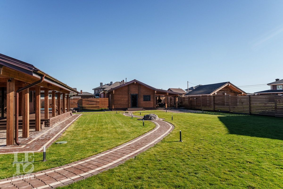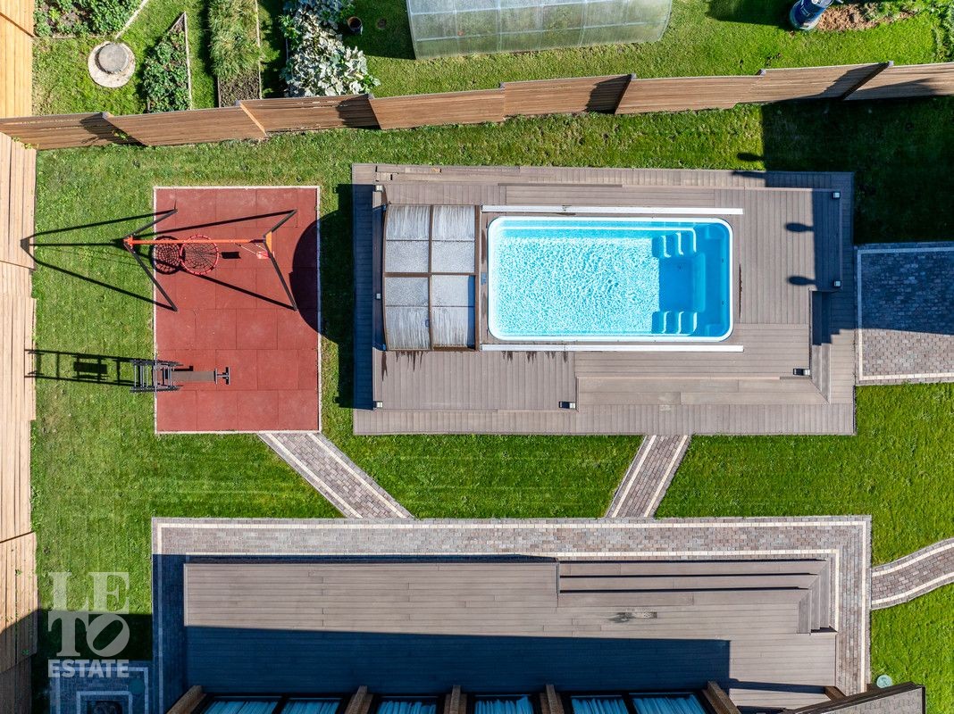 Благоустроенный участок, окружен деревянным забором и оформлен в соответствии с ландшафтным дизайном, установлены уличные фонари и вымощены дорожки. Дополнительно на территории расположены: уличный бассейн с подогревом, удобная мангальная зона примыкает к банному комплексу под навесом, спортивная площадка и качели – все располагает для отдыха и приятного времяпрепровождения.