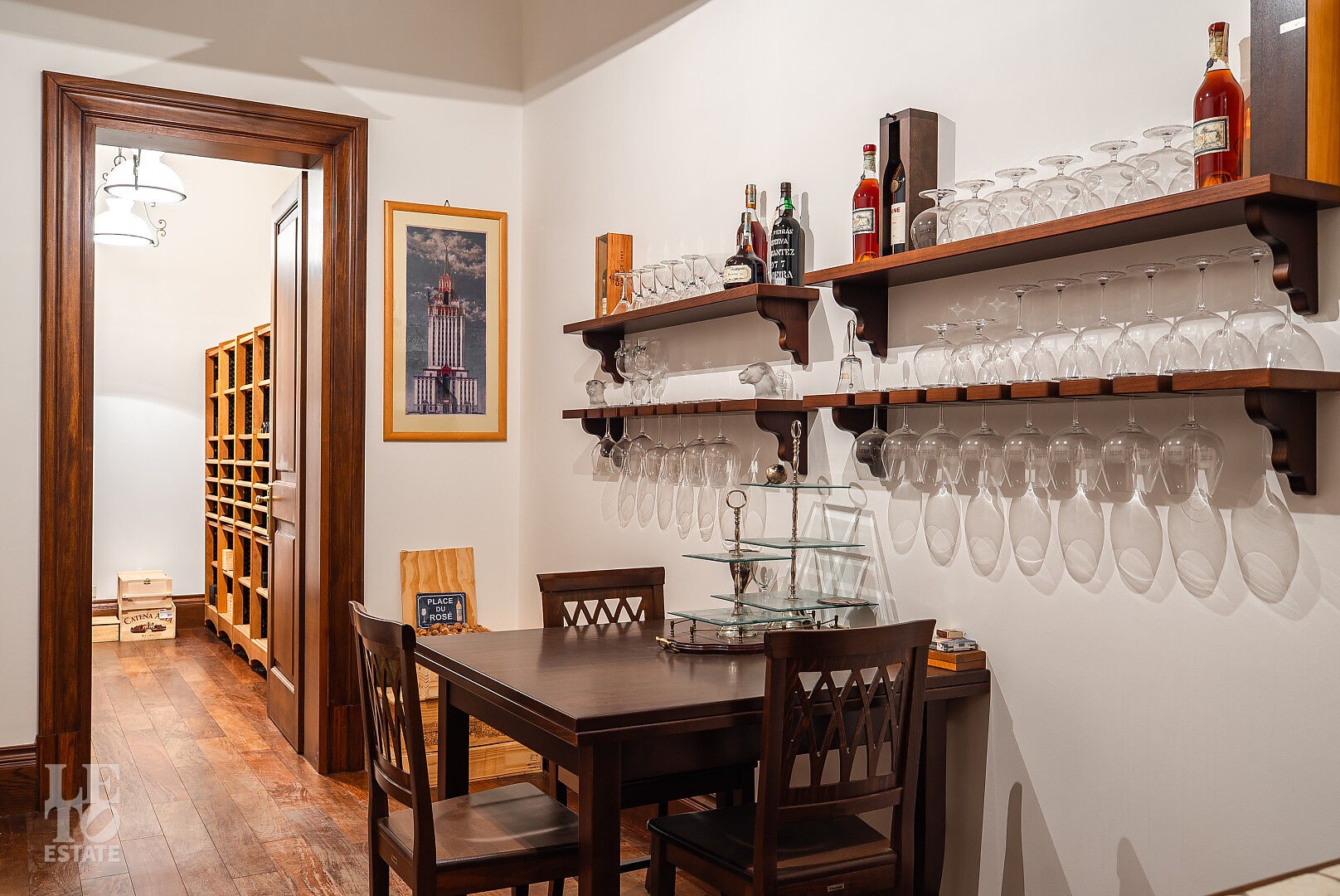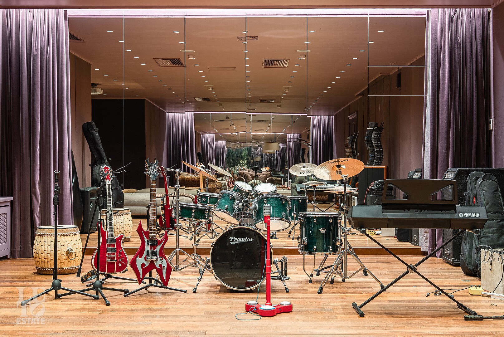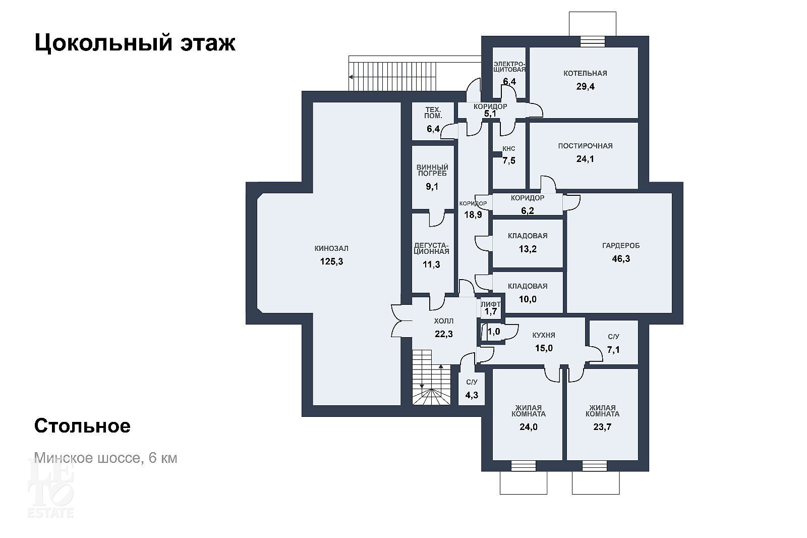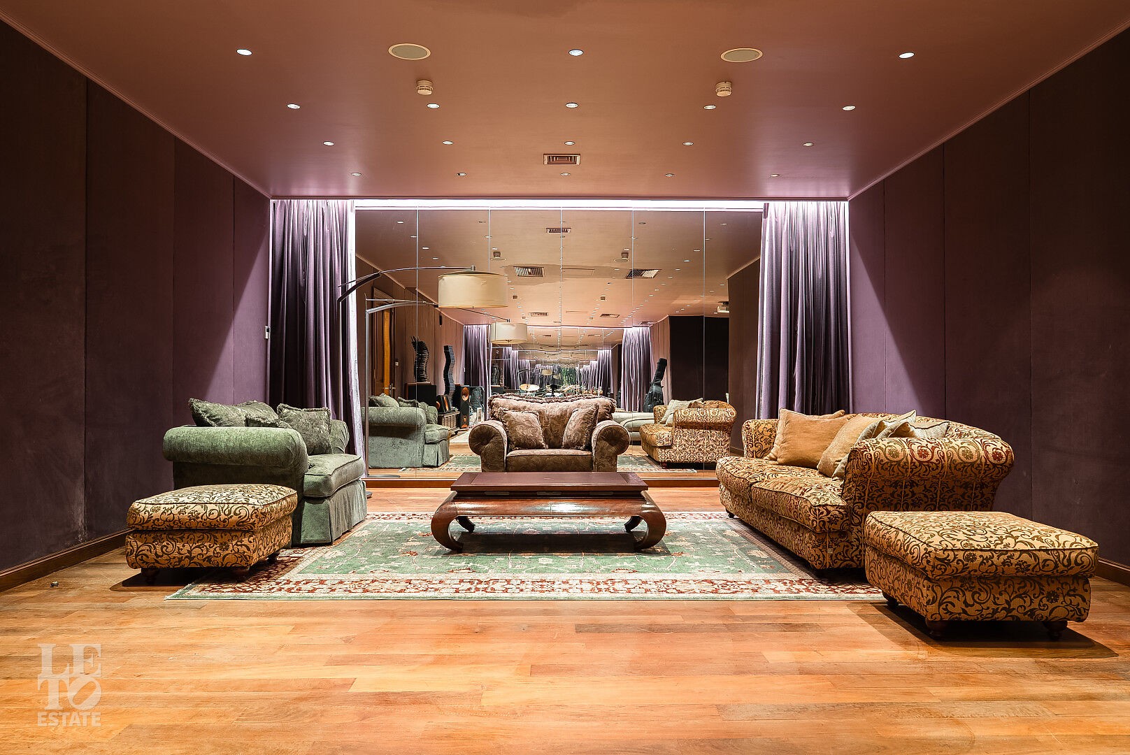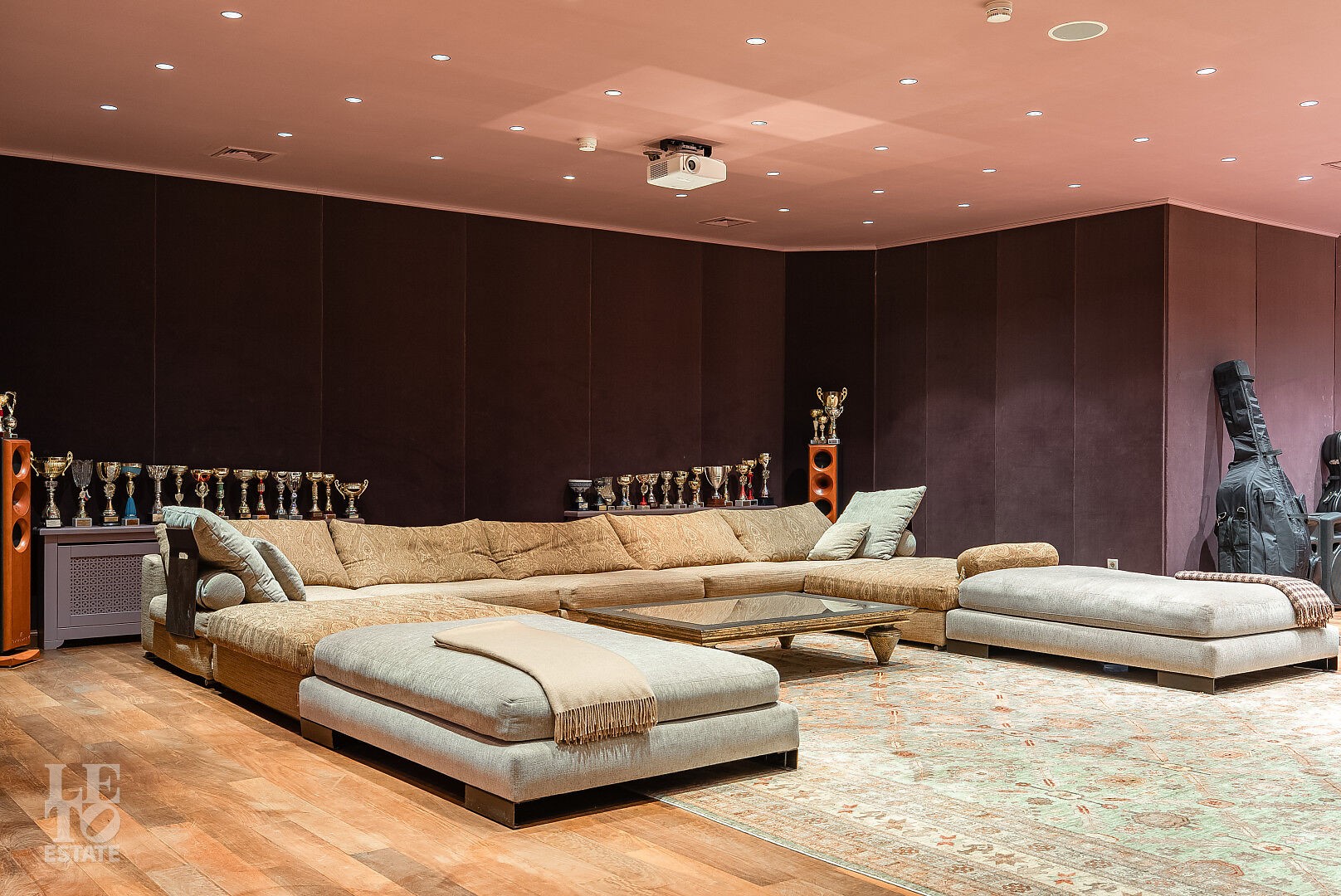 Цокольный этаж: киногостиная с танцевальной зоной и репетиционной базой, винный погреб с дегустационной комнатой, квартира для персонала (2 спальни, кухня, ванная комната), с/у, сезонная гардеробная, кладовые и технические помещения, лифт.