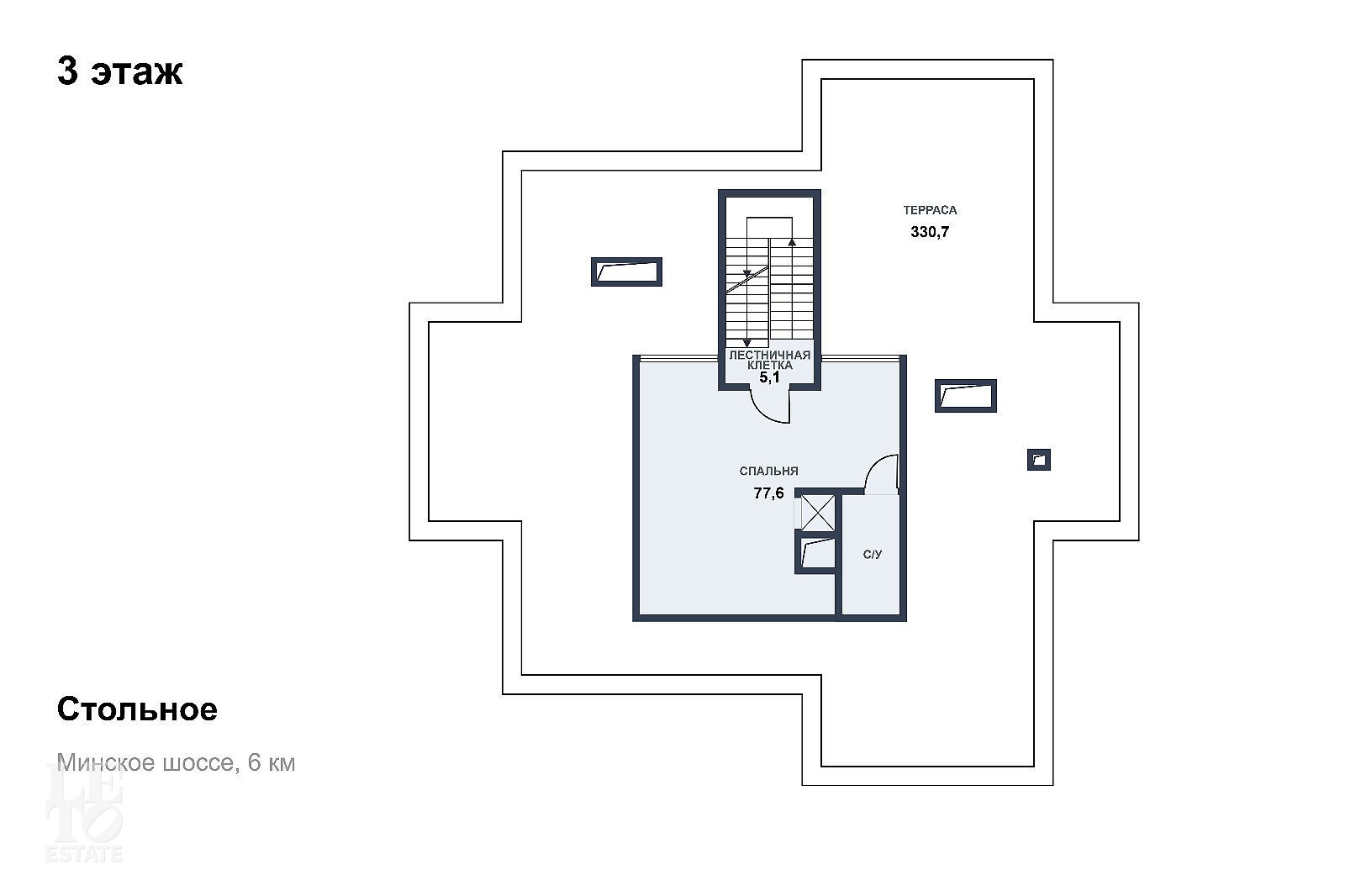 На мансардном этаже находится панорамная терраса, с которой открывается захватывающий вид, создающий атмосферу умиротворения.