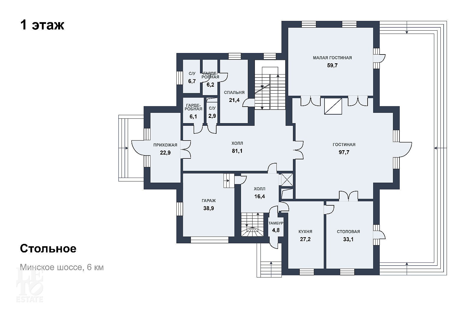 Первый этаж: прихожая, травертиновый холл, гардеробная, гостевой с/у с гардеробной и ванной комнатой, большой гостиный зал с камином, малая гостиная, столовая, кухня, гостевая спальня, гараж, лифт.