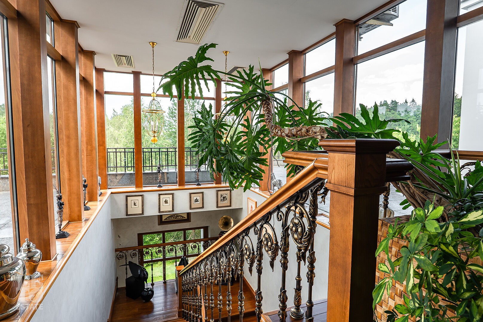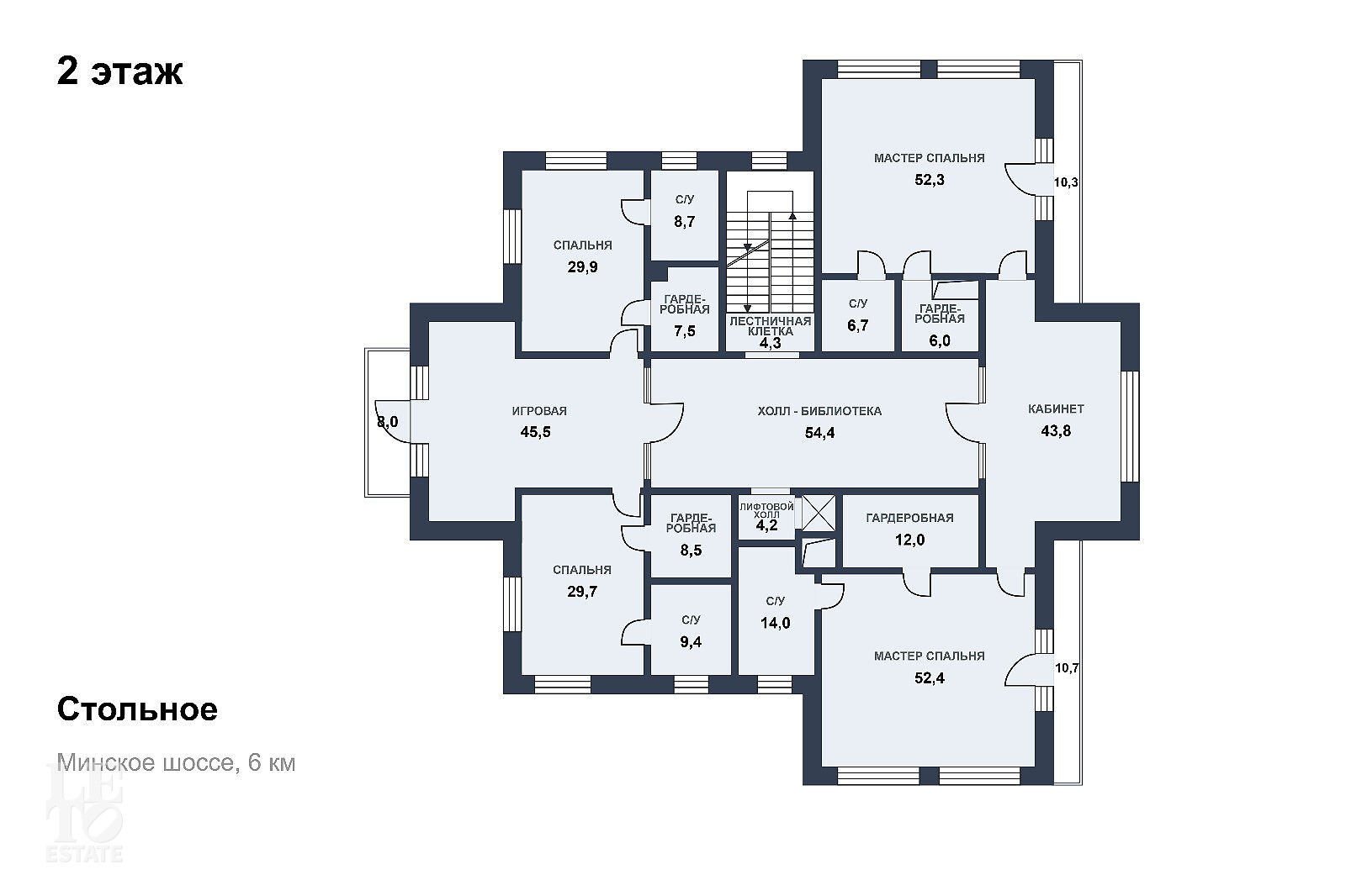 Второй этаж: библиотека, кабинет с печкой-буржуйкой, 4 спальни с гардеробными и с/у, хобби-комната / игровая, балконы, лифт.