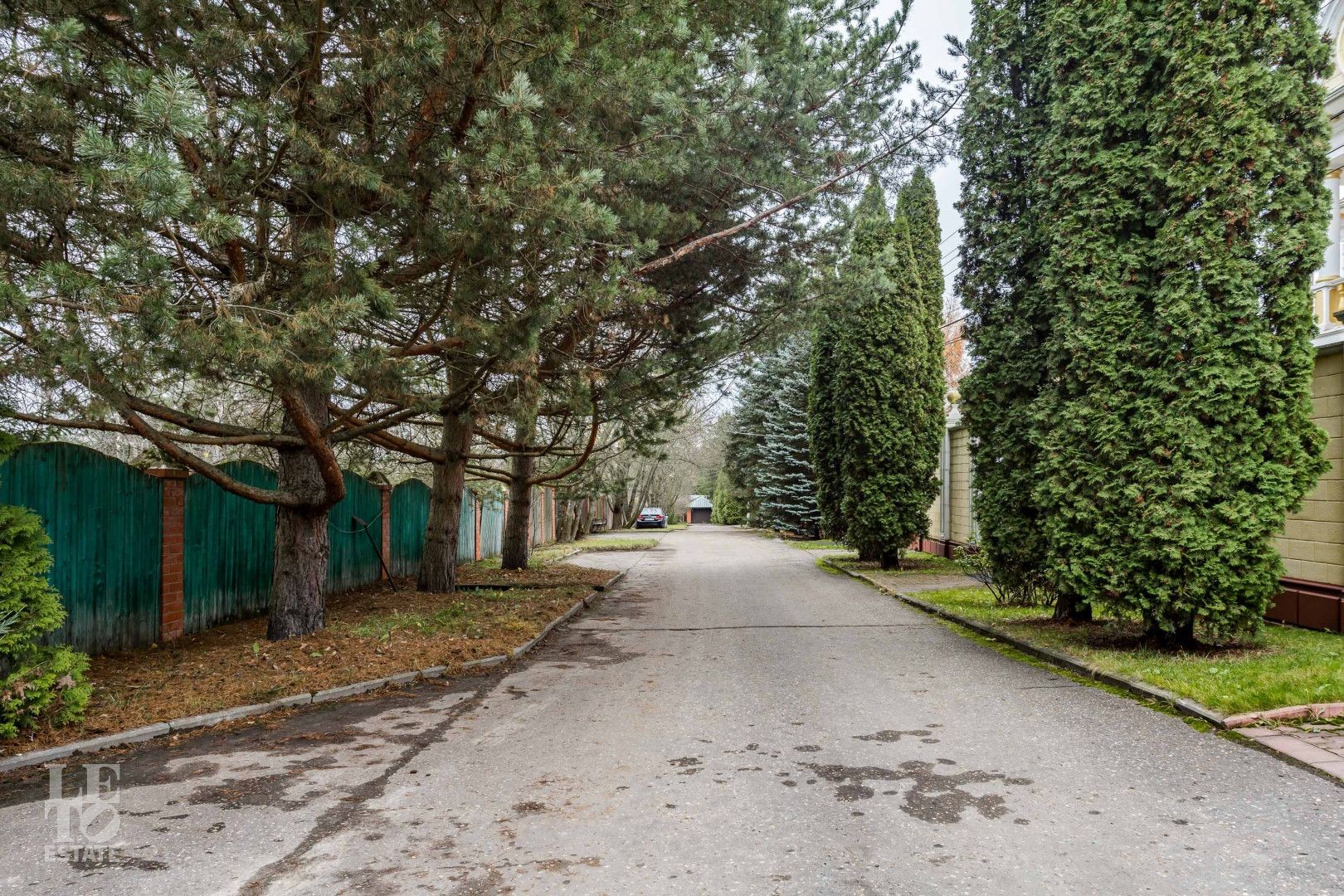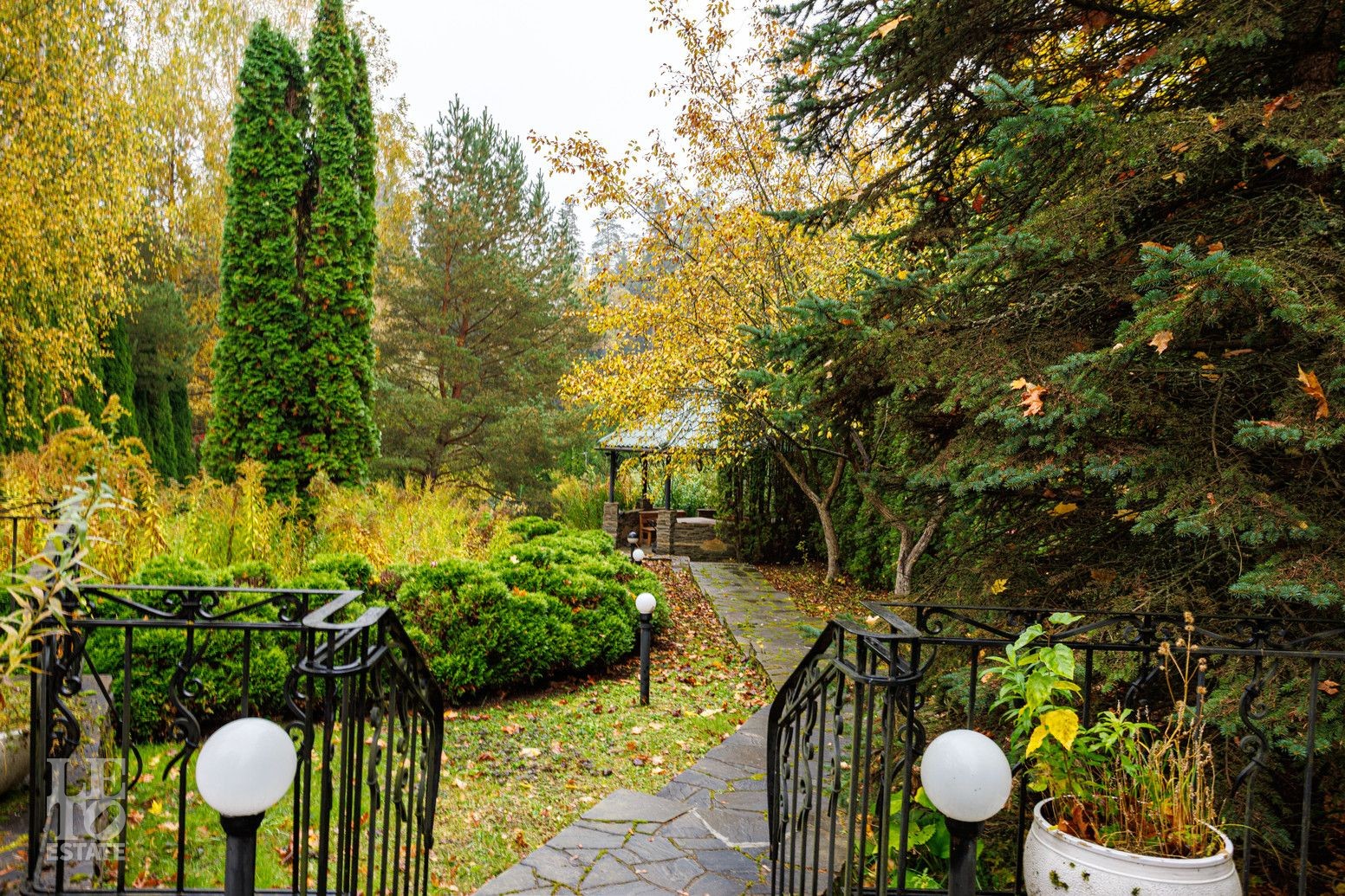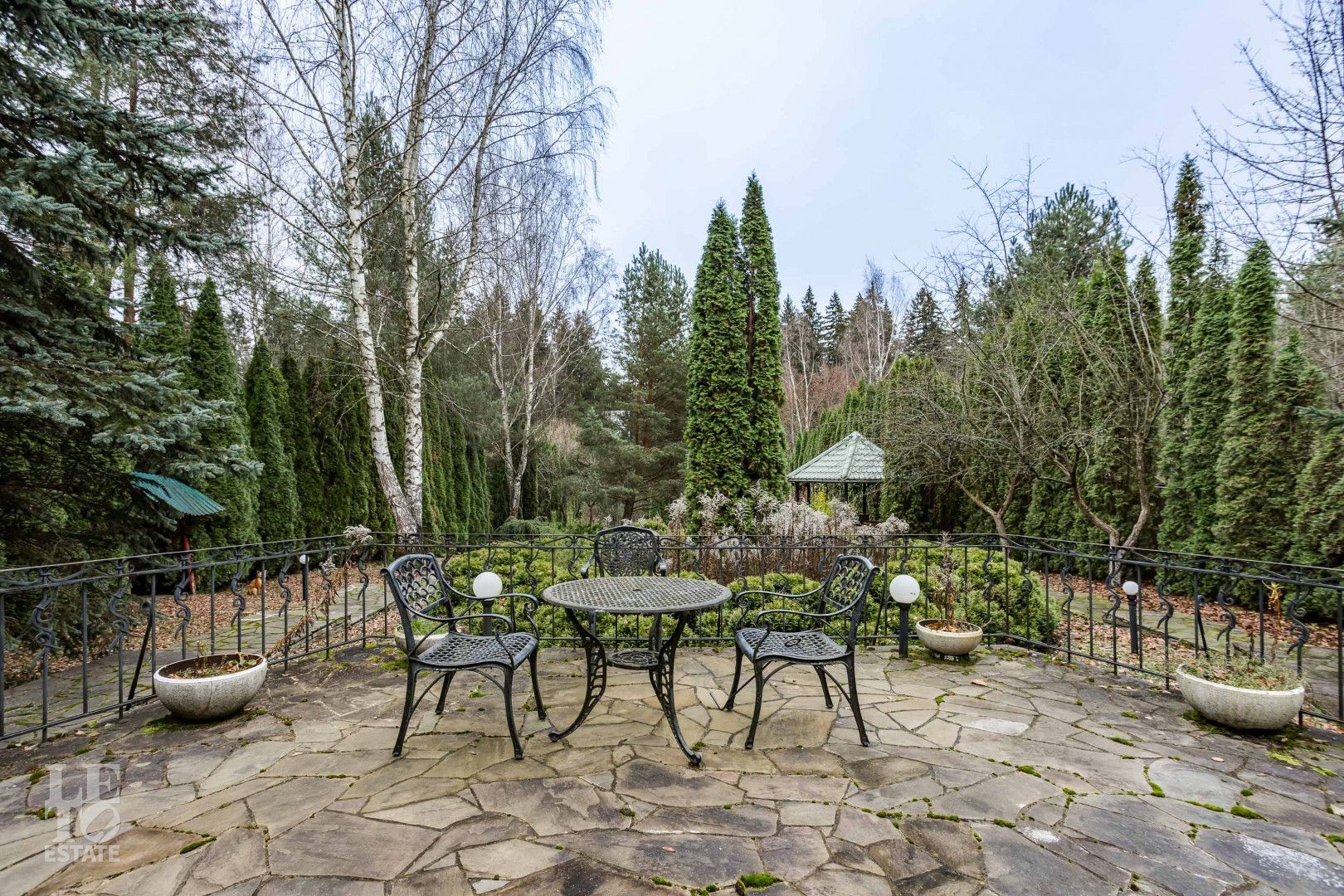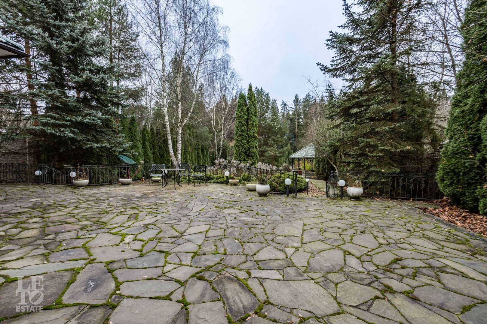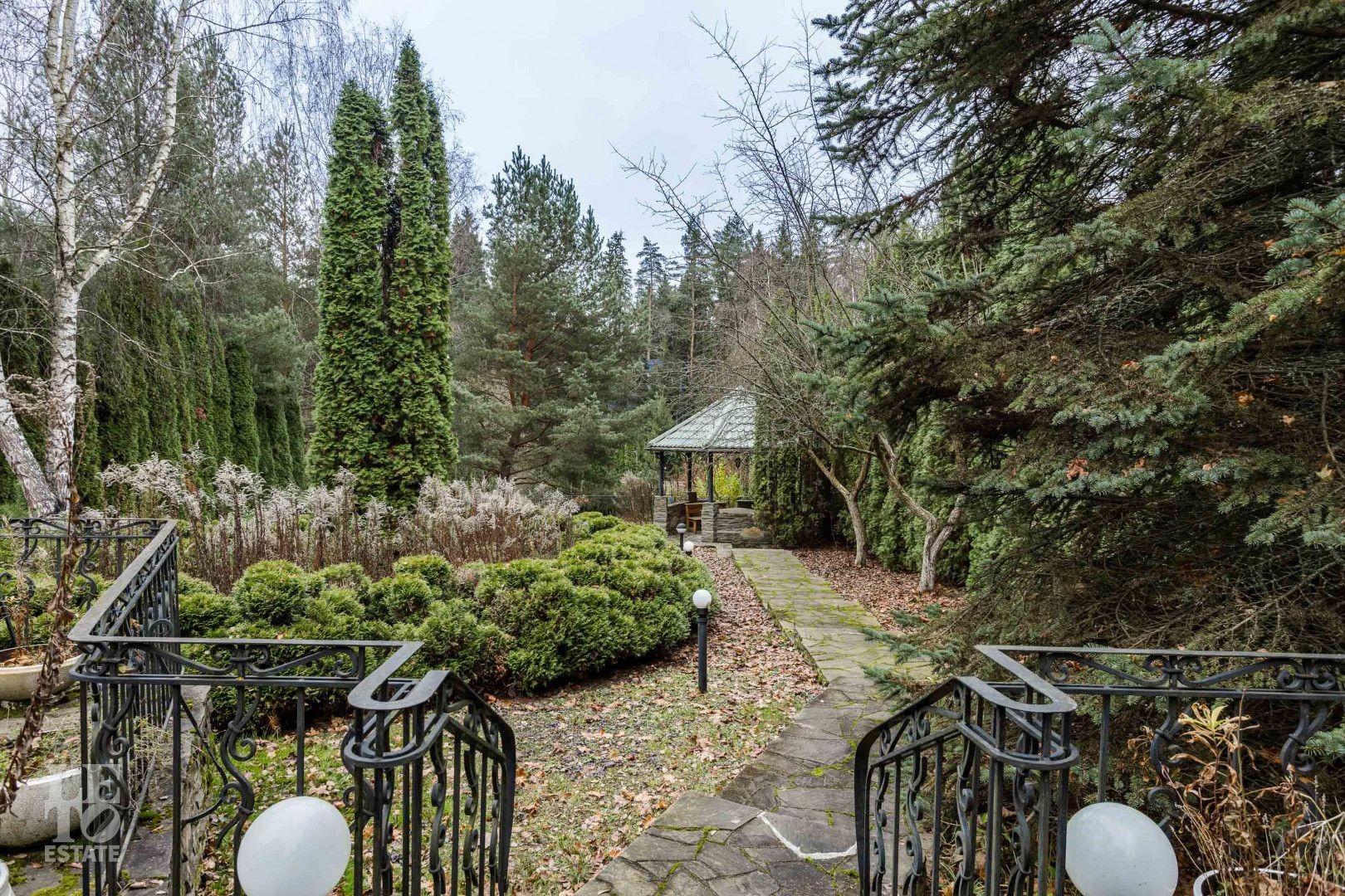 Выполнен ландшафтный дизайн, вымощены дорожки натуральным камнем, по всему периметру высажены огромные туи, на участке сосны и ели, освещение, беседка, площадка для барбекю, домик для персонала, пруд.