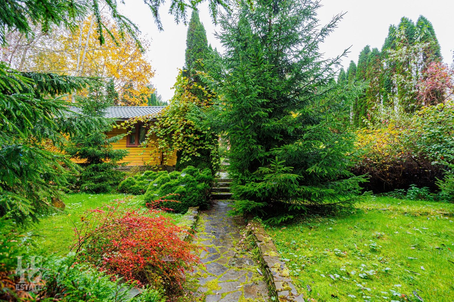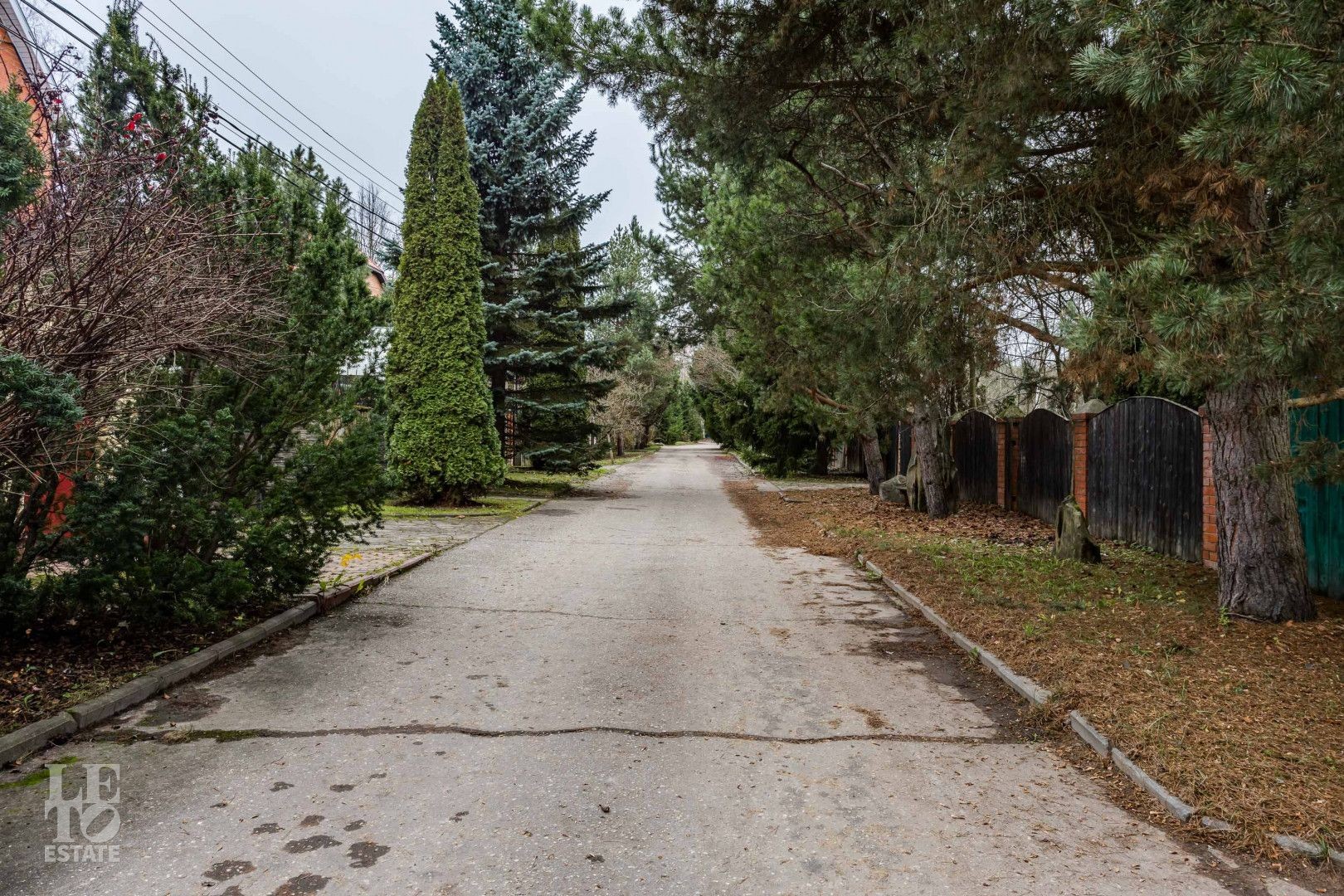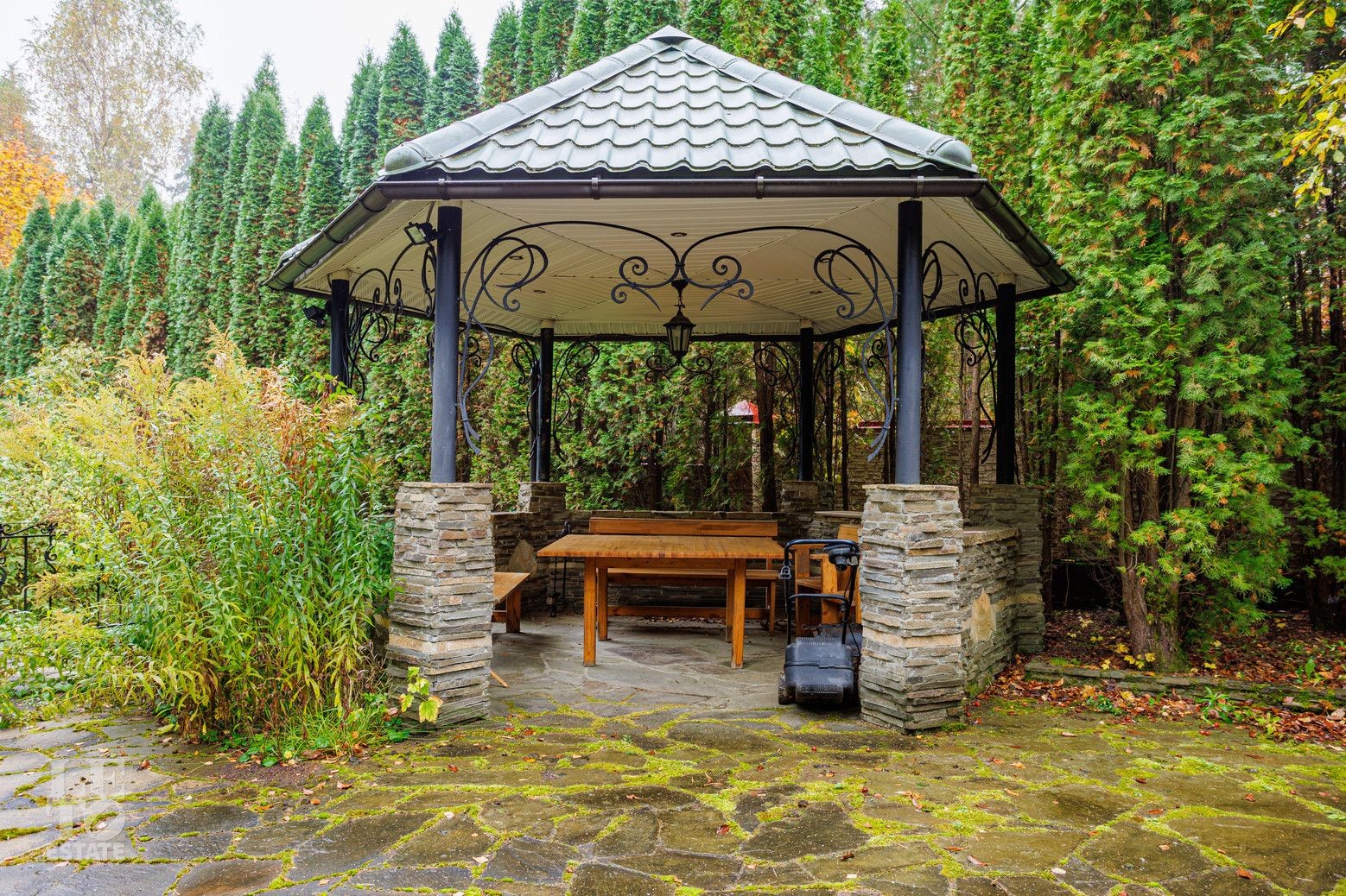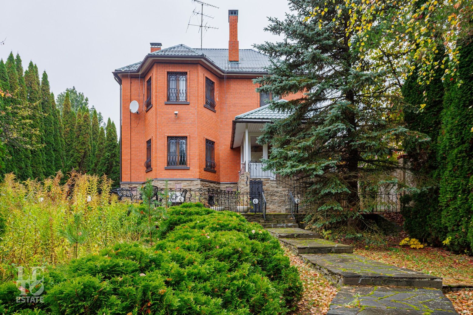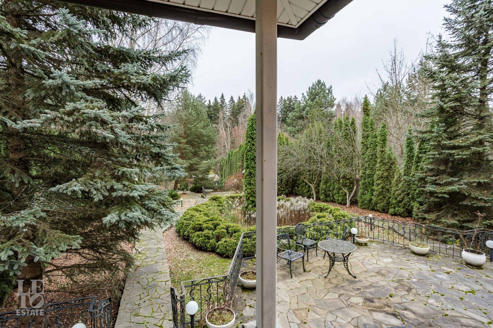 Выполнен ландшафтный дизайн, вымощены дорожки натуральным камнем, по всему периметру высажены огромные туи, на участке сосны и ели, освещение, беседка, площадка для барбекю, домик для персонала, пруд.