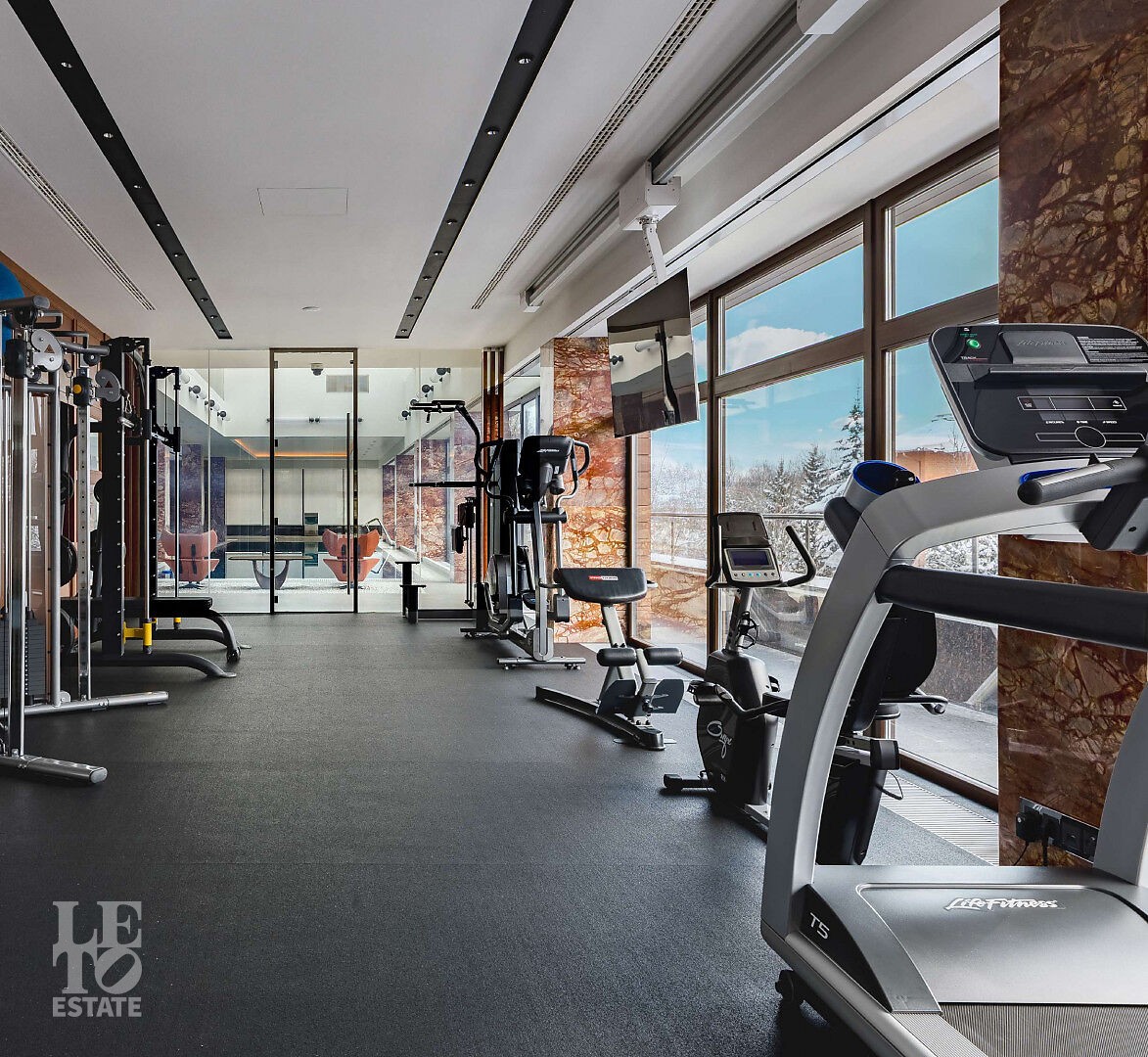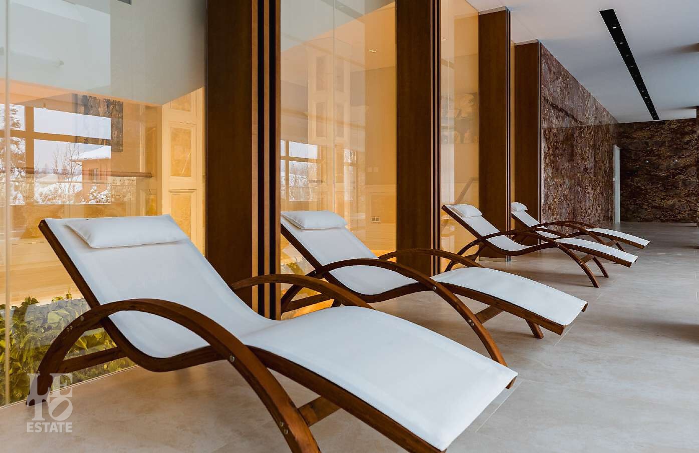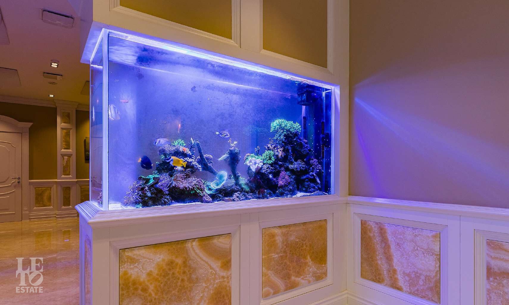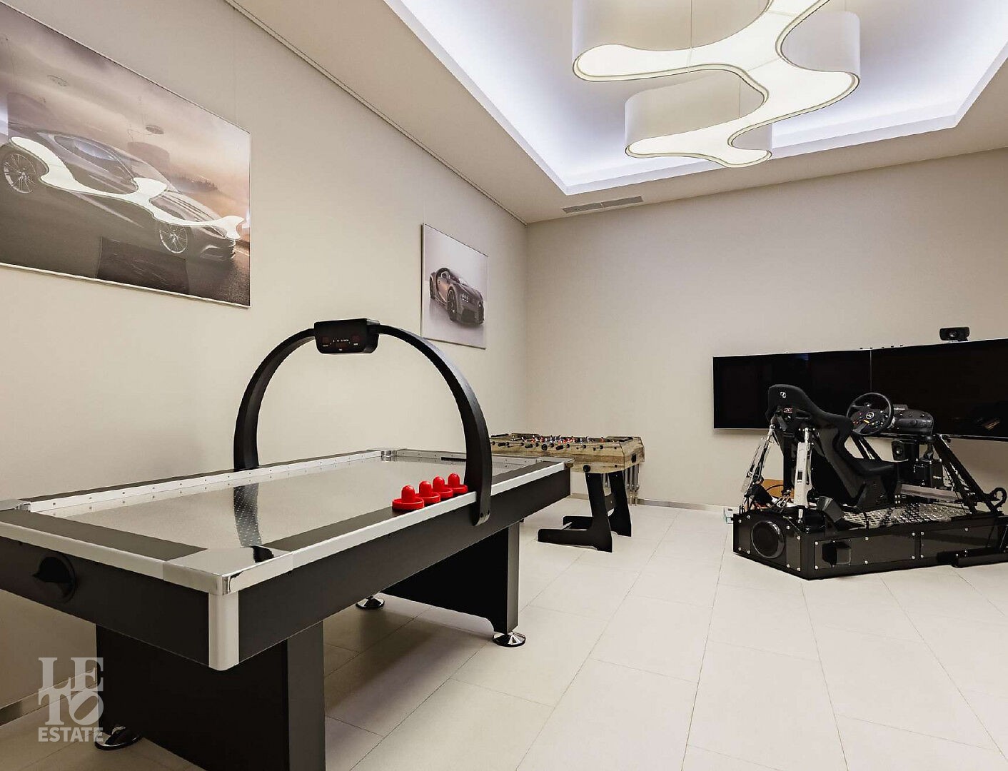 Второй этаж: мастер-спальня с 2 санузлами и 2 гардеробными, мастер-спальня с санузлом и гардеробной, бассейн 25×5 м, спортзал, массажная, сауна, хамам, мини-кухня, раздевалка, аквариумы с морской водой и настоящими кораллами, серверная.