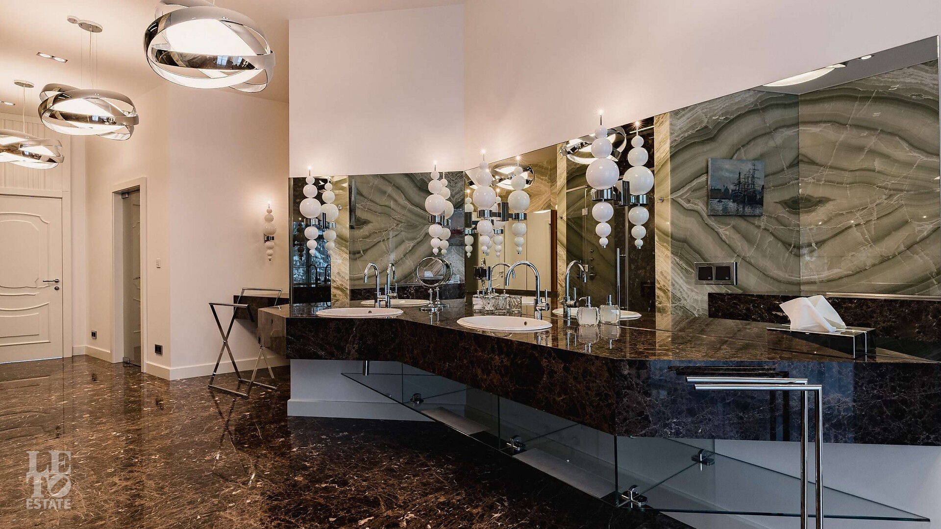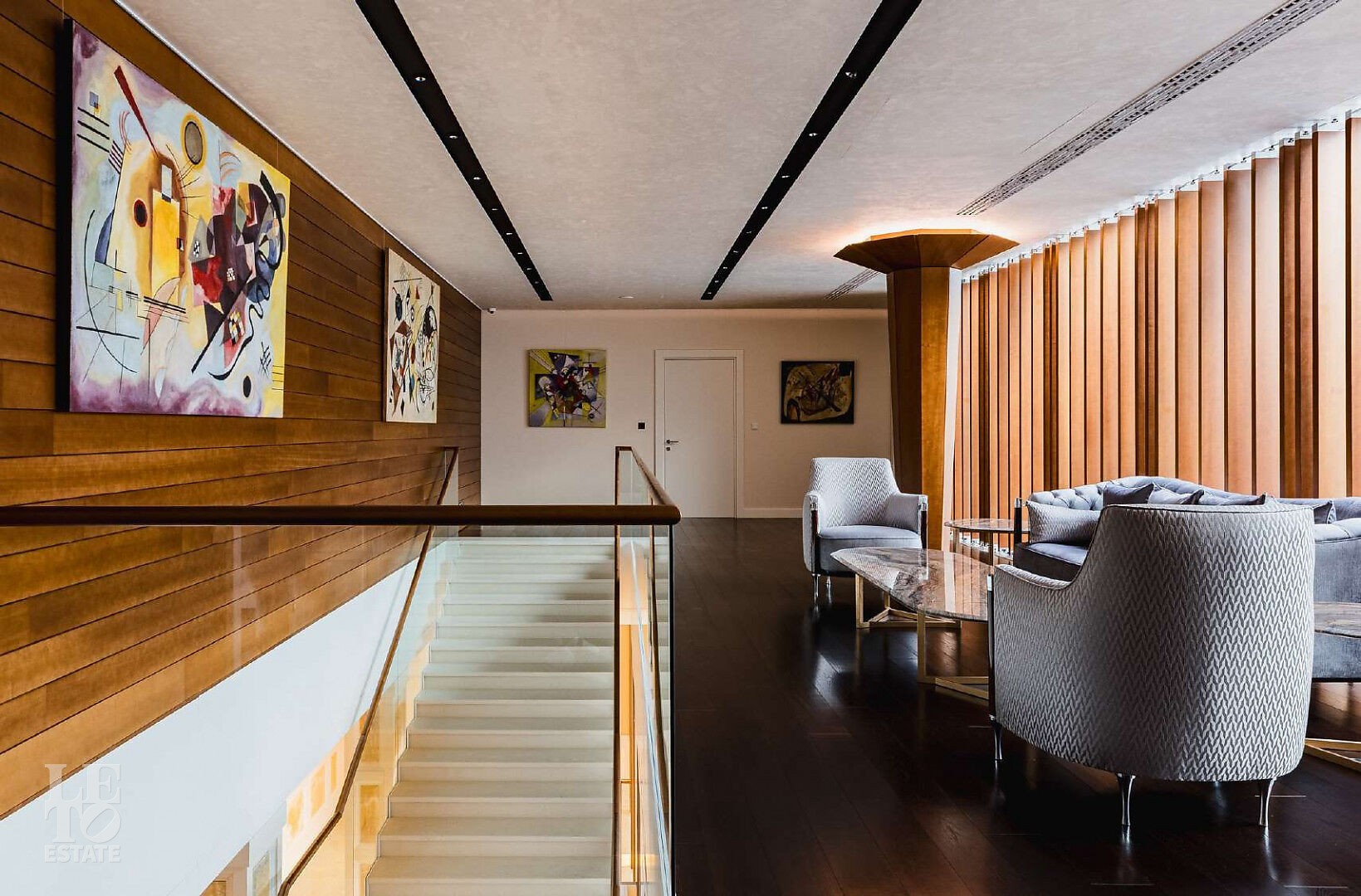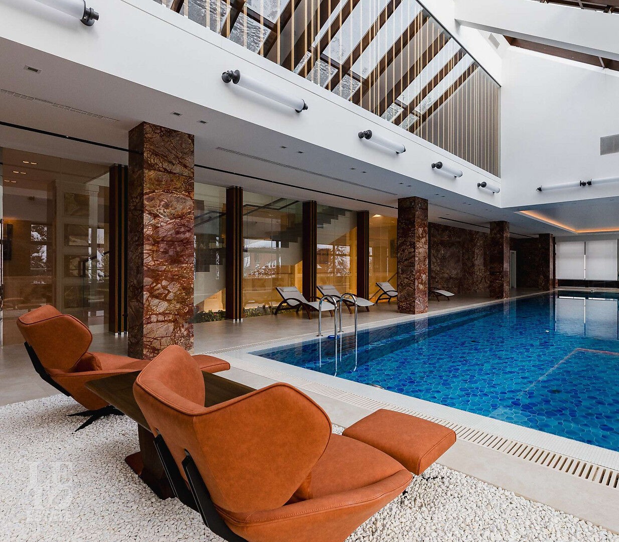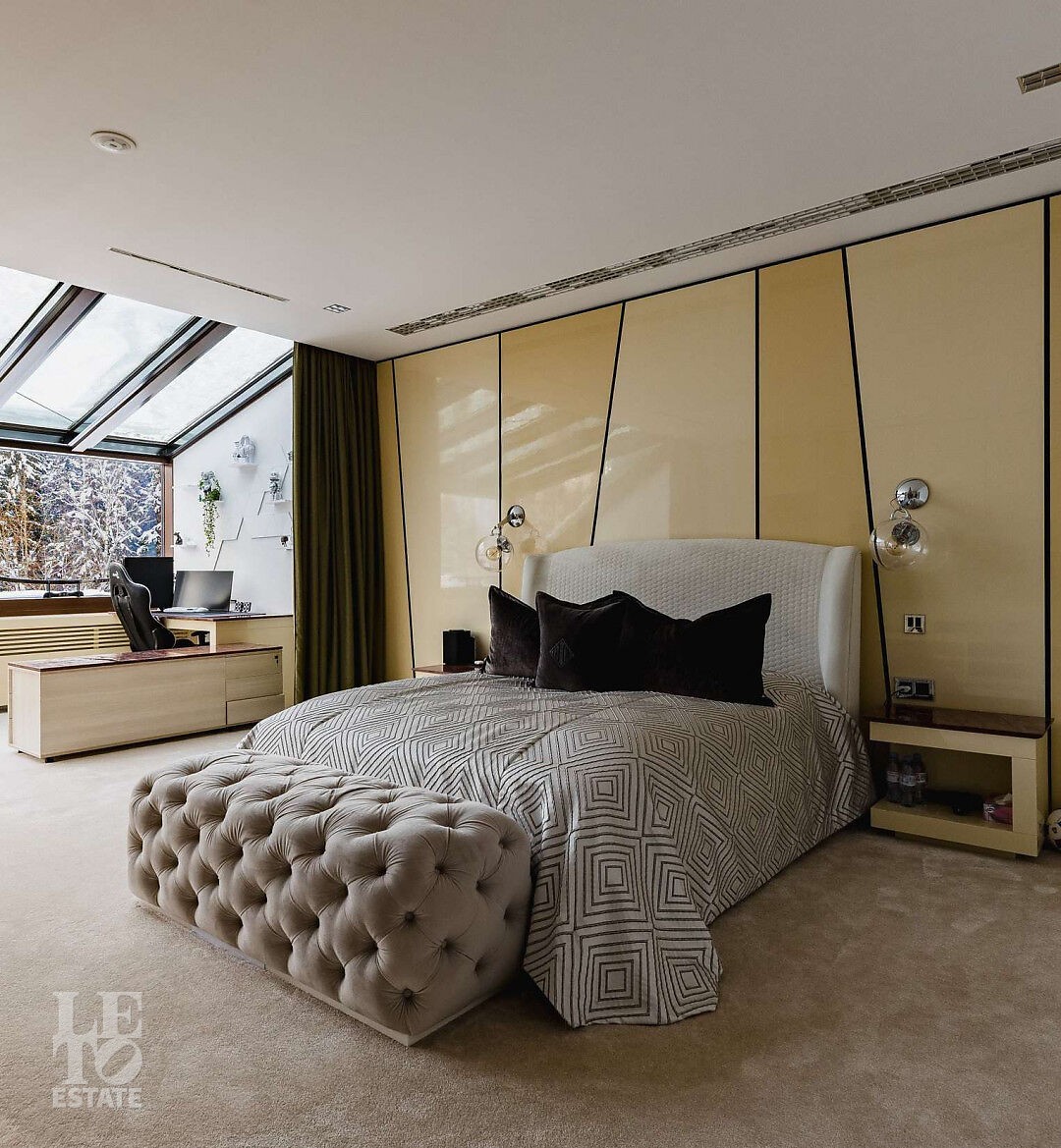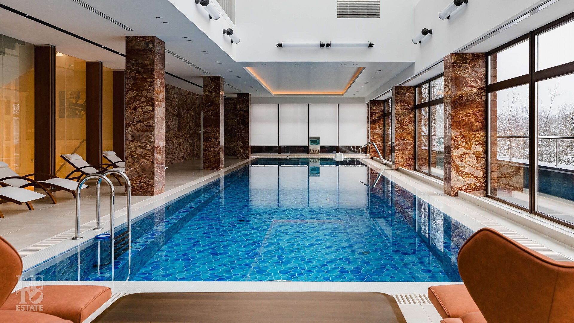 Второй этаж: мастер-спальня с 2 санузлами и 2 гардеробными, мастер-спальня с санузлом и гардеробной, бассейн 25×5 м, спортзал, массажная, сауна, хамам, мини-кухня, раздевалка, аквариумы с морской водой и настоящими кораллами, серверная.