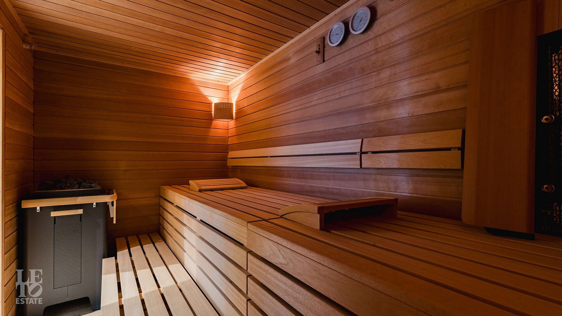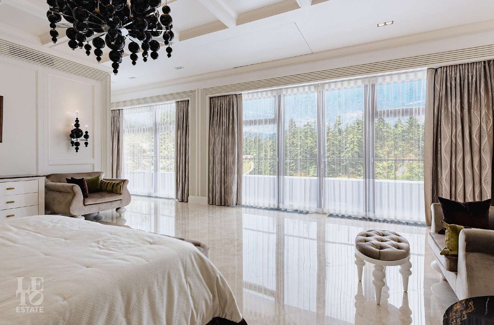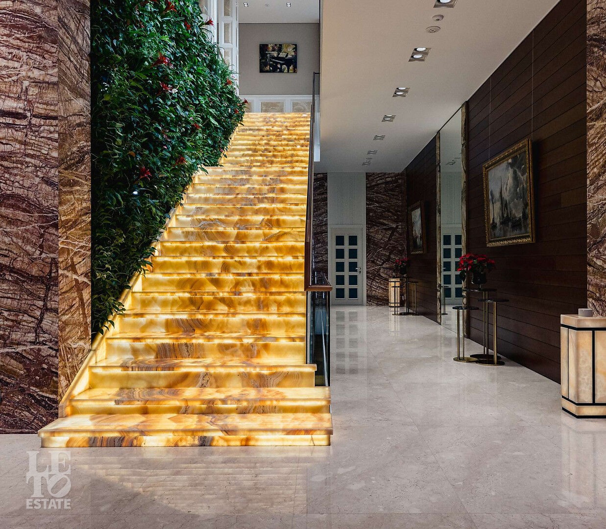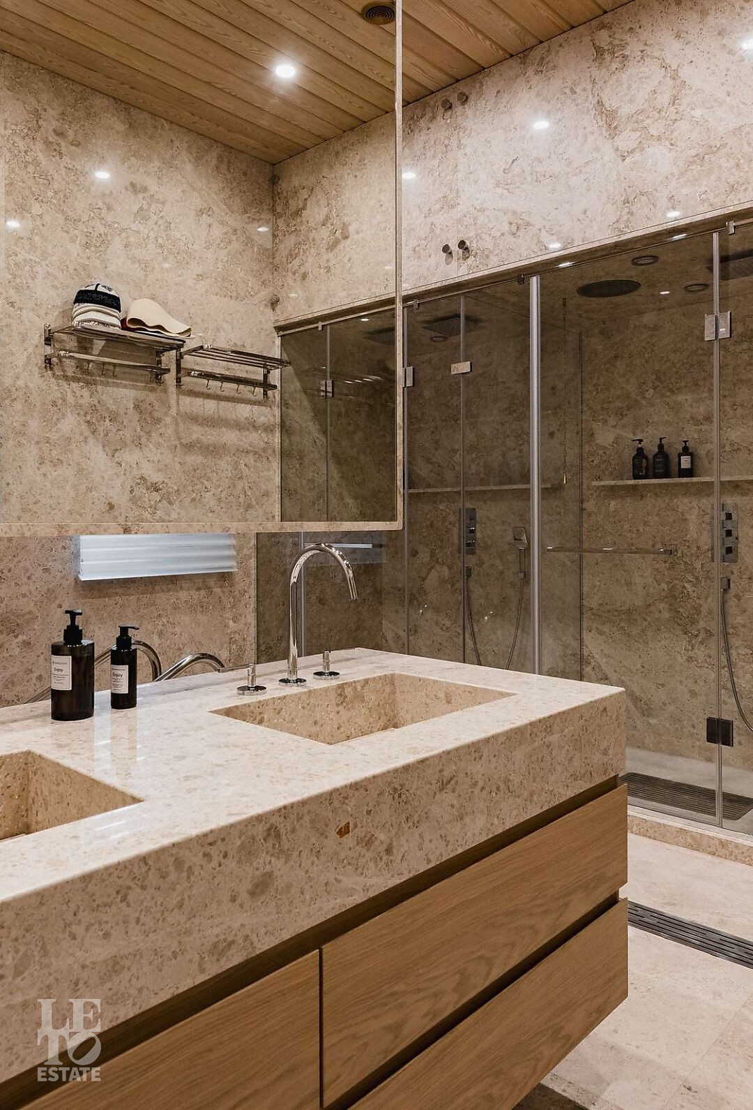 Второй этаж: мастер-спальня с 2 санузлами и 2 гардеробными, мастер-спальня с санузлом и гардеробной, бассейн 25×5 м, спортзал, массажная, сауна, хамам, мини-кухня, раздевалка, аквариумы с морской водой и настоящими кораллами, серверная.