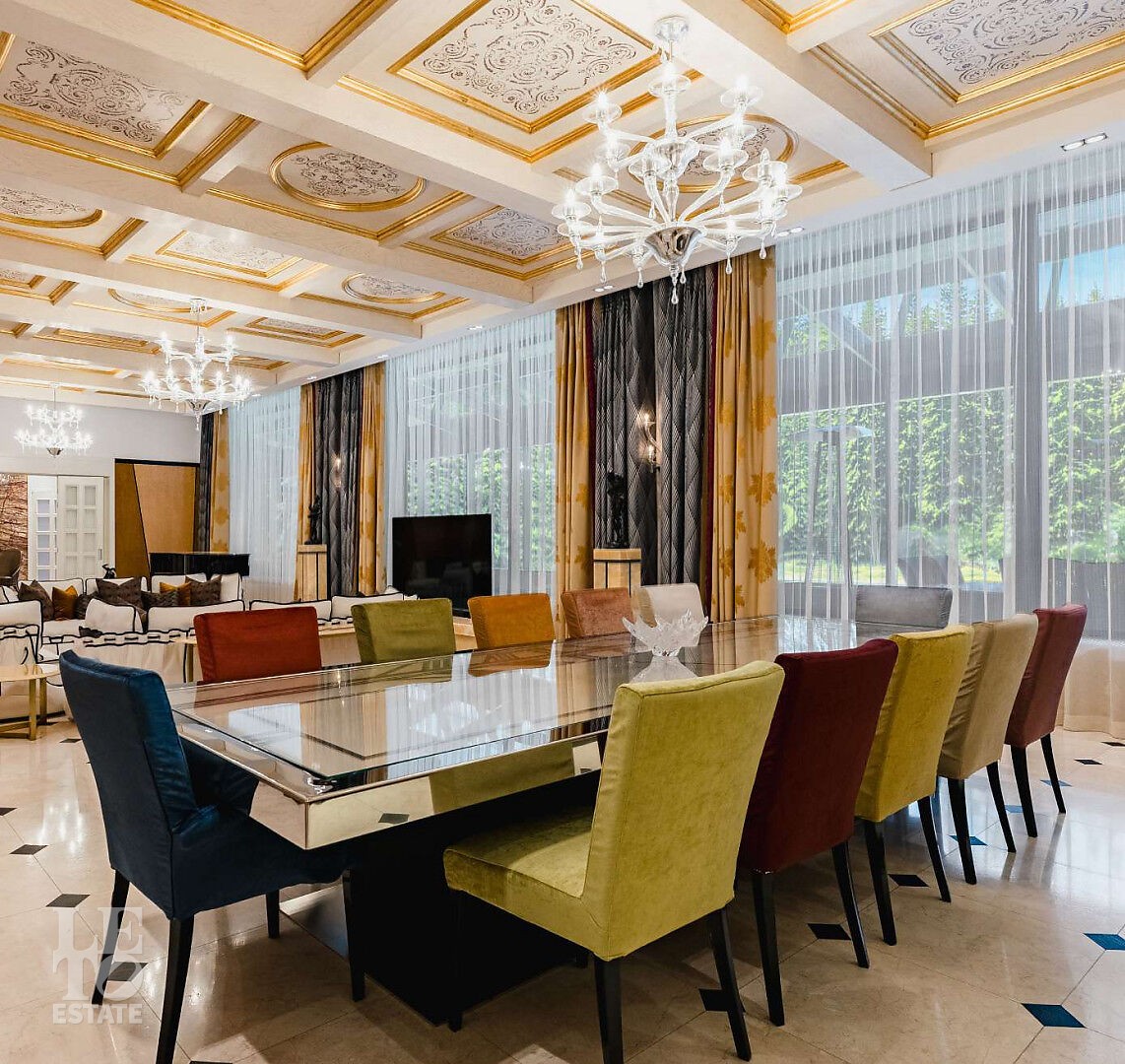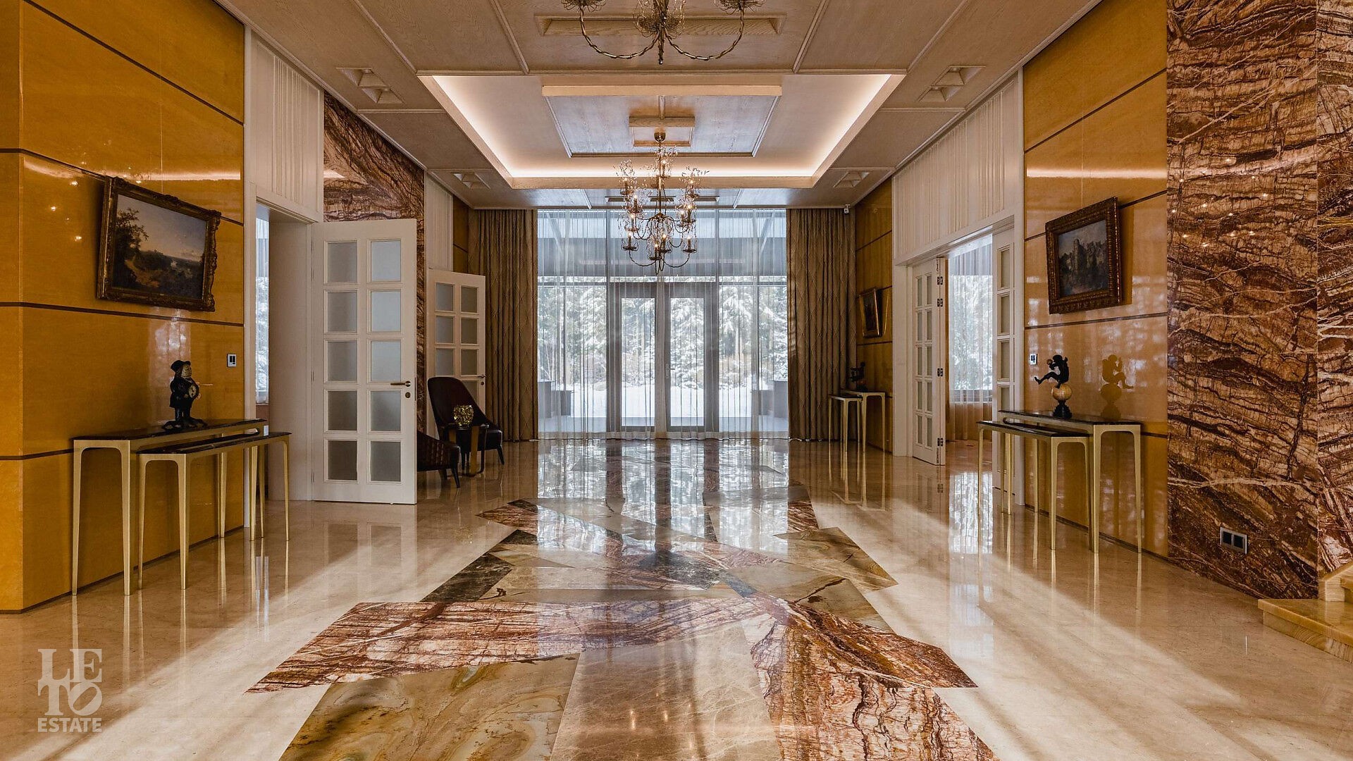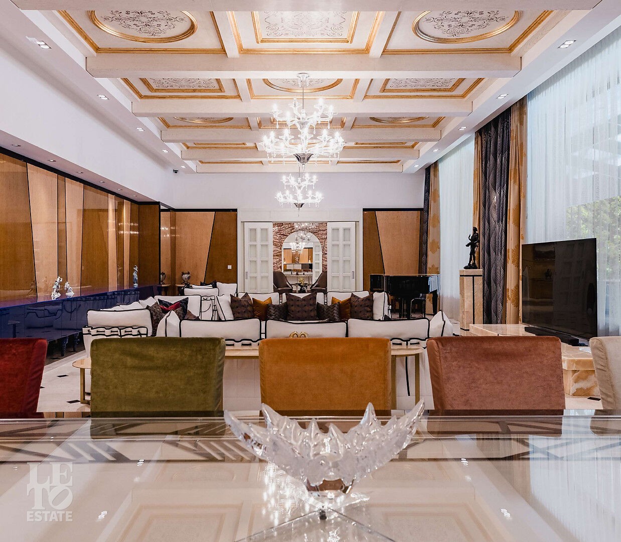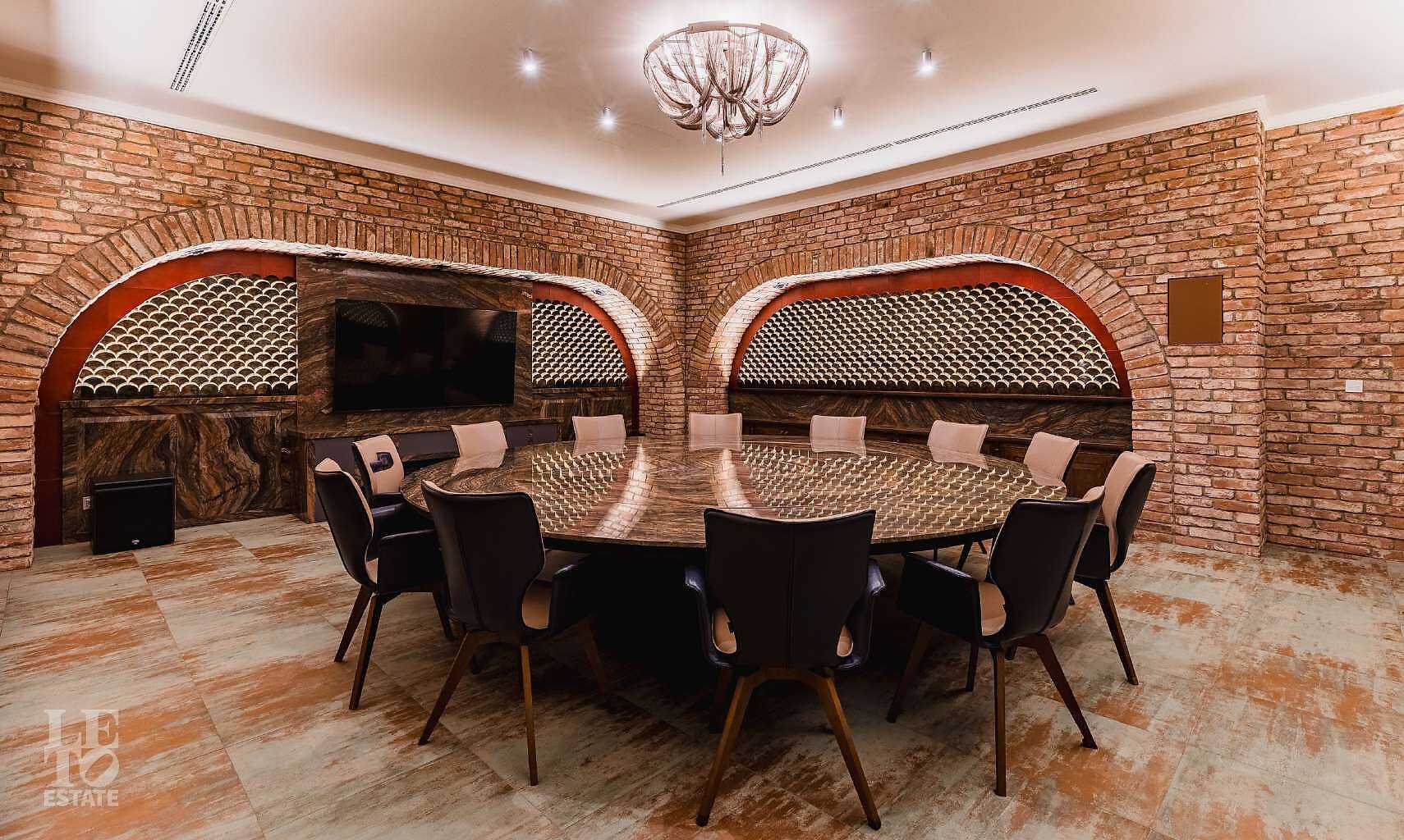 В основном доме имеется вся необходимая мебель и техника для комфортного проживания. Дизайн дома выполнен в стиле современной классики. Из особенностей, в доме имеется: боулинг, кинозал, тенисный корт, пруд с рыбками и винный погреб.