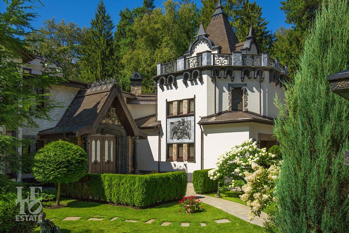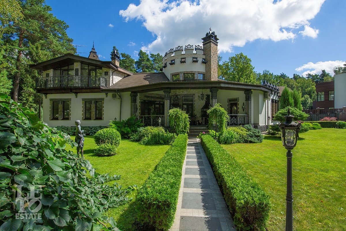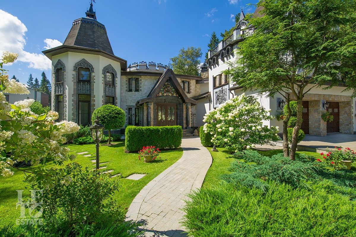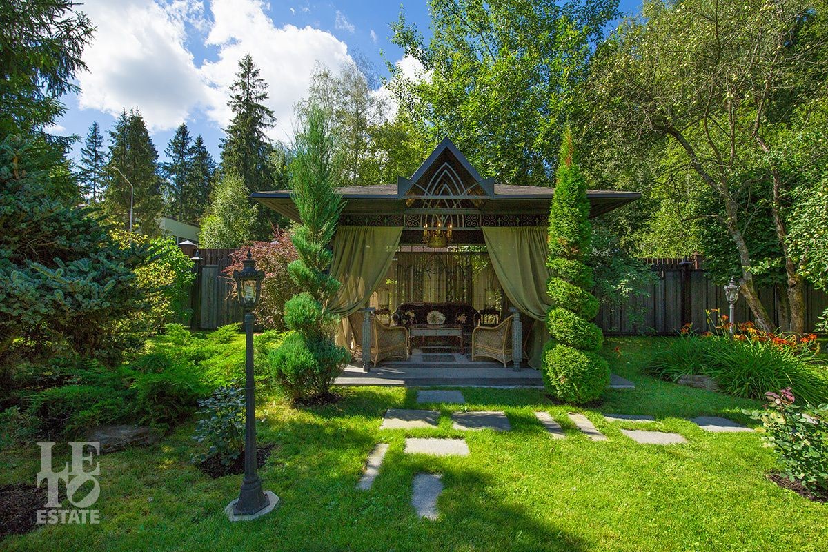 Особняк расположен на просторном лесном участке площадью 30 соток. Ухоженные живые изгороди, вековые сосны на заднем плане и изящные садовые скульптуры создают ощущение уединенного оазиса, где природа и архитектура сливаются в единое целое. Продуманный ландшафтный дизайн с вечерней подсветкой дополняет гармонию ансамбля. Многие элементы сада были привезены из разных уголков мира. Уютная беседка, утопающая в зелени, станет Вашим любимым местом для неспешных чаепитий и размышлений.