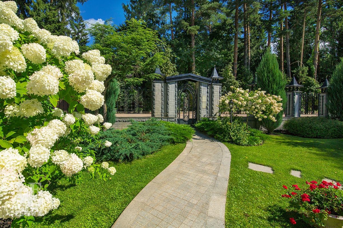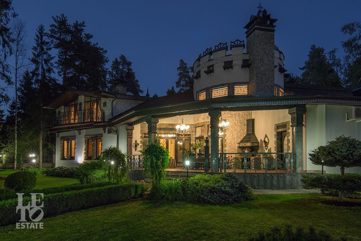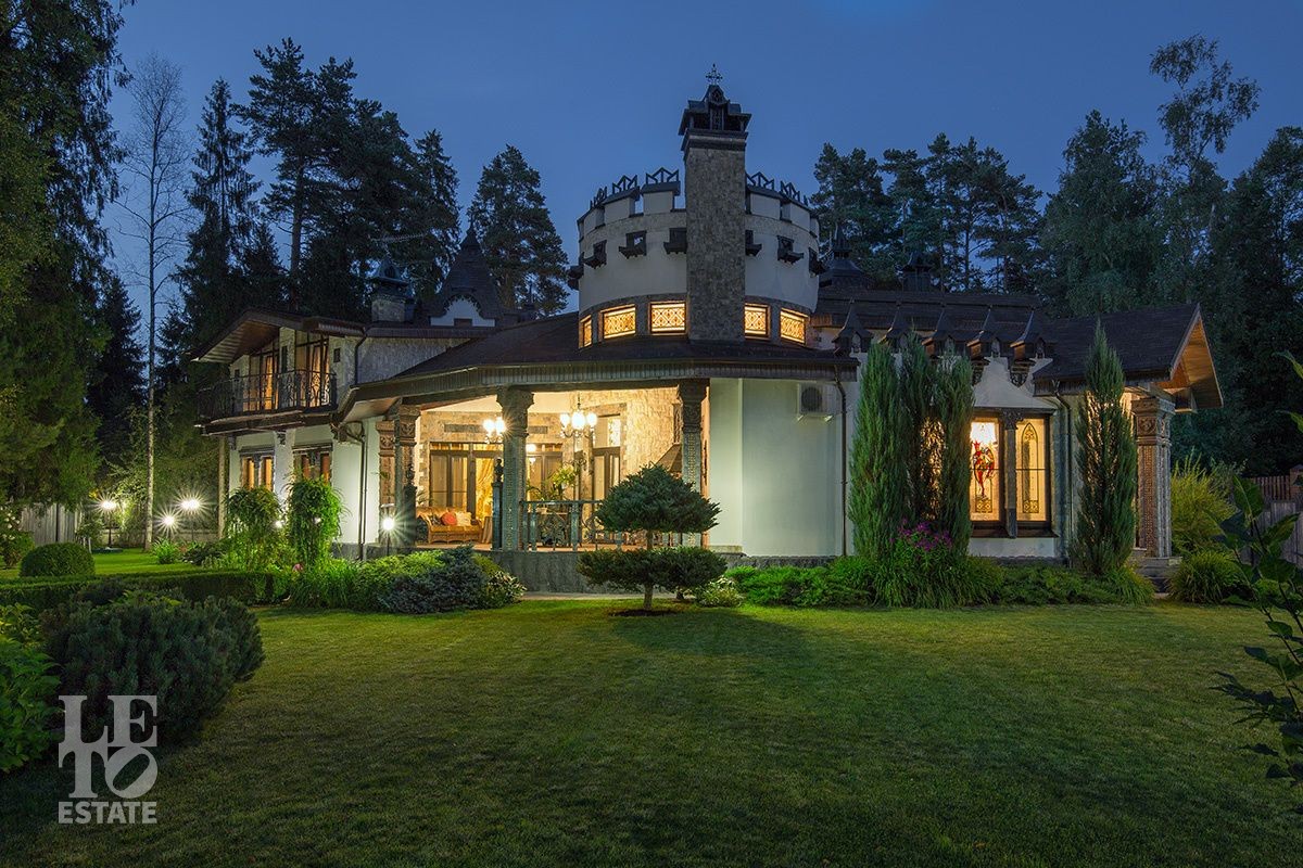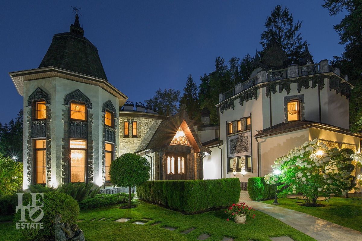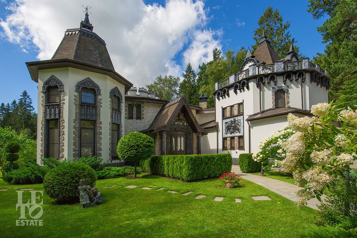 Особняк расположен на просторном лесном участке площадью 30 соток. Ухоженные живые изгороди, вековые сосны на заднем плане и изящные садовые скульптуры создают ощущение уединенного оазиса, где природа и архитектура сливаются в единое целое. Продуманный ландшафтный дизайн с вечерней подсветкой дополняет гармонию ансамбля. Многие элементы сада были привезены из разных уголков мира. Уютная беседка, утопающая в зелени, станет Вашим любимым местом для неспешных чаепитий и размышлений.