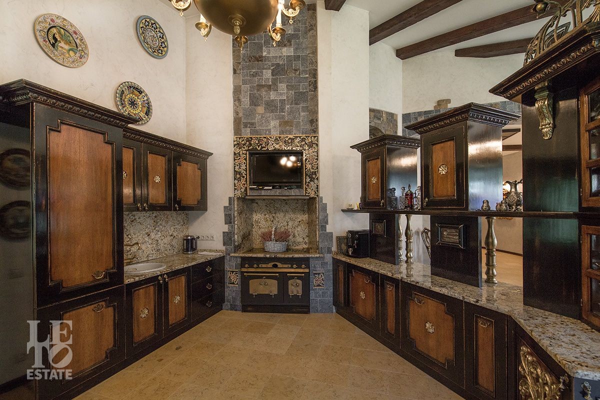 Прихожая, холл, гостиная со вторым светом, кухня-столовая с выходом на великолепную террасу с печью барбекю, гостевой санузел, кабинет, мастер-спальня с двумя гардеробными и двумя ванными комнатами (мужская и женская) и выходом на террасу, гараж на два автомобиля, постирочная, котельная с отдельным входом, блок для персонала с отдельным входом;