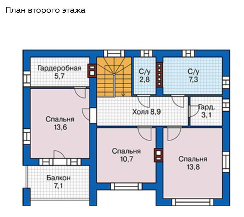 Второй этаж: Две спальни, гардеробная, мастер-спальня с гардеробной и выходом на балкон, два санузла.