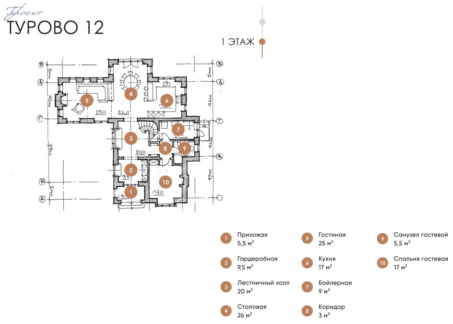 Первый этаж: прихожая, гардеробная, кухня, столовая, гостиная, спальня, с/у, бойлерная.