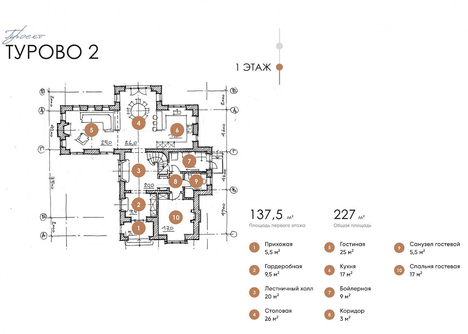 Первый этаж: прихожая, с/у, гардеробная, кухня, гостиная, столовая, гостевая спальня, бойлерная.
