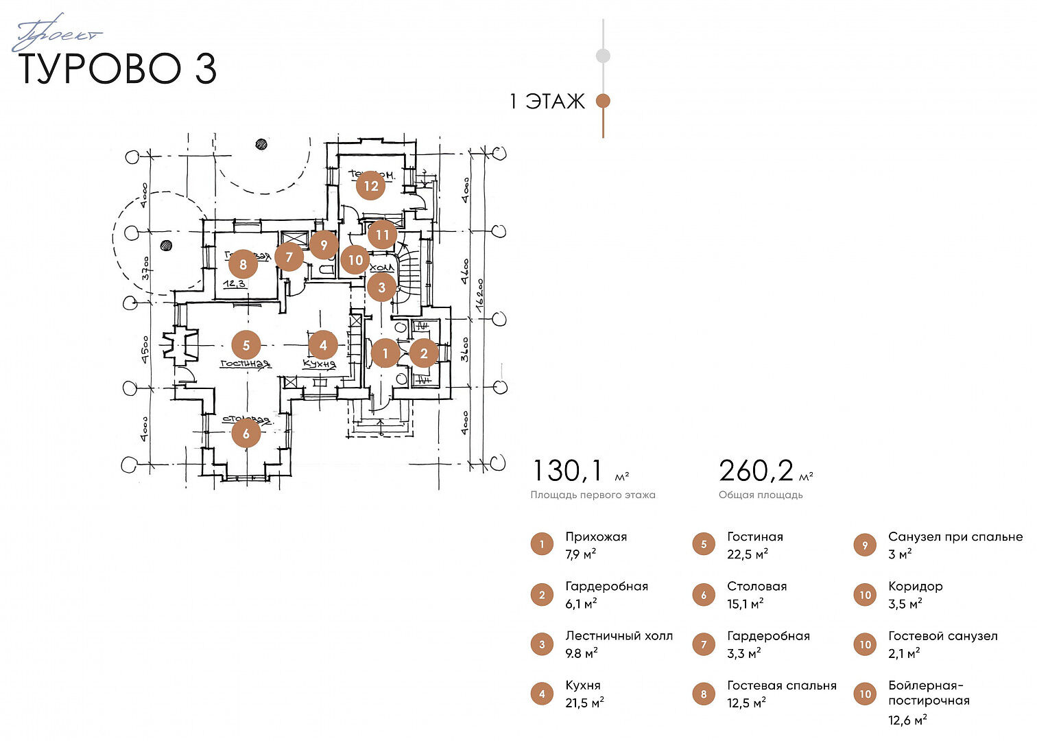 Первый этаж: прихожая, 2 гардеробные, кухня, гостиная, столовая, спальня с с/у, с/у, бойлерная-постирочная.