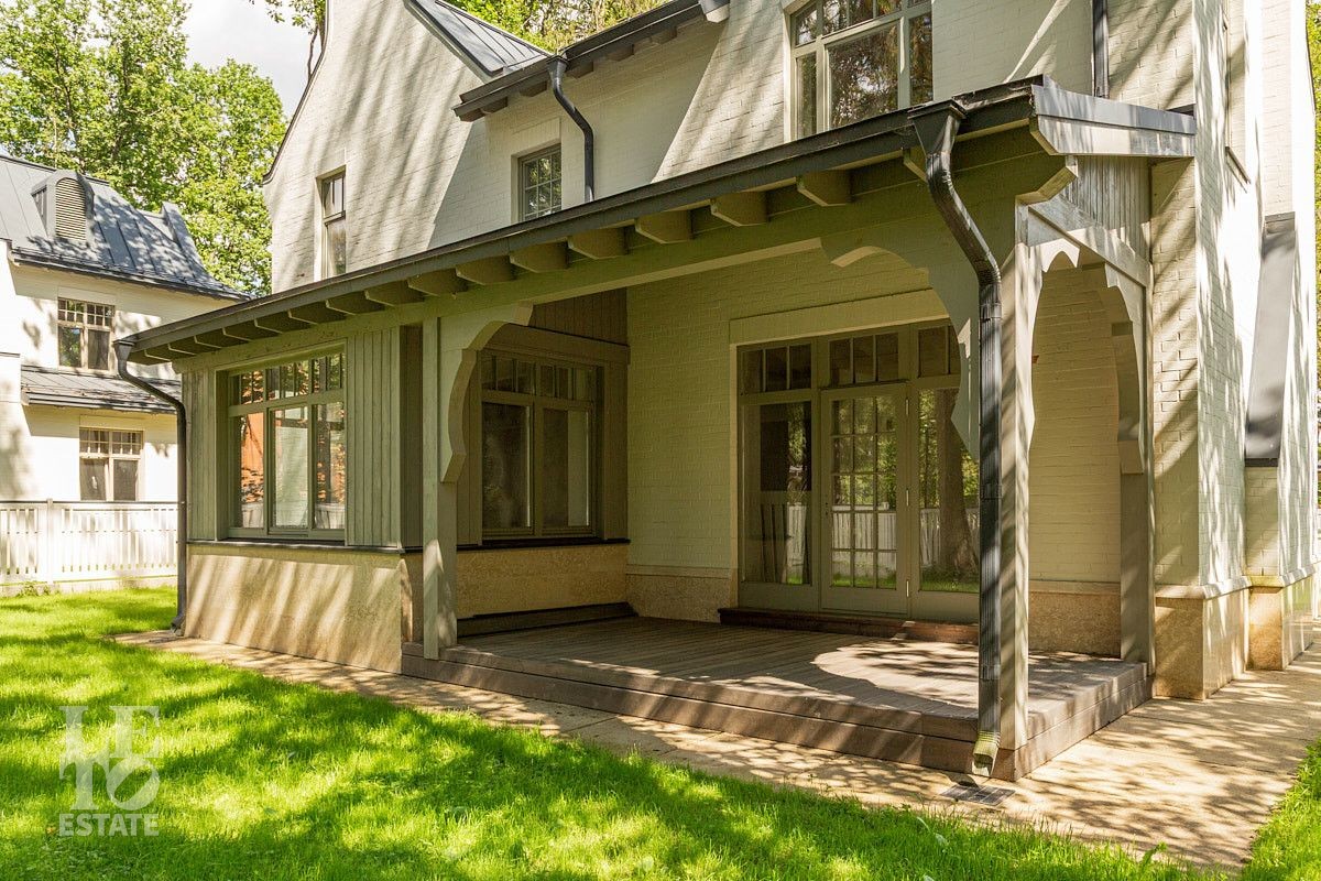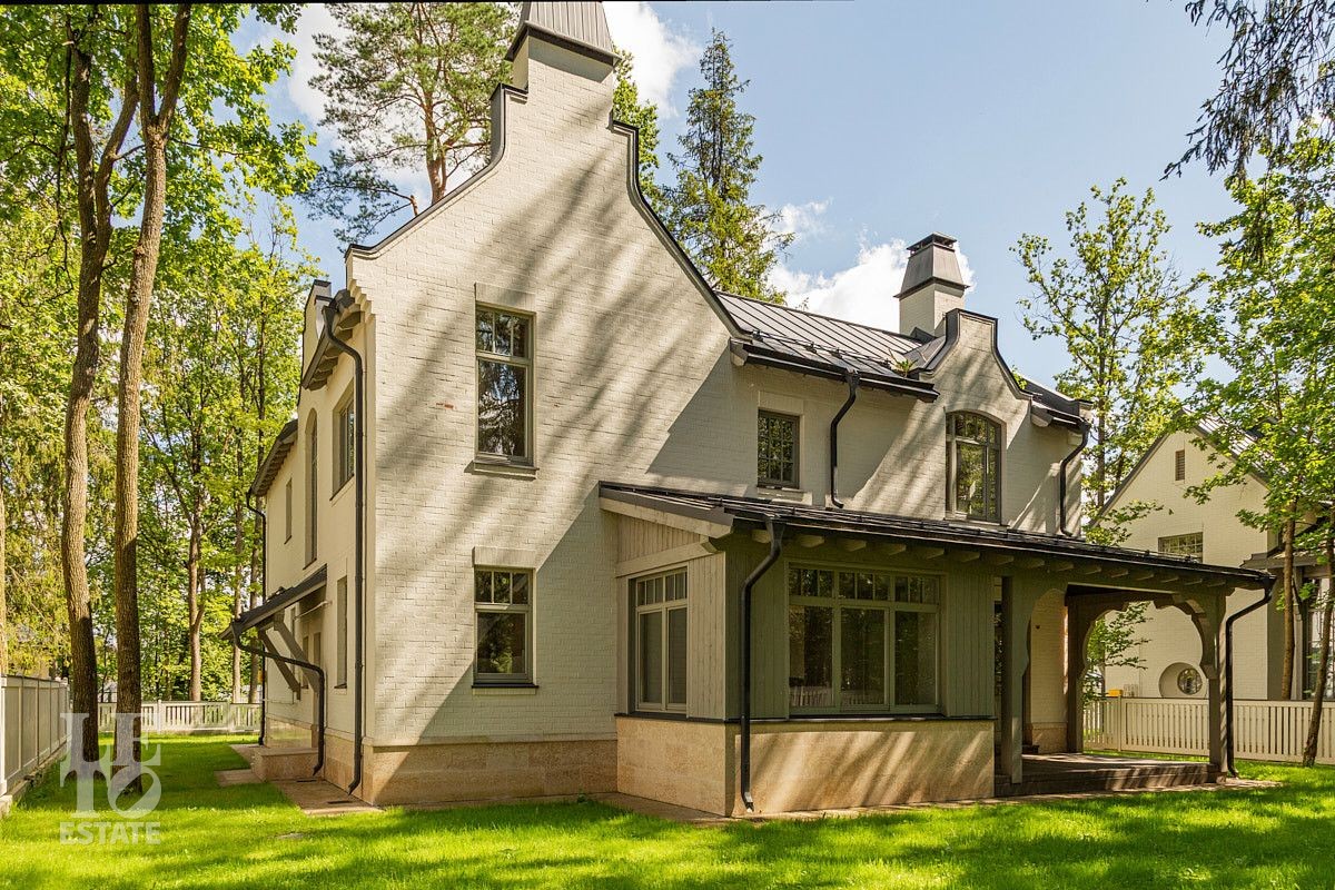 Дом сочетает элегантность традиционного стиля и высокое качество строительных материалов. Стены возведены из кирпича, цоколь, терраса, крыльцо, дорожки выполнены из травертина, крыша- фальцевая кровля, все двери и стеклопакеты в доме- из натурального дерева.