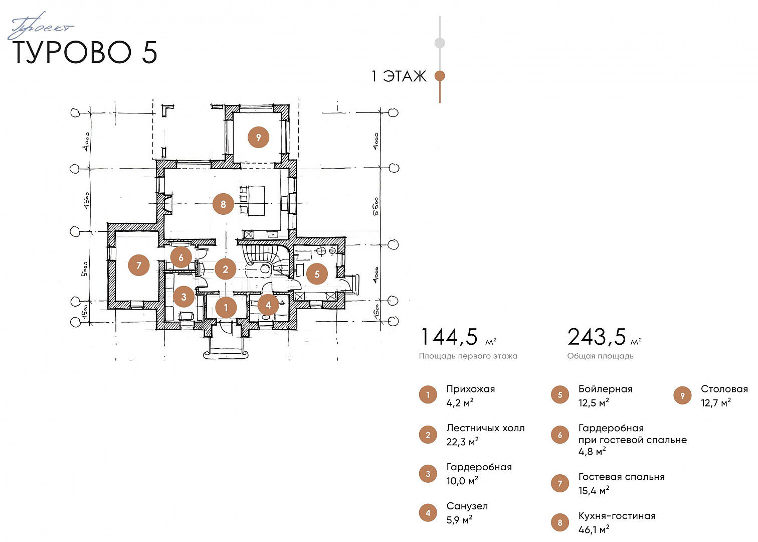 Первый этаж: прихожая, гардеробная, кухня-гостиная, столовая, спальня с гардеробной, с/у, бойлерная.