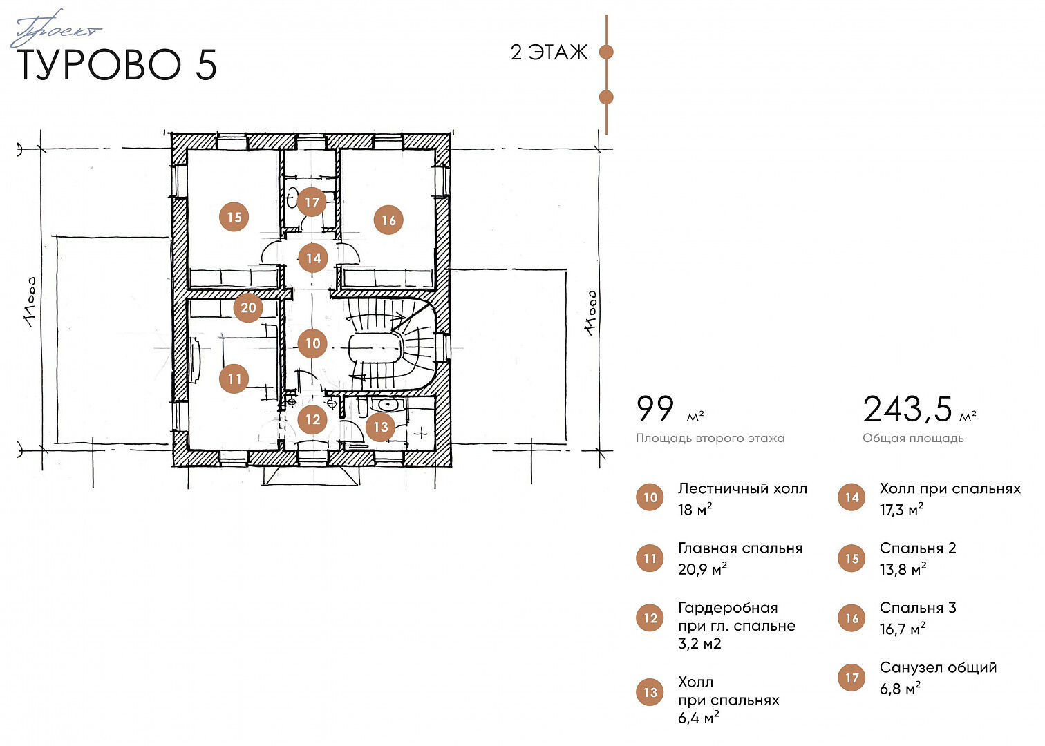 Второй этаж: мастер-спальня с гардеробной, 2 спальни, с/у.