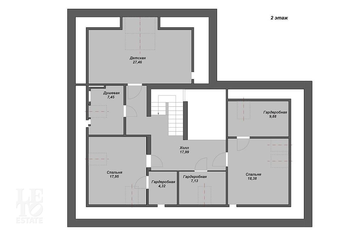 Второй этаж: холл, детская комната, с/у с душевой, 2 спальни с гардеробными.