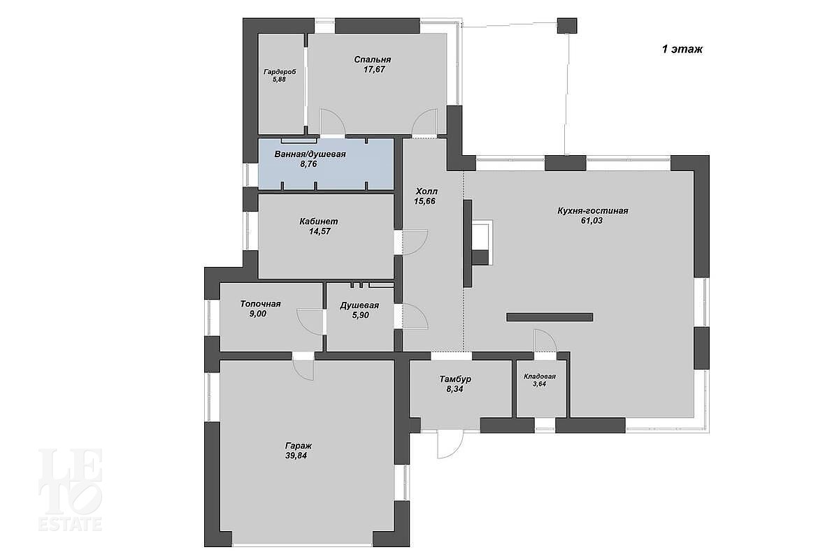 Первый этаж: прихожая, холл, с/у с душевой, кухня с кладовой, гостиная с камином и выходом на террасу, котельная, спальня с гардеробом и с/у, кабинет, гараж на 2 м/м.