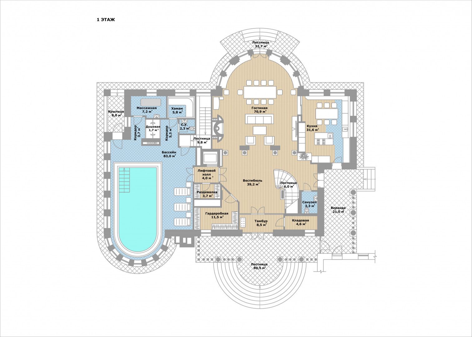 первый этаж: прихожая, парадный холл с гардеробной, просторная гостиная с каминной зоной и выходом на участок, кухня-столовая, гостевой санузел, лифт, спа-комплекс с бассейном, массажный кабинет, хаммам с душевой, комната для переодевания и санузел